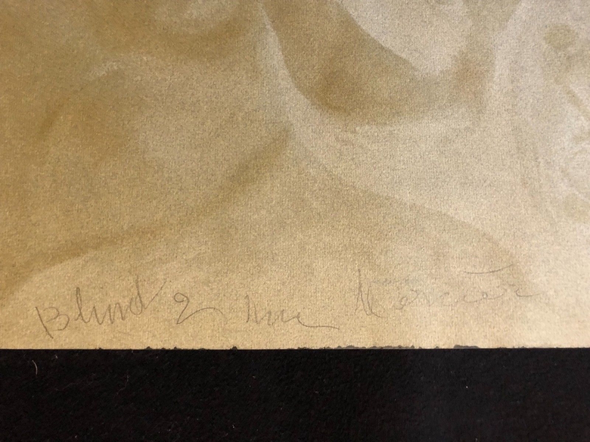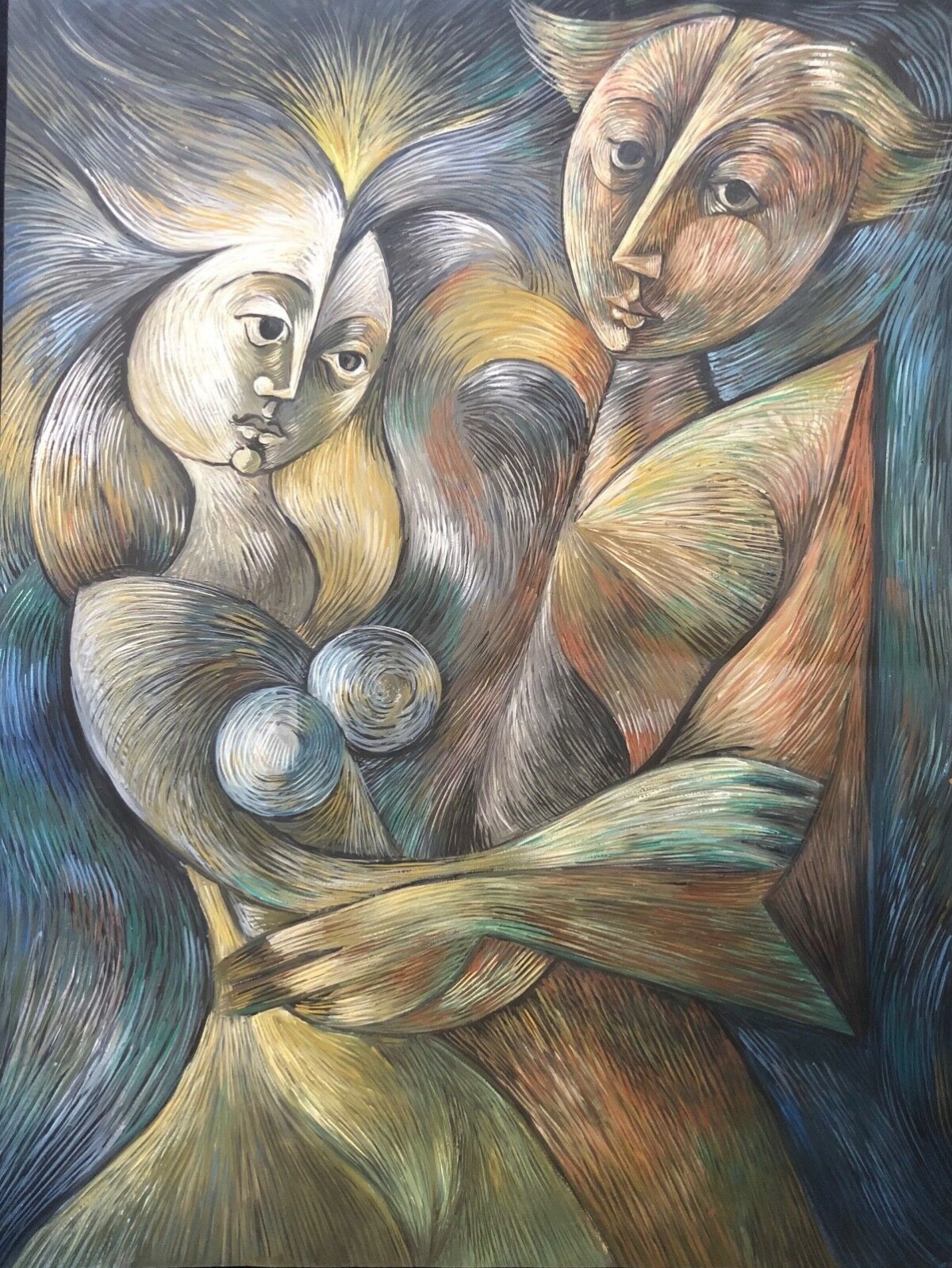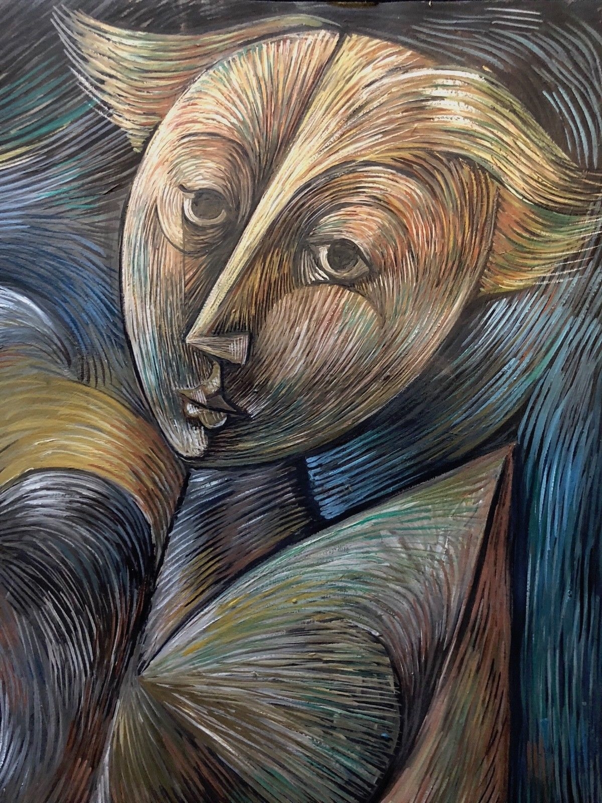 Artculture6 vous propose cette sublime peinture sur papier épais. Anonyme (car cadeau amical). Du superbe à identifier , 64,8 cm par 49 cm. Un très gros travail de lignes et de jeux de couleurs !