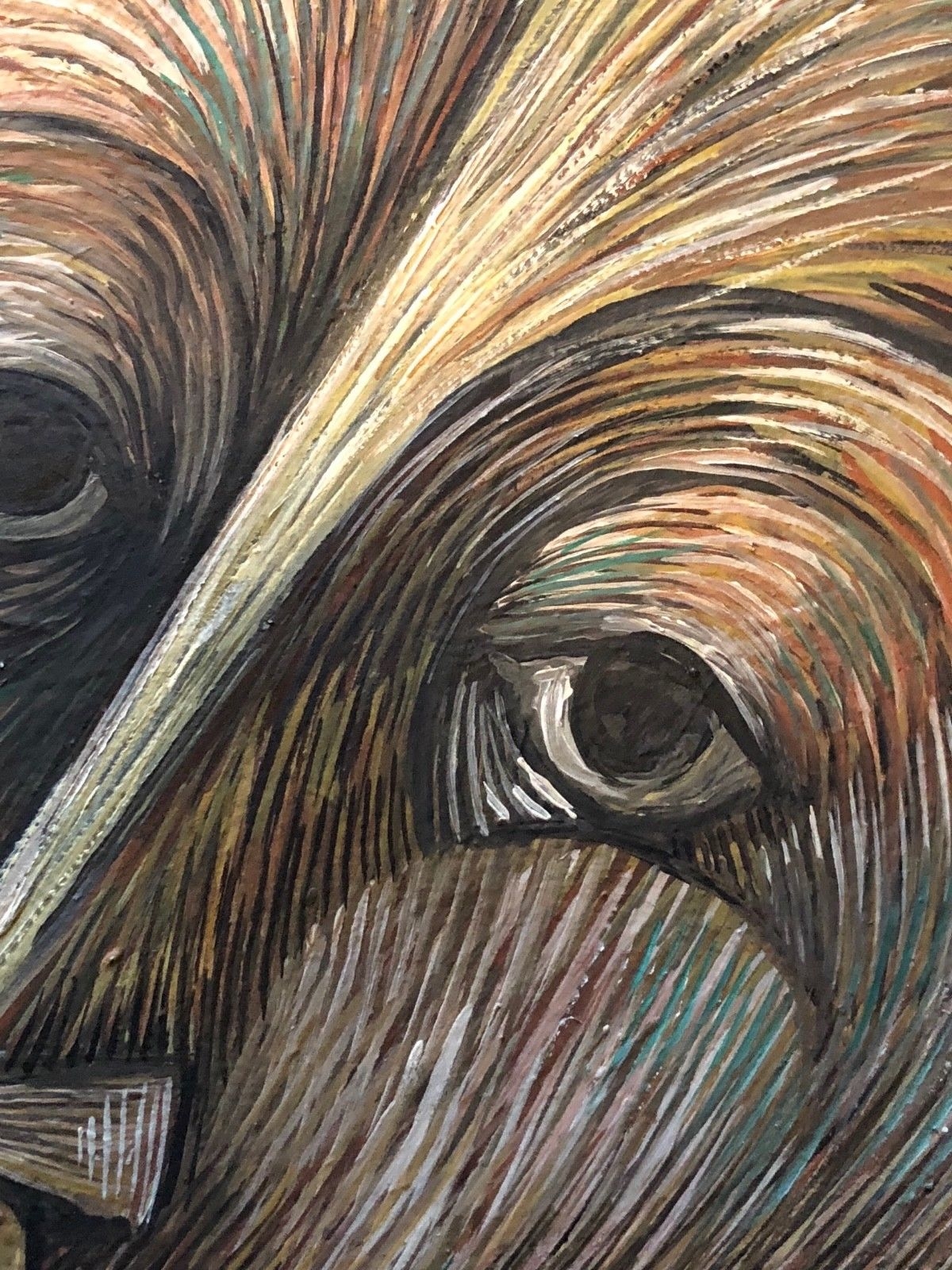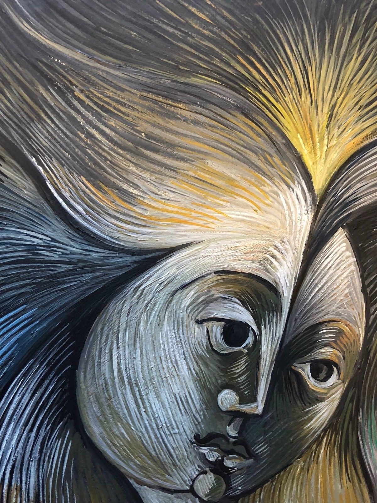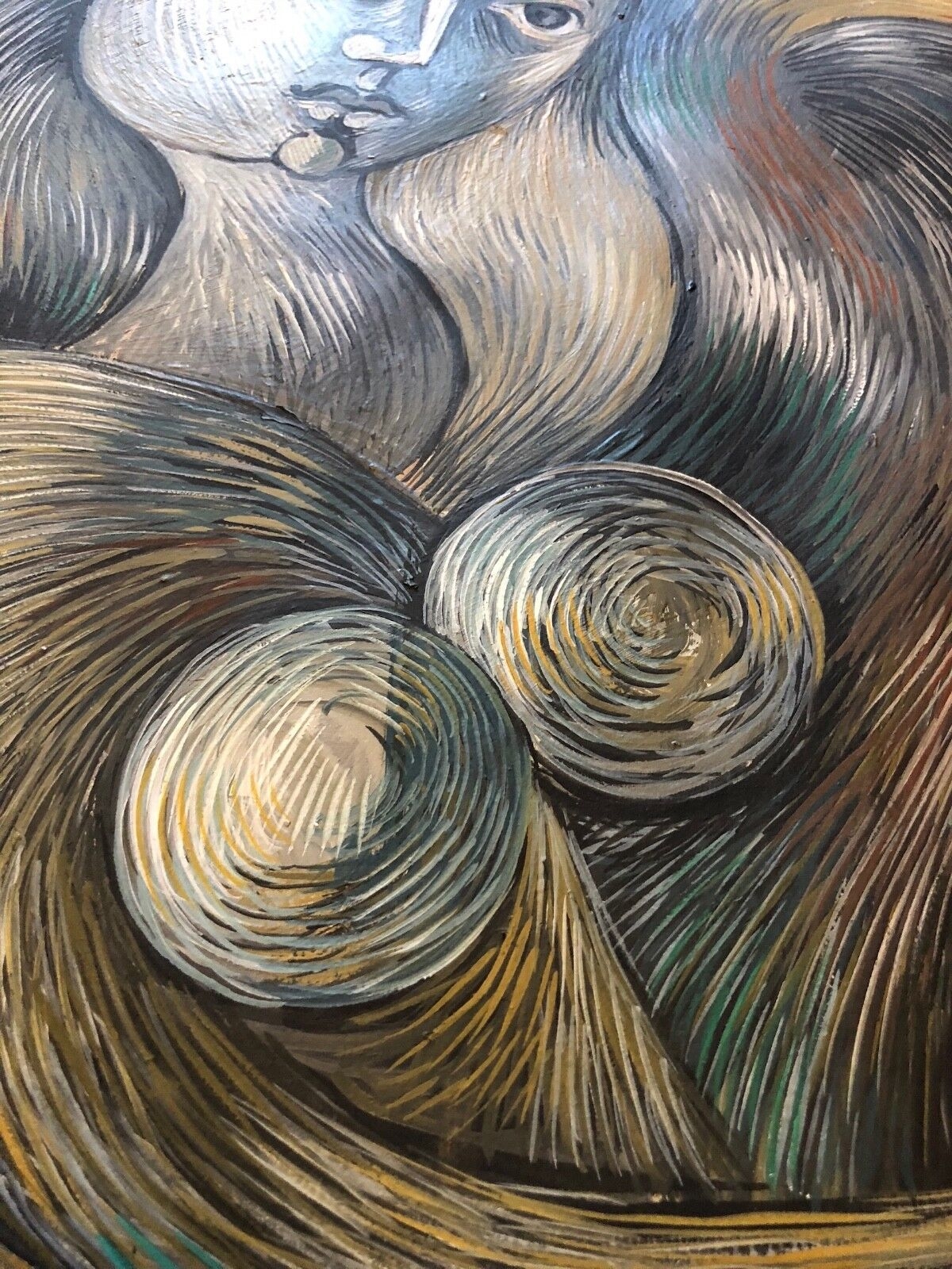Artculture6 vous propose cette sublime peinture sur papier épais. Anonyme (car cadeau amical). Du superbe à identifier , 64,8 cm par 49 cm. Un très gros travail de lignes et de jeux de couleurs !
