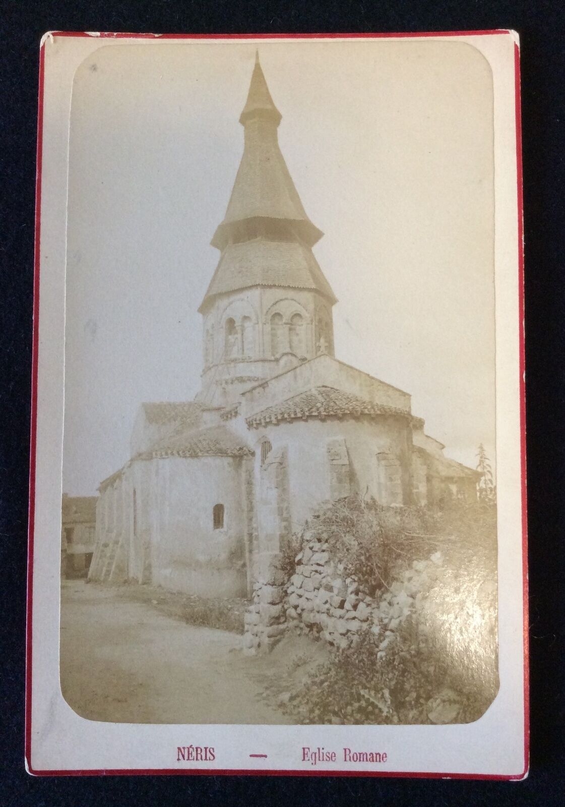 Artculture6 vous propose cette photographie de l'église Saint-Georges de Néris-les-Bains, dans l'Allier. Cliché circa 1880. Dimensions du carton: 16,9cm x 10,8cm environ Dimensions du cliché: 15cm x 9,5cm environ Export and grouped consignment are available for all countries. a