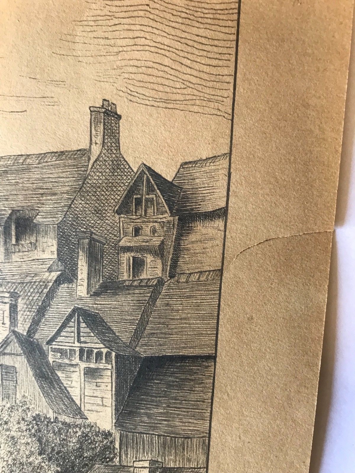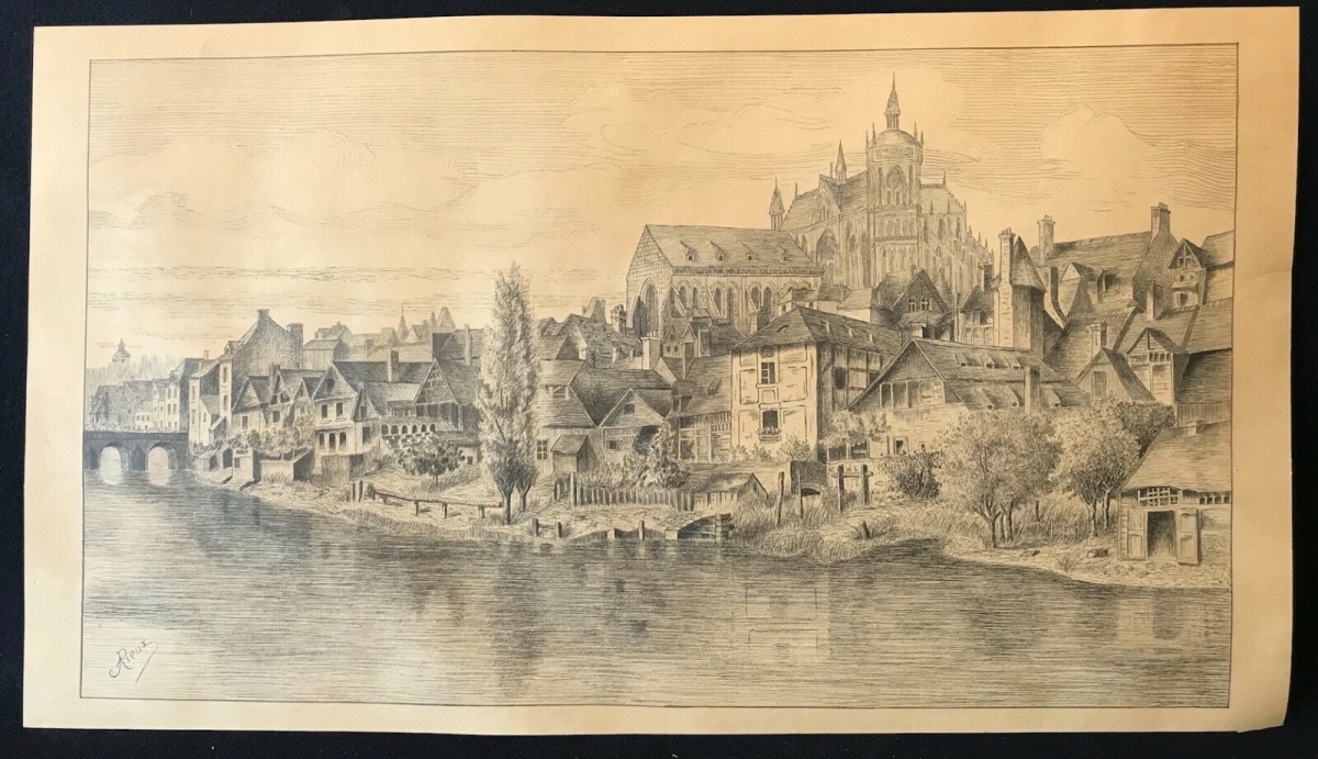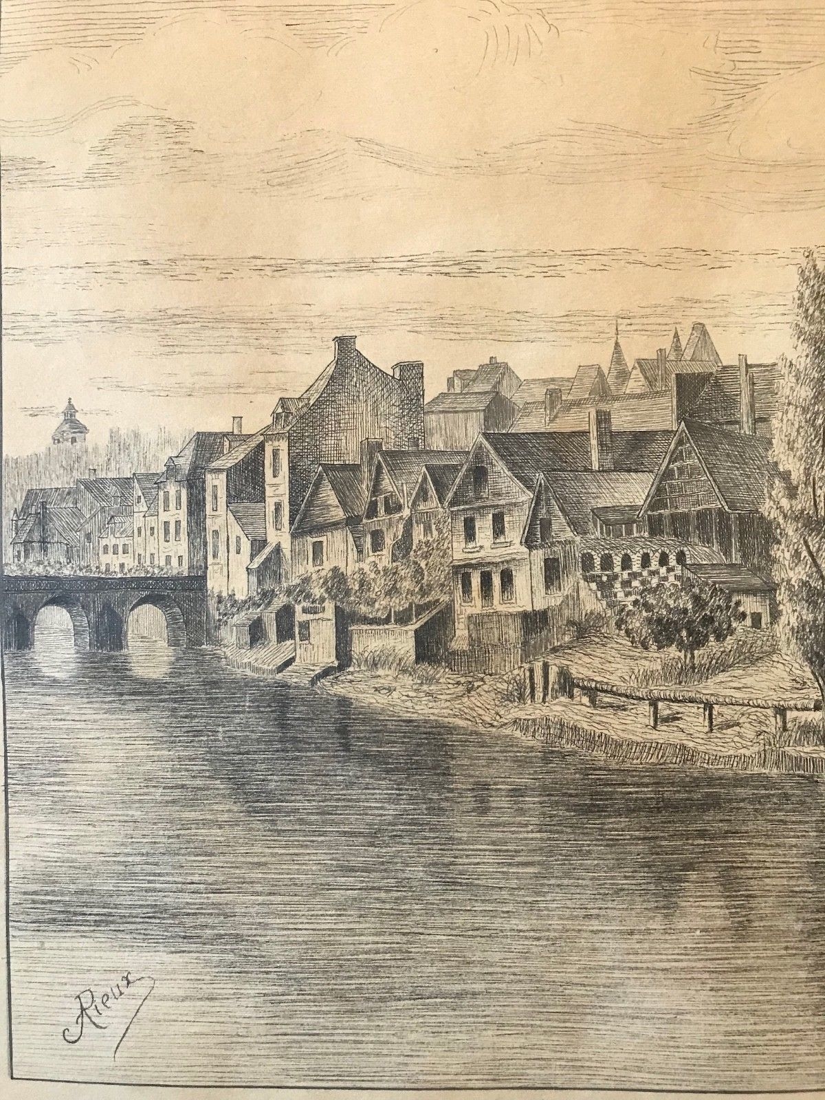 Je vous propose cet exceptionnel dessin. Nous avons là une pièce de très grande qualité signée A Rieux ? Les détails nous montrent une ville du Nord de la France qui a due être entièrement changée et donc est très difficile à identifier? L'intérêt historique de l'oeuvre ne fait aucun doute et il serait bon qu'elle rejoigne le fond patrimoniale de cette citée, mais laquelle ? Si un érudit a la réponse on pourra la sauver ! La feuille fait 51 cm par 28,8 cm, le dessin seul 46 cm par 26 cm. Pour la dater, je dirais entre 1830 et 1840. Attention, ce dessin est sur du papier colophane très ancien en phase de désintégration. Il doit être manipulé que par un restaurateur compétent pour pouvoir être sauvé par un marouflage savant. L'avant dernière photo montre ce qui arriverait si quelqu'un non spécialiste la manipulait sans précaution. Nous considérons aussi cette pièce comme un témoignage patrimonial et ne la livrerons donc qu'en France avec un emballage en fonction.