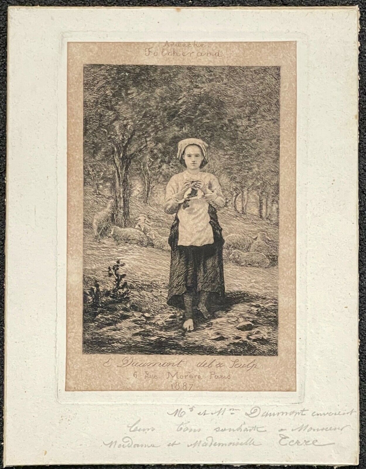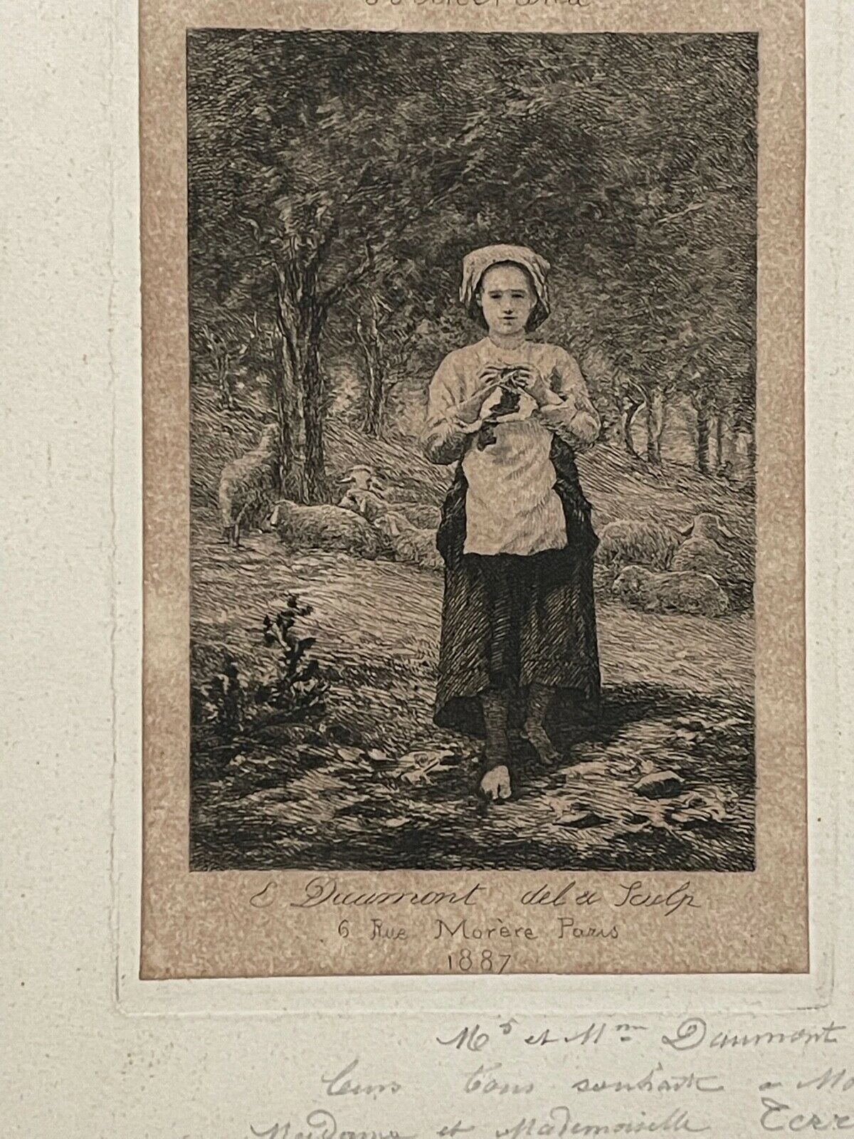 Je vous propose cette gravure en pointe sèche de 1887 par Émile Daumont (1834-1921). Gravure avec envoi de l'artiste. Gravure marouflée sur carton 14,2 par 10,8 cm. La feuille de la gravure seule fait 10,8 cm par 7,1 cm. La gravure seule fait 9 cm par 6 cm. Une très très grande rareté. Superbe !