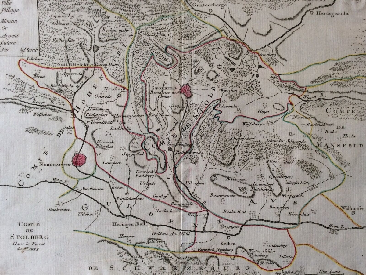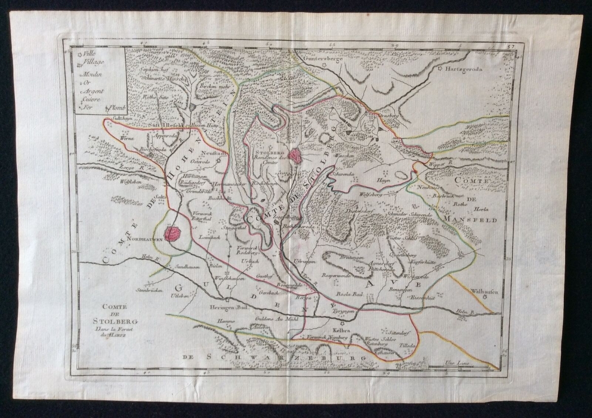 Je vous propose cette rare carte en gravure sur cuivre du comté de Stolberg dans la forêt du Harz - eau-forte sur cuivre 34,2x24 cm (double page, pli central) sur papier chiffon de lin vergé 9-11mi . Anonyme CIRCA 1787. Coup de planche 28,1cm par 24,1m. Superbe !