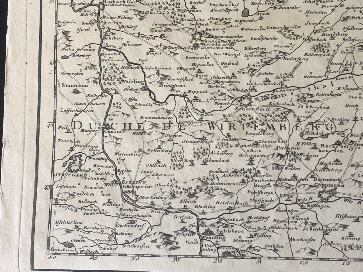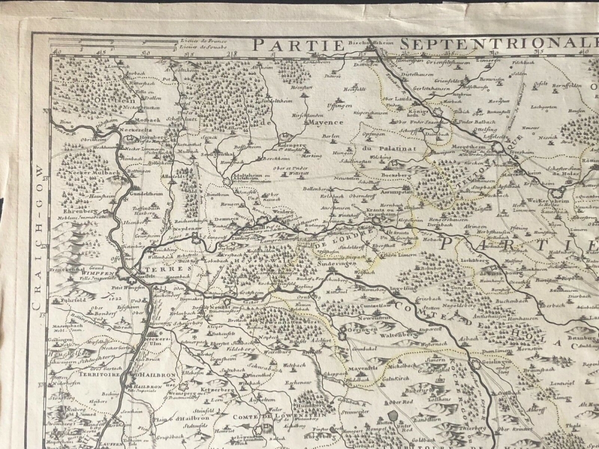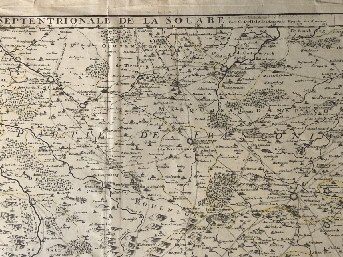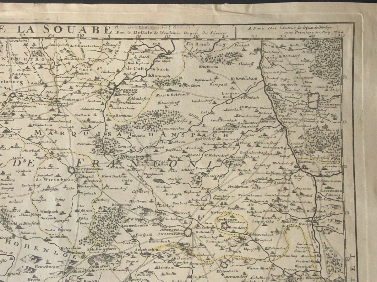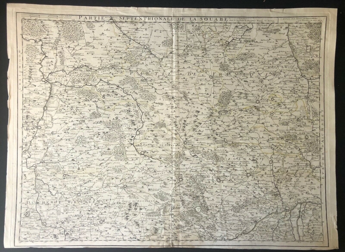 Guillaume de l'Isle XVIII Partie septentrionale de la Souabe Schwaben Allemagne. À Paris chez l'auteur fur le quai de l'horloge avec privilège du Roy. 1704. 68 cm par 50 cm. Papier vergé filigrané collier avec croix. Des petites amorces de déchirure dans les marges.