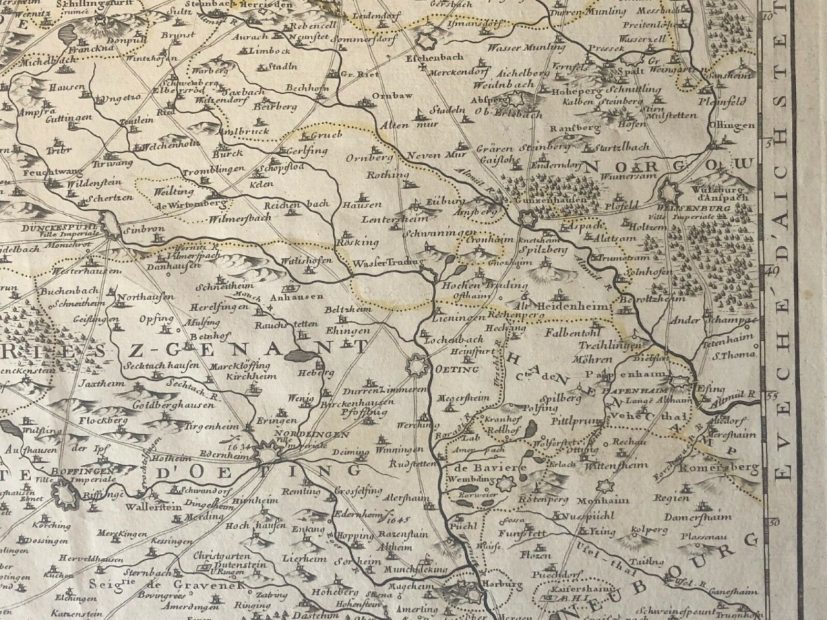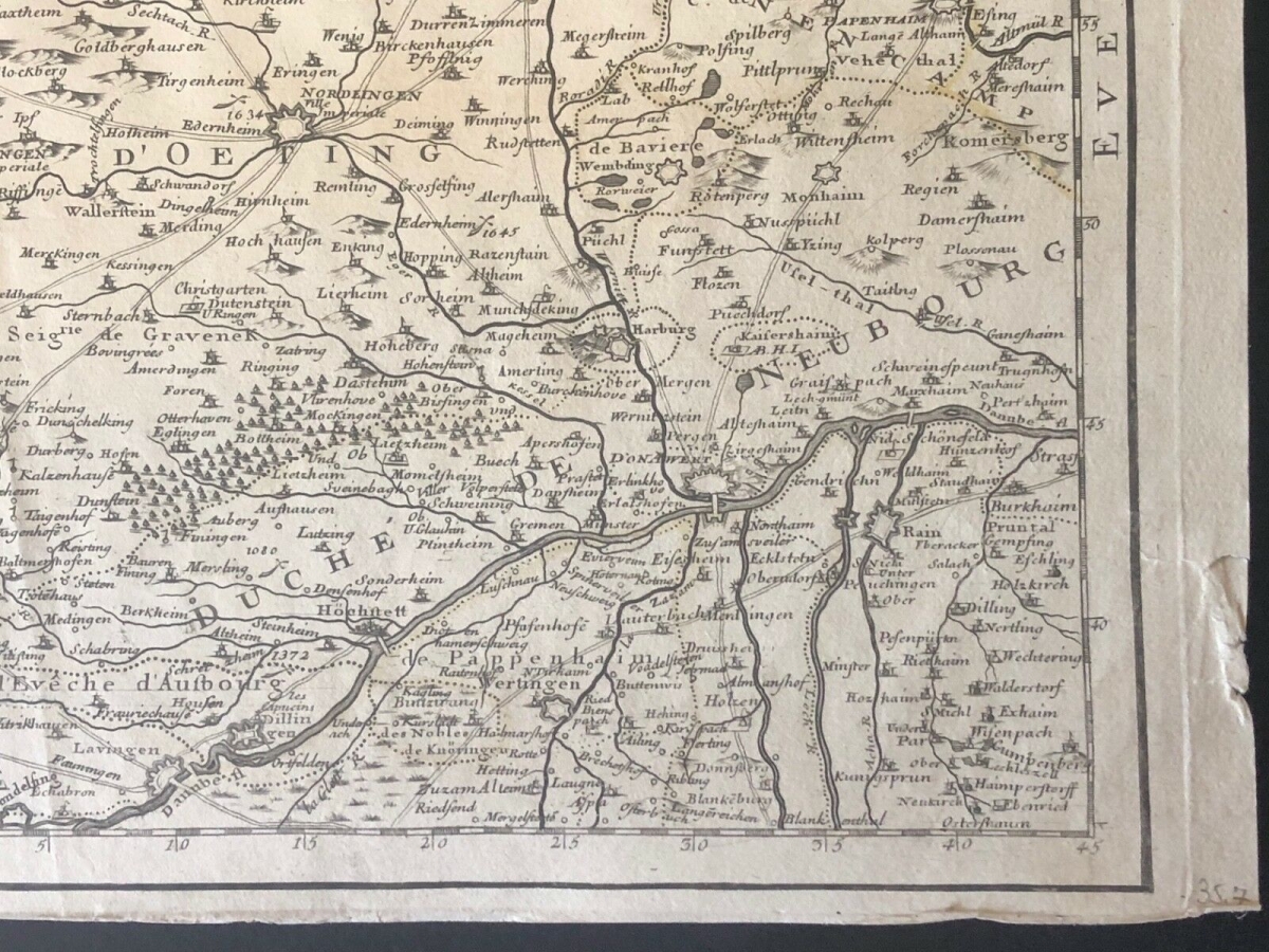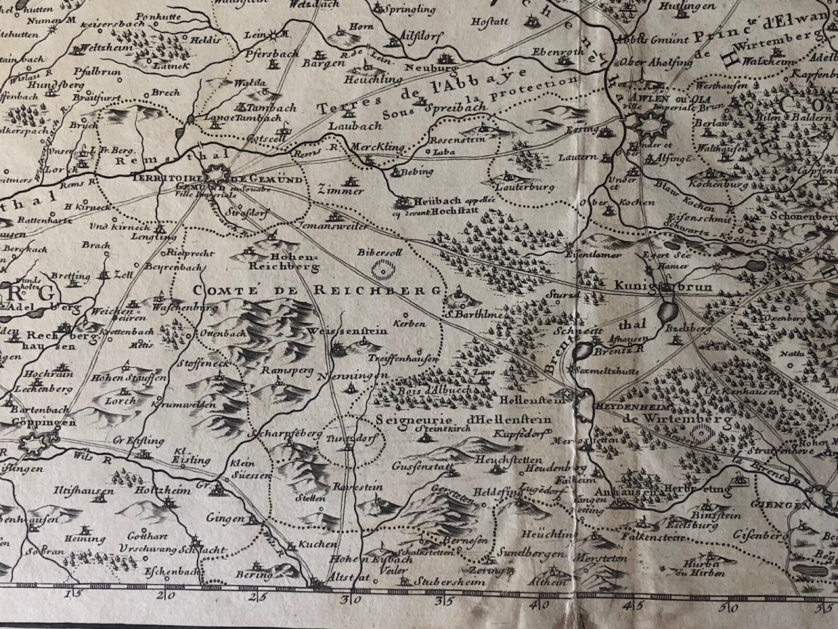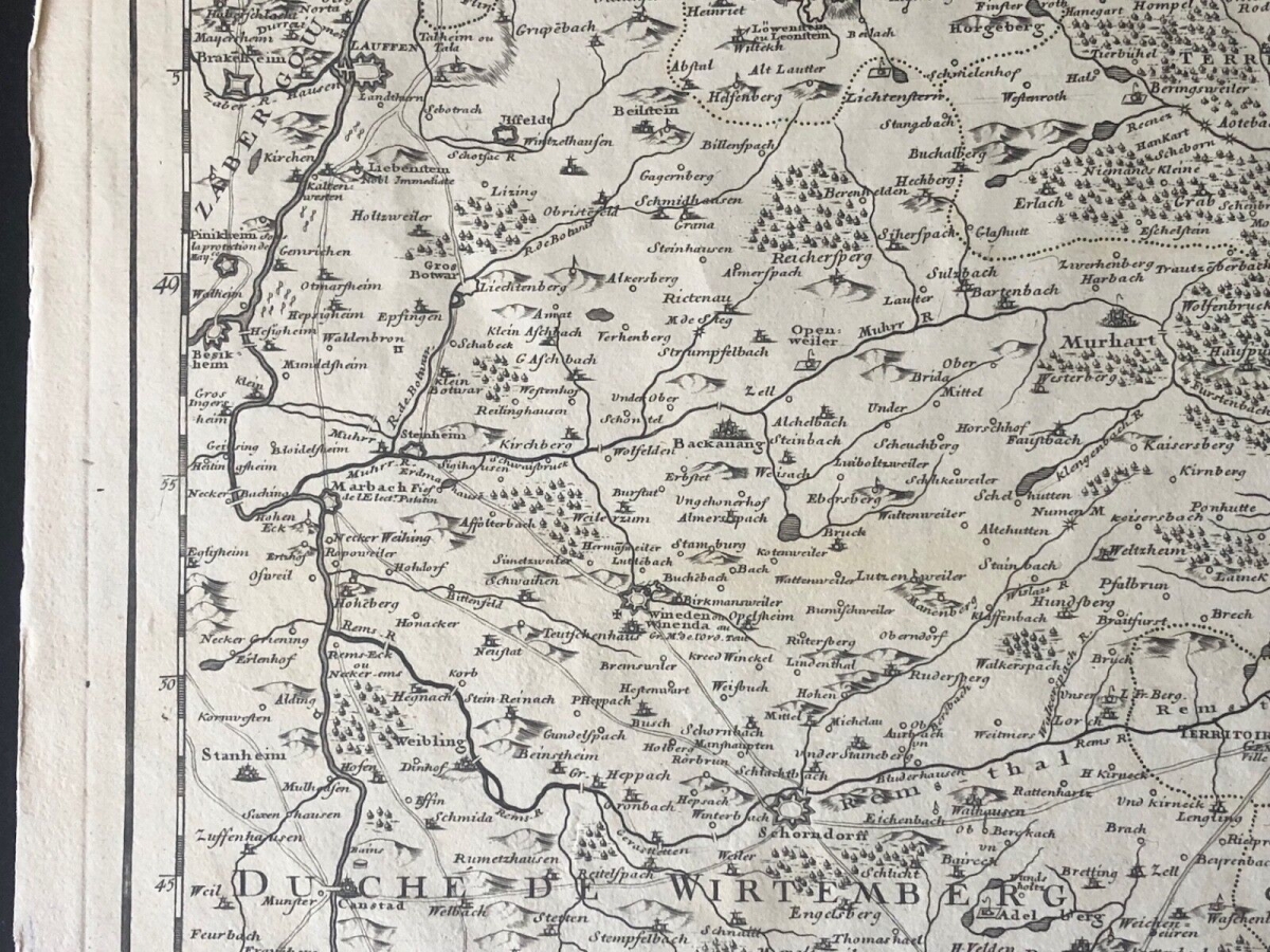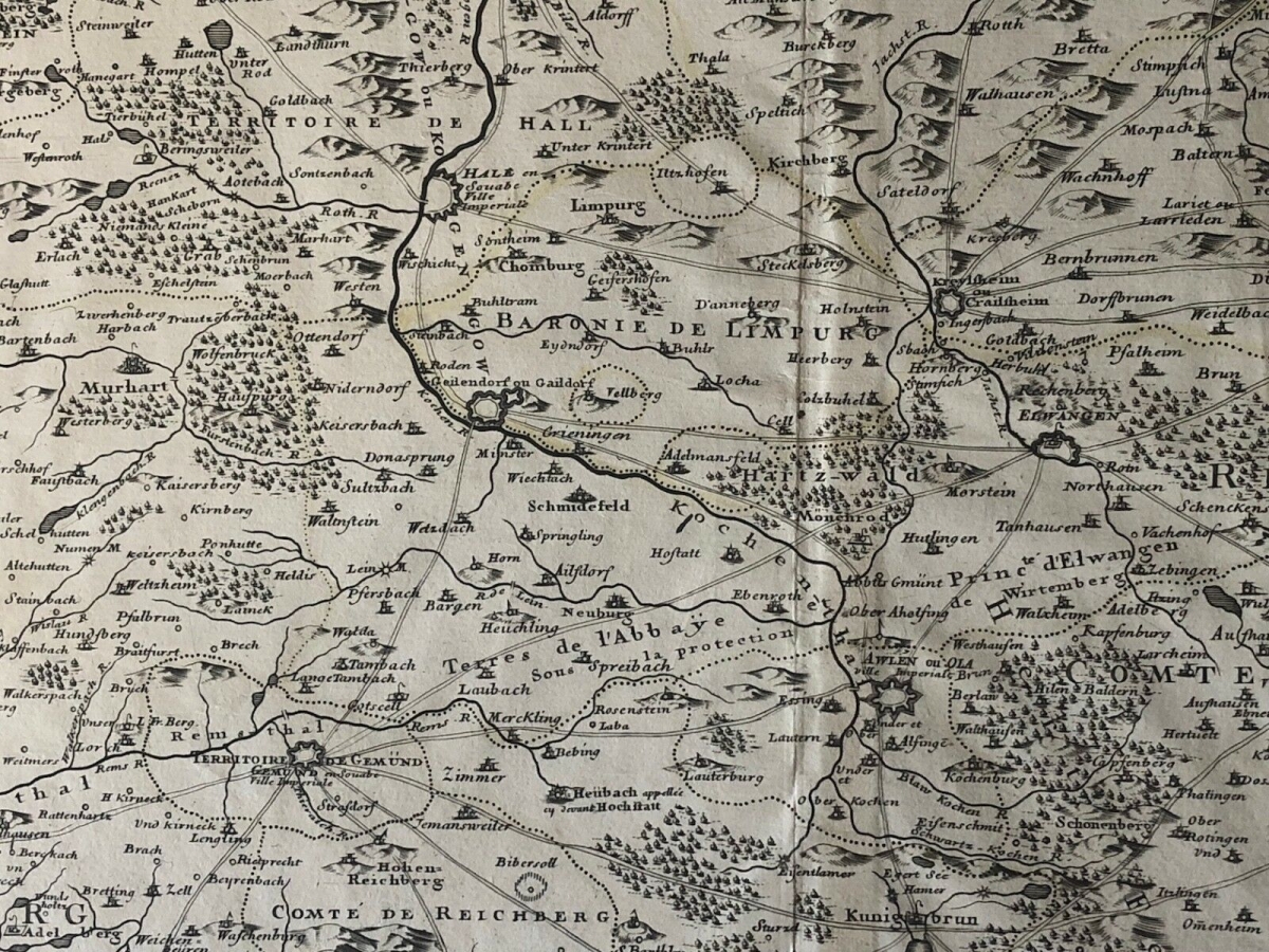 Guillaume de l'Isle XVIII Partie septentrionale de la Souabe Schwaben Allemagne. À Paris chez l'auteur fur le quai de l'horloge avec privilège du Roy. 1704. 68 cm par 50 cm. Papier vergé filigrané collier avec croix. Des petites amorces de déchirure dans les marges.