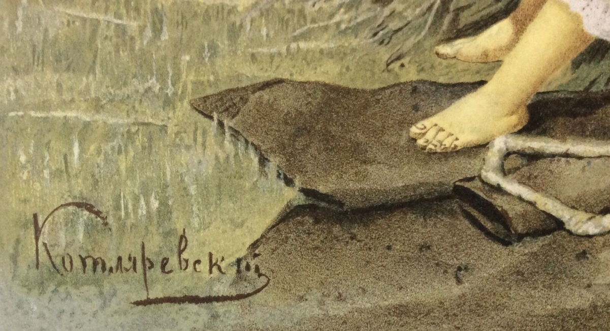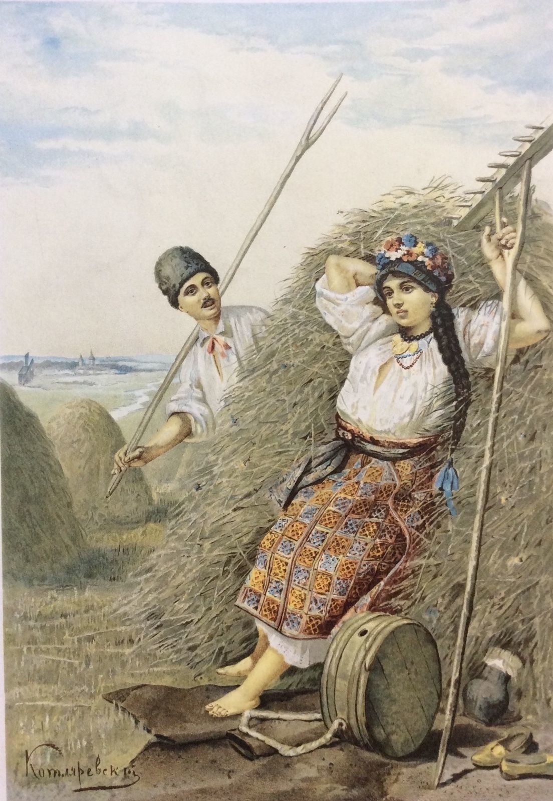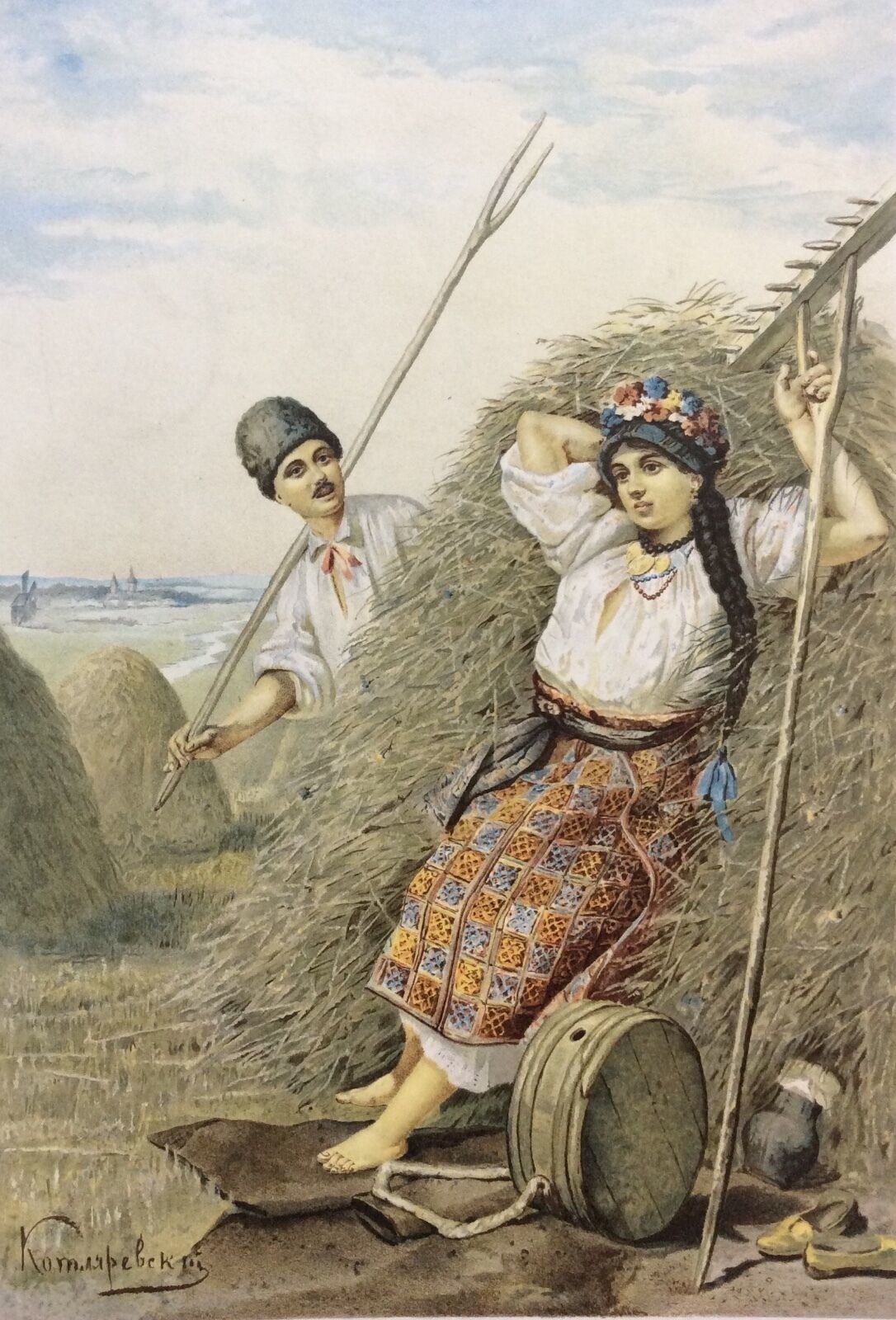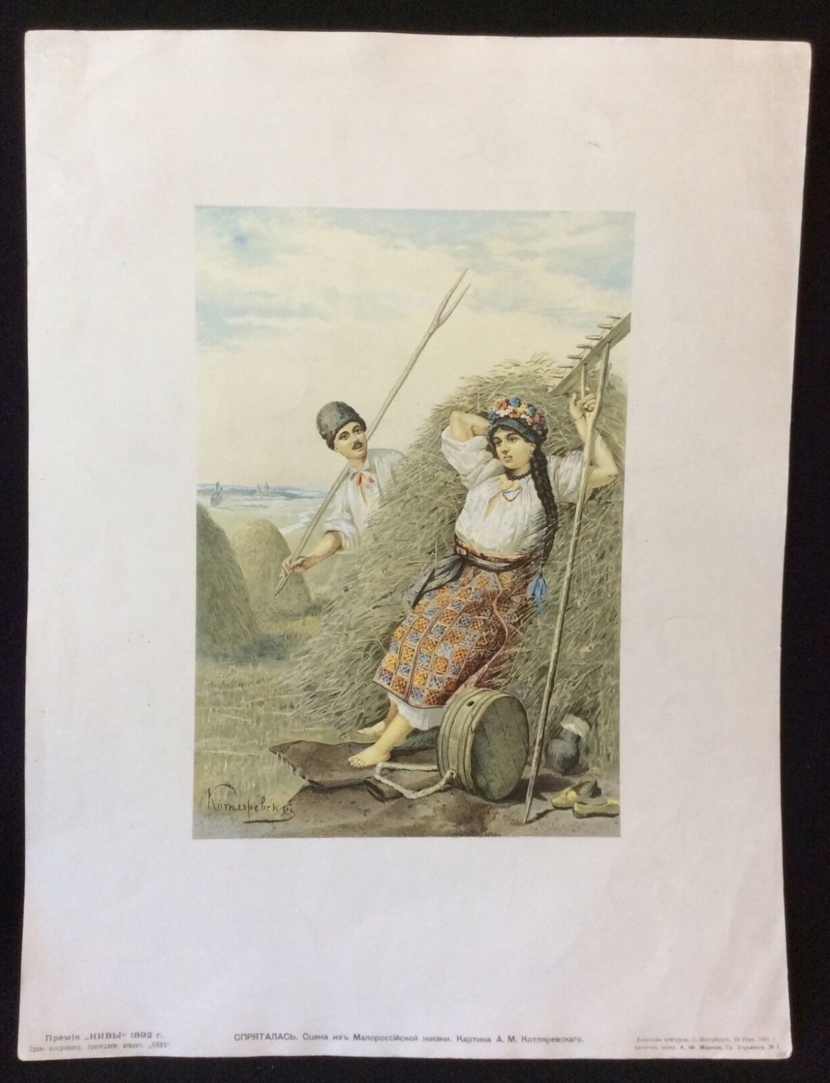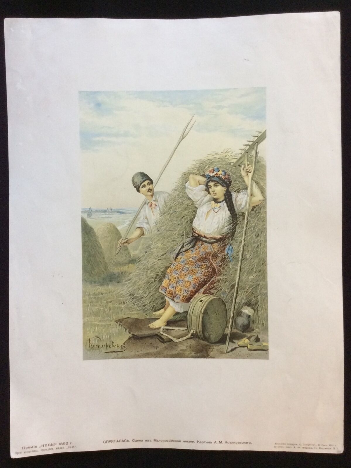 Paysan Russe lithographie polychrome 1892 signée ? Russie paysan galant Paysanne