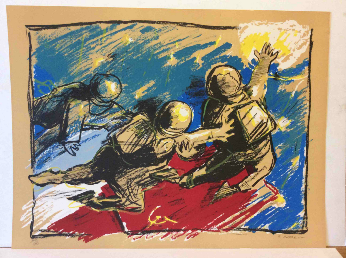 Je vous propose cette grande lithographie signée P Andrieu. C'est un superbe hommage à Youri Gagarine et à la conquête spatiale de la Russie soviétique. 65 cm par 49 cm. Très belle pièce décorative !