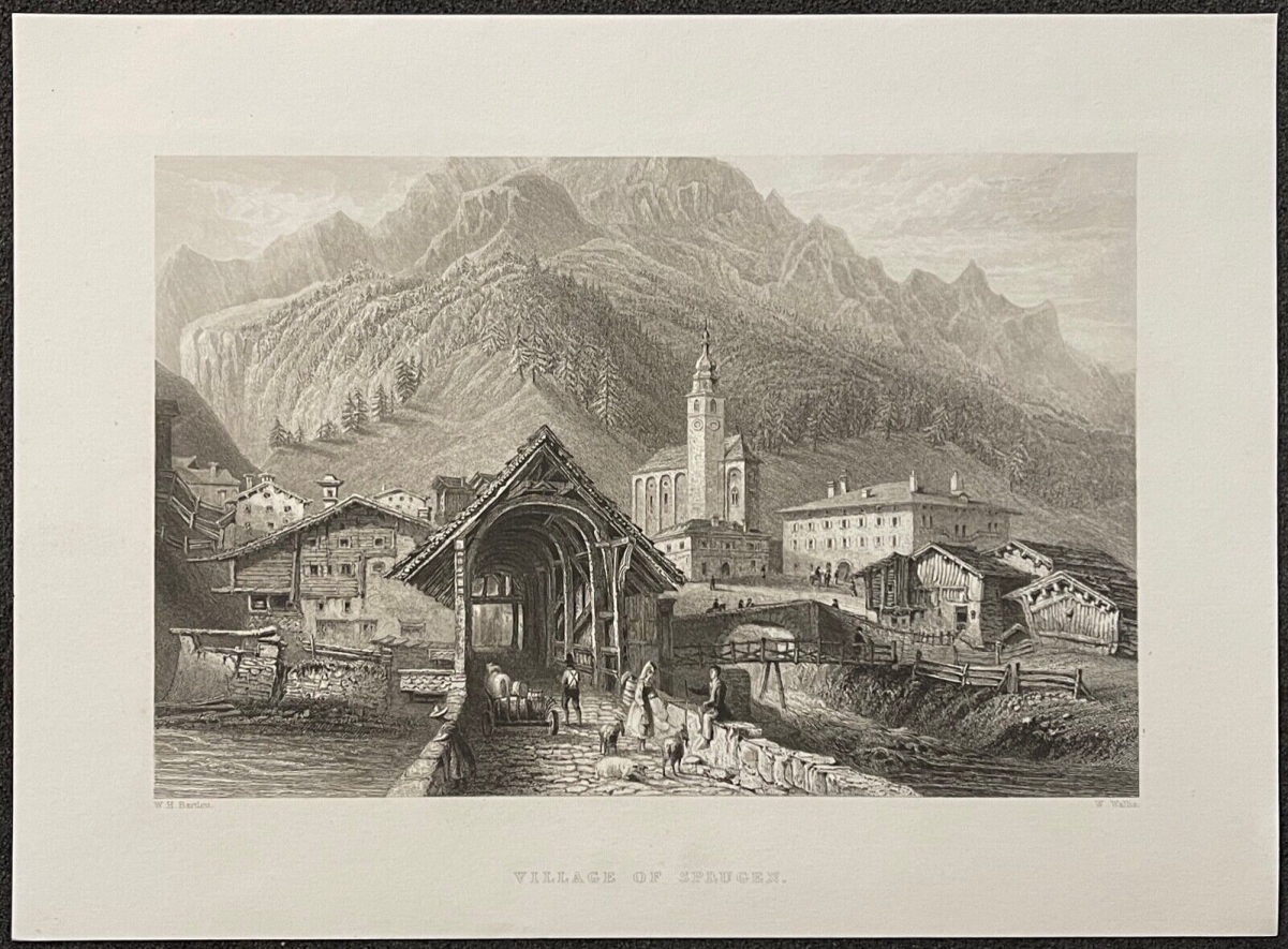 Splügen Pont Rhin Grisons Switzerland gravure de 1860 Suisse Je vous propose cette gravure de 1860 La feuille fait 19,2 cm par 15,5 cm. La gravure s...