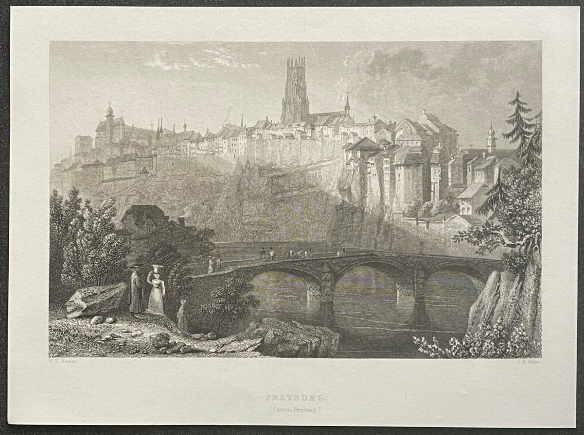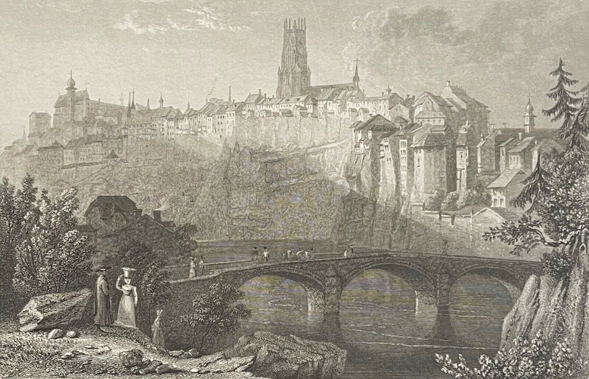 Fribourg Switzerland Alpes Freiburg gravure 1836 Suisse graveur Schroeder Je vous propose cette gravure originale de 1836. La feuille fait 19,9 cm par 15,6 cm, la g...