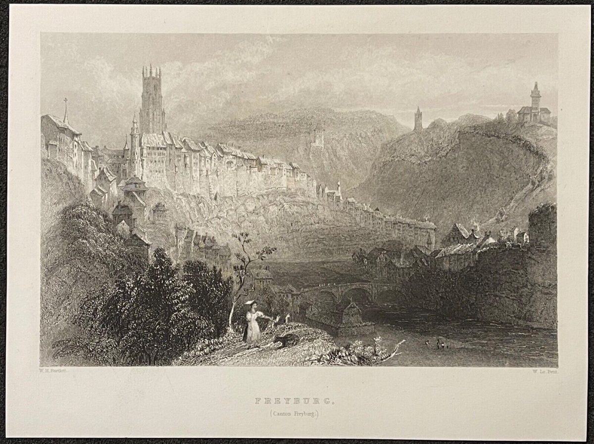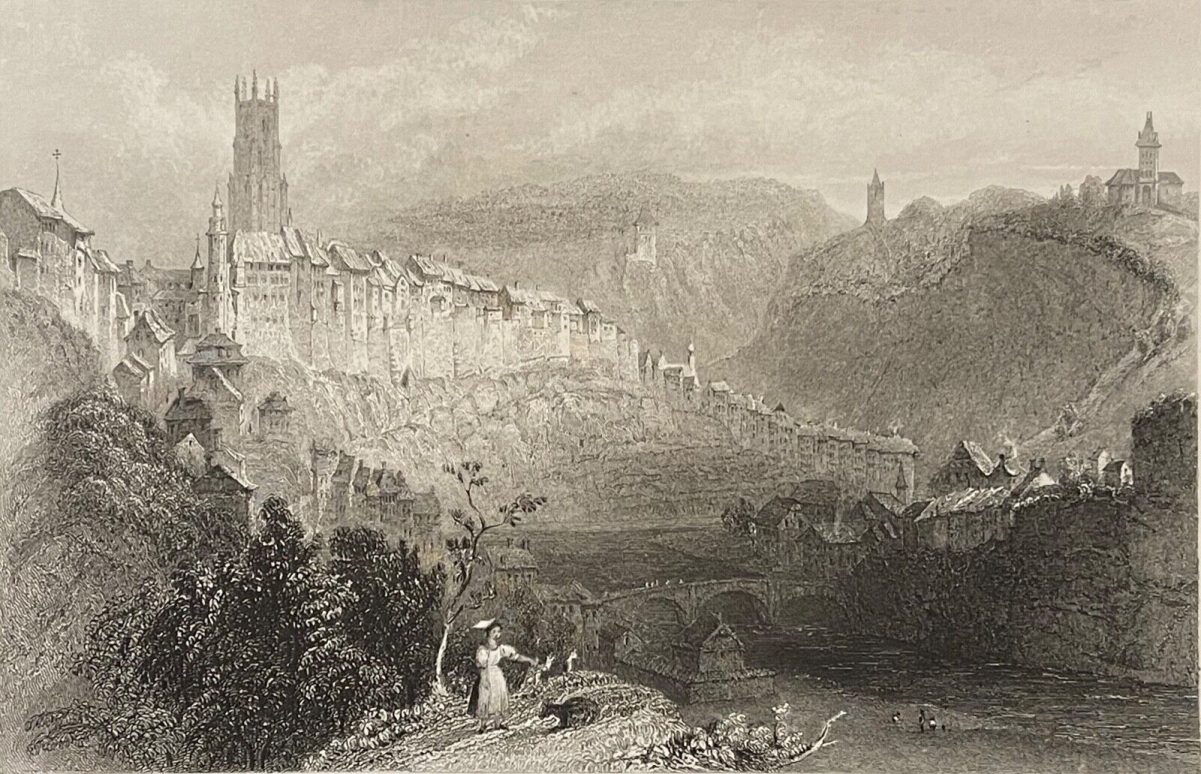 Fribourg Switzerland Alpes Freiburg gravure 1836 Suisse graveur Schroeder Je vous propose cette gravure originale de 1836. La feuille fait 19,9 cm par 15,6 cm, la g...