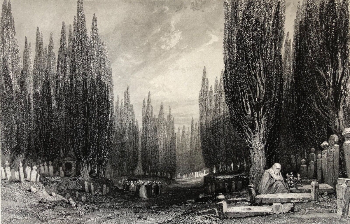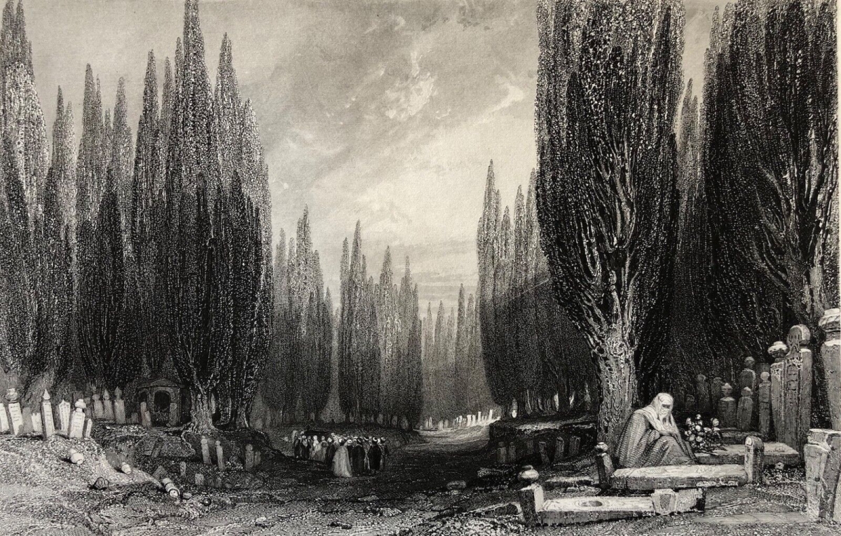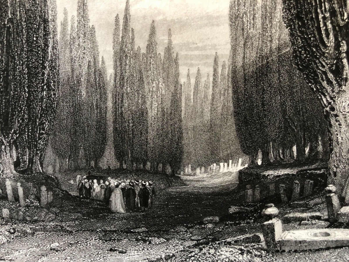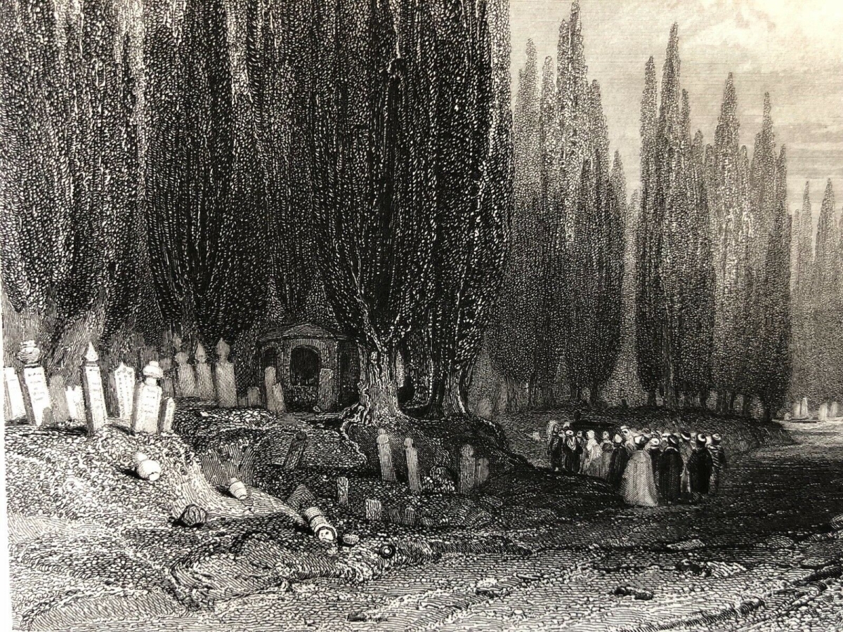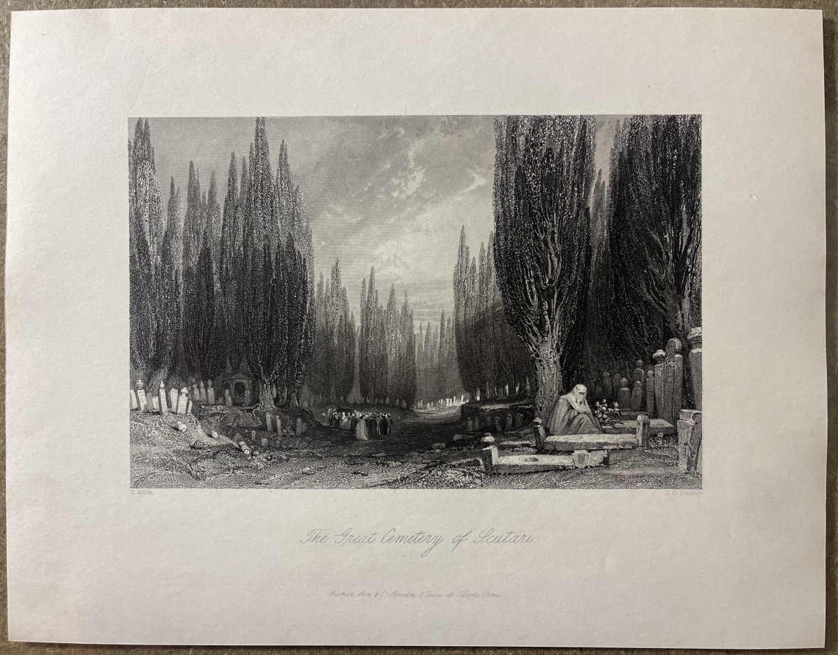 Cette gravure représente le célèbre grand cimetière de Scutari, situé à Üsküdar, sur la rive asiatique du Bosphore. Ce vaste cimetière musulman, l'un des plus impressionnants de l'Empire ottoman, est reconnaissable à ses longues allées bordées de cyprès élancés, arbres symboliques du deuil et de l'éternité.