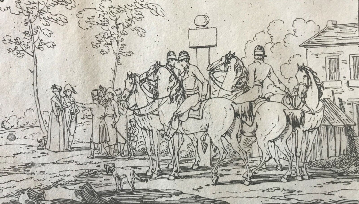 Voici une série de ses eaux fortes connues pour avoir fait partie de sa série "encyclopédie pittoresque" de 1806, série très représentative des scènes de guerres et de la vie dans le premier empire, mais aussi des jeux de polo en Angleterre. Rare! 22cm par 18cm, le motif lui-même fait 12cm par 6,5cm.