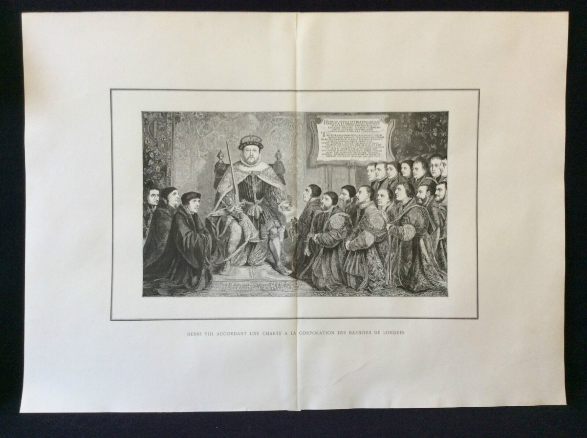Je vous propose cette lithographie intitulée "Henri VIII accordant une charte à la corporation des barbiers de Londres". Gravure double-page d'où la discrète pliure au centre de la feuille (cf liaison au verso). La feuille fait 61cm par 44,2cm, la gravure seule fait environ 34,3cm par 21cm. On notera une léger pli du papier dans la bordure inférieure n'altérant pas la présentation de la pièce. La pliure centrale supérieure présente également une légère amorce de déchirure (sur le pli) qui pourra aisément être recollée. Petit prix à saisir!