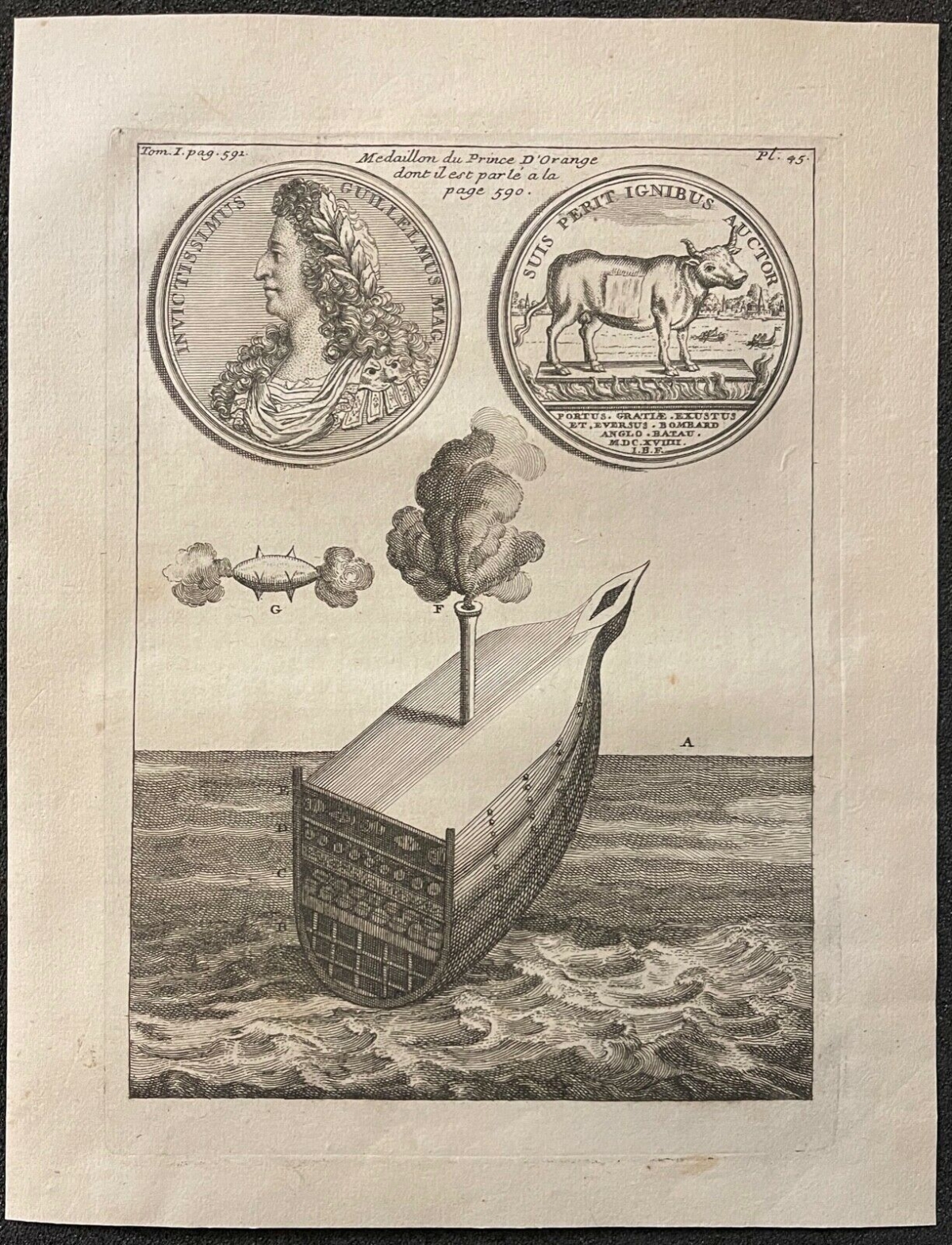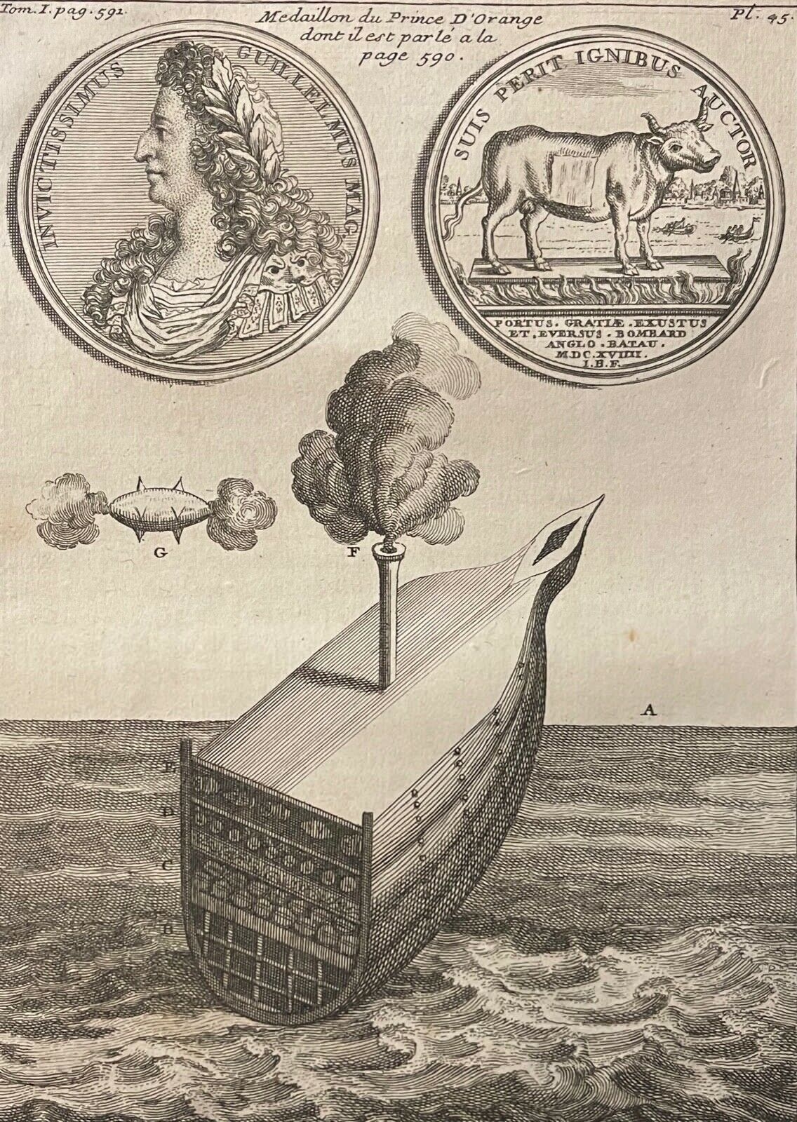 Je vous propose cette gravure sur papier vergé de 1721. La feuille fait 23,9 cm par 18,4 cm. La gravure seule fait 18,8 cm par 13,4 cm. Ce type de machine infernale invention du Prince d'Orange a été utilisée contre la ville d'Alger, puis les Anglais reprenant l'idée l'ont utilisé contre la ville du Havre, puis frappèrent cette médaille commémorative ! Superbe.