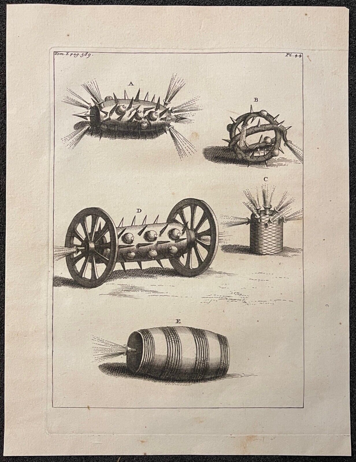 Je vous propose cette gravure sur papier vergé de 1721. A Hérisson foudroyant, B serpenteau, C Baril flamboyant, D Baril foudroyant, E Baril de composition La feuille fait 24 cm par 18,4 cm. La gravure seule fait 19 cm par 13, 3 cm. Superbe.
