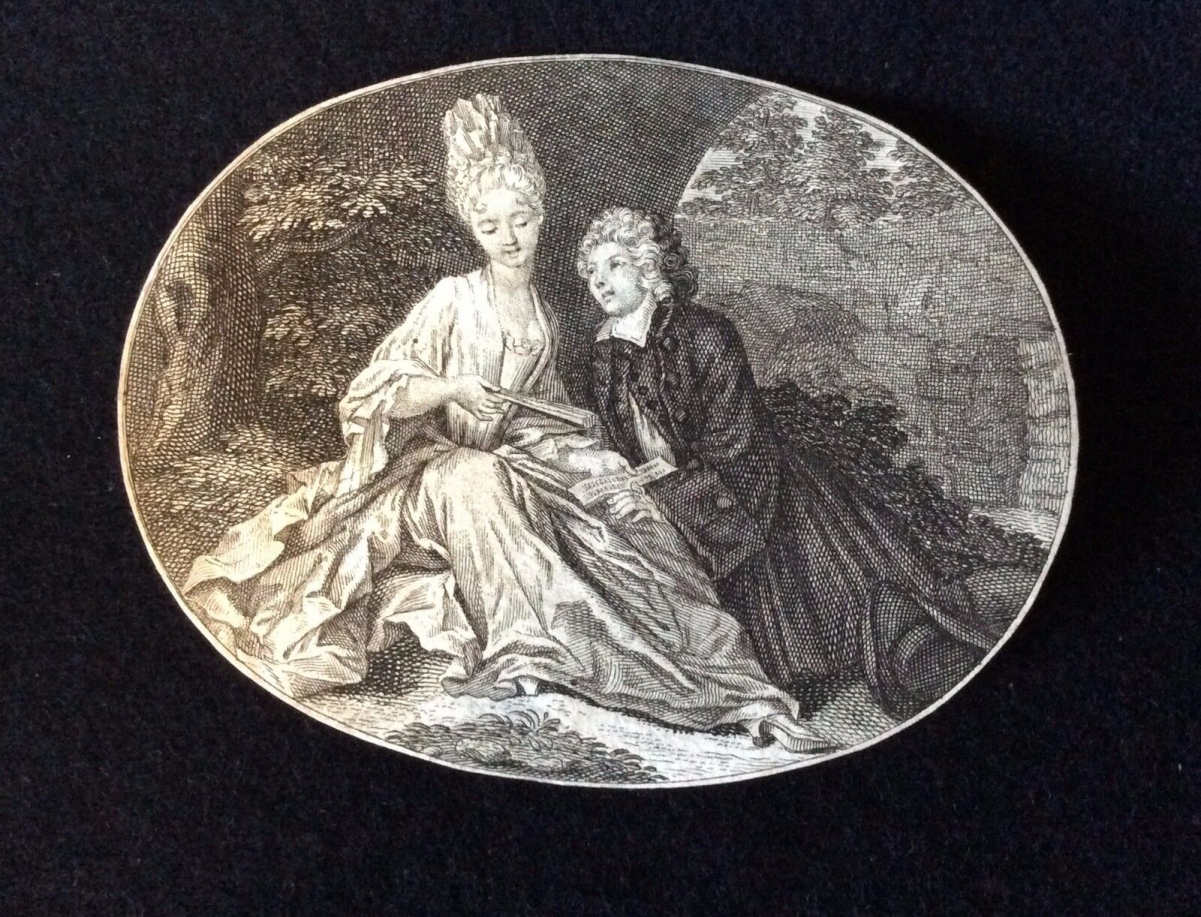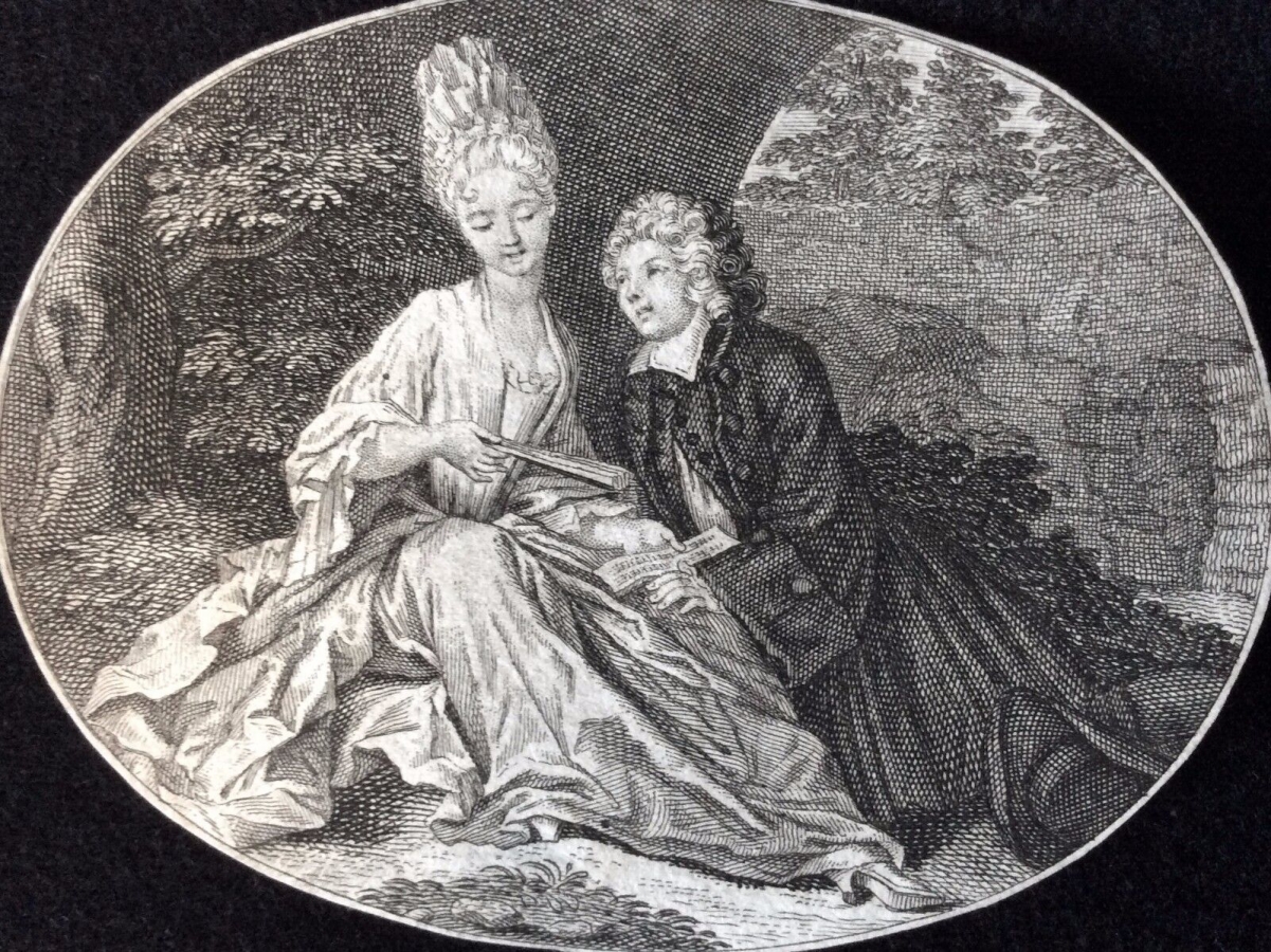 Artculture6 vous propose cette belle gravure allégorique réalisée par Bernard Picart au début du XVIIIe siècle. Elle représente un couple assis et élégamment vêtu. La femme a un éventail dans les mains.