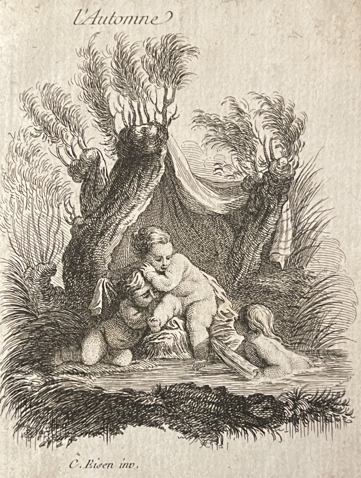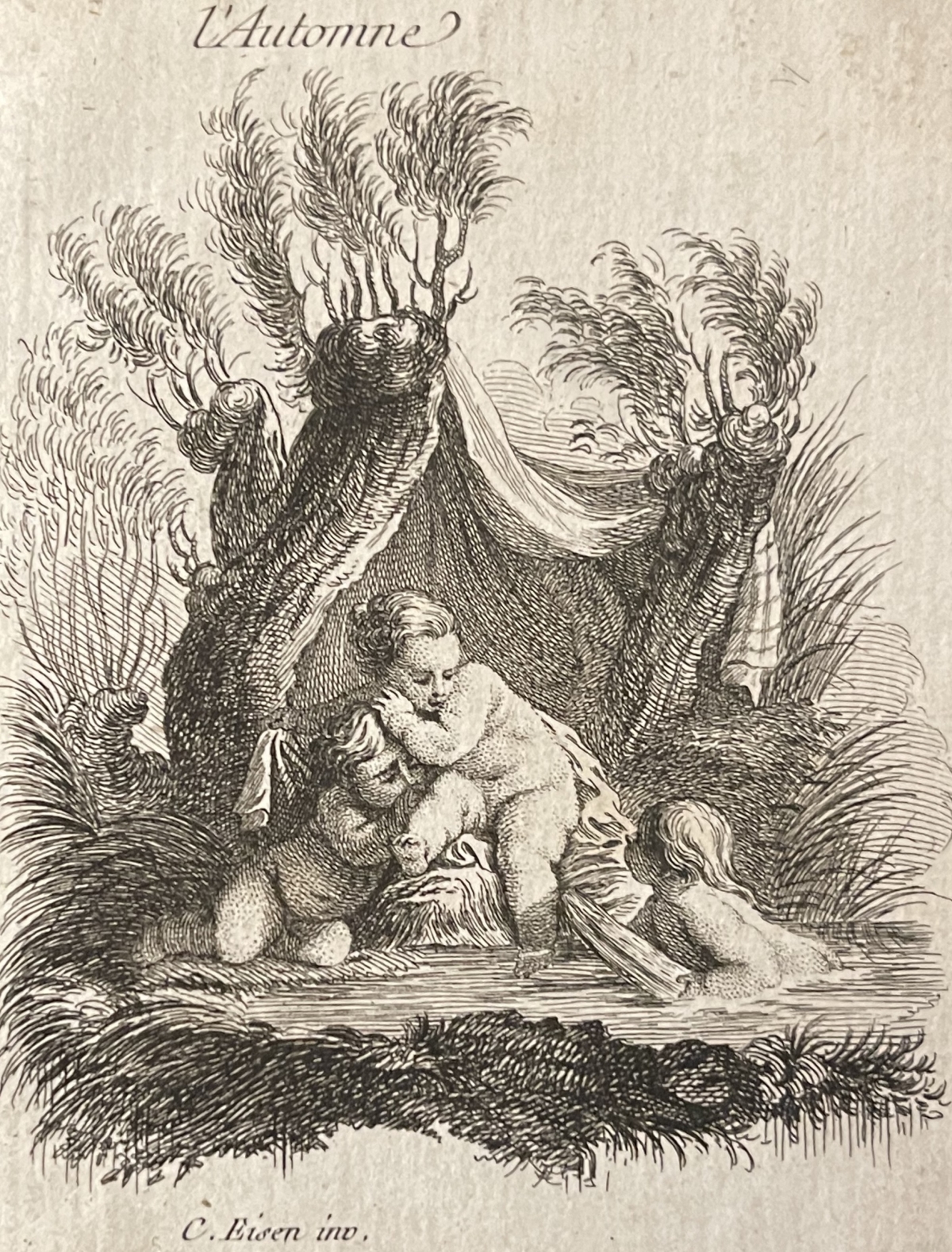 Artculture6 vous propose cette belle vignette réalisée vers 1760 d'après Charles Eisen (1720-1778). La feuille fait :10 cm par 7,3 cm. Sur papier de lin vergé XVIIIe.