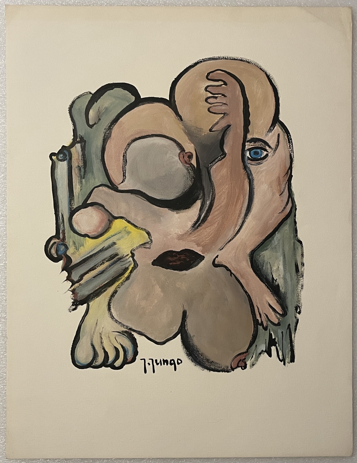 Je vous propose cette œuvre expressionniste signée J. Jungo. La feuille fait 65 cm par 50 cm environ. On notera une légère trace de plis dans l'angle haut gauche, sans trop d'importance. Belle pièce !