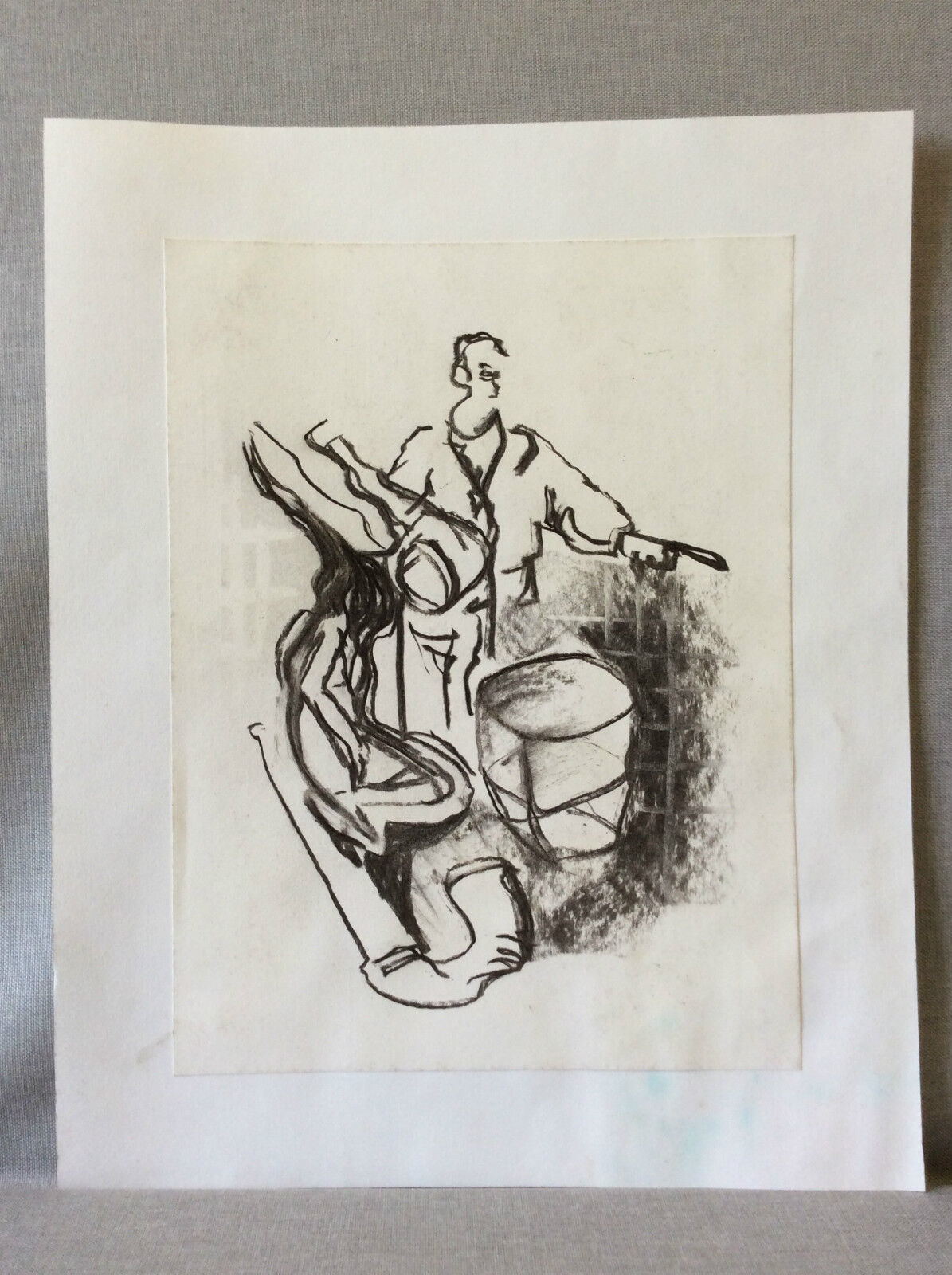 Je vous propose ce beau fusain expressionniste marouflé sur papier. Anonyme. La feuille support fait 40,7cm par 32,8cm. Le fusain seul fait 31,9cm par 23,9cm. On admettra de légères noirceurs et traces sur le pourtour de la feuille "support" qui pourront aisément disparaitre à l'encadrement,à la retaille ou au décollement de la feuille n'altérant pas ainsi la présentation de la pièce. Jolie pièce!