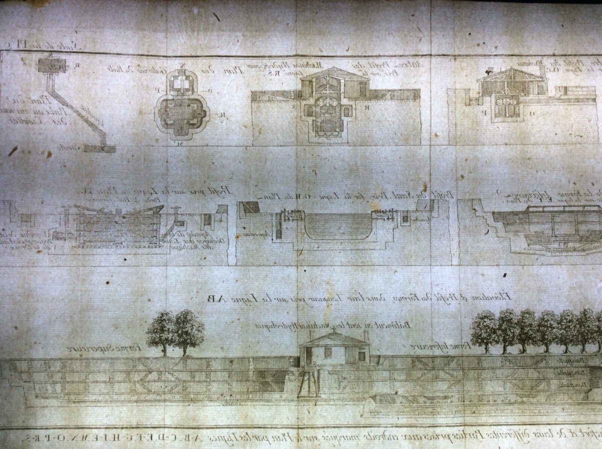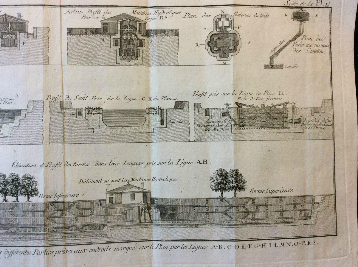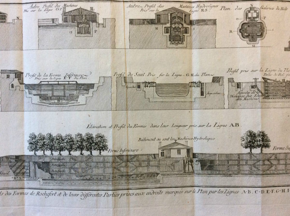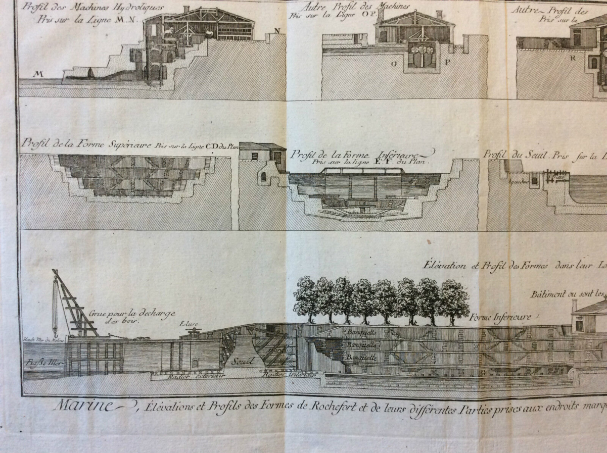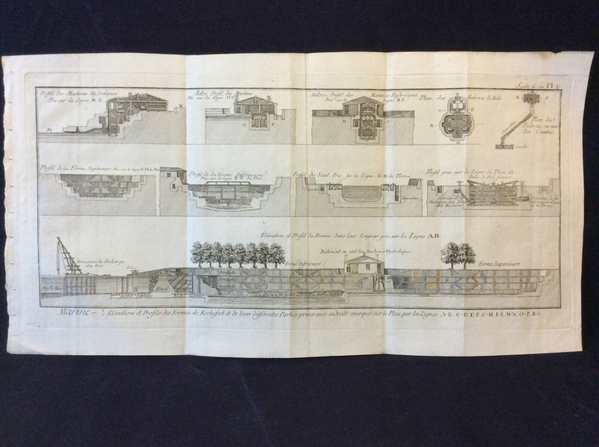 Je vous propose cette estampe représentant le plan des formes à Rochefort pour les navires du roi Louis XIV. La feuille fait 44,4cm par 22,7 mm: la gravure seule 40 cm par 16,7cm. Sur papier vergé ombré première moitié du XVIIIe, traces de pliures dues à l'origine. Superbe !