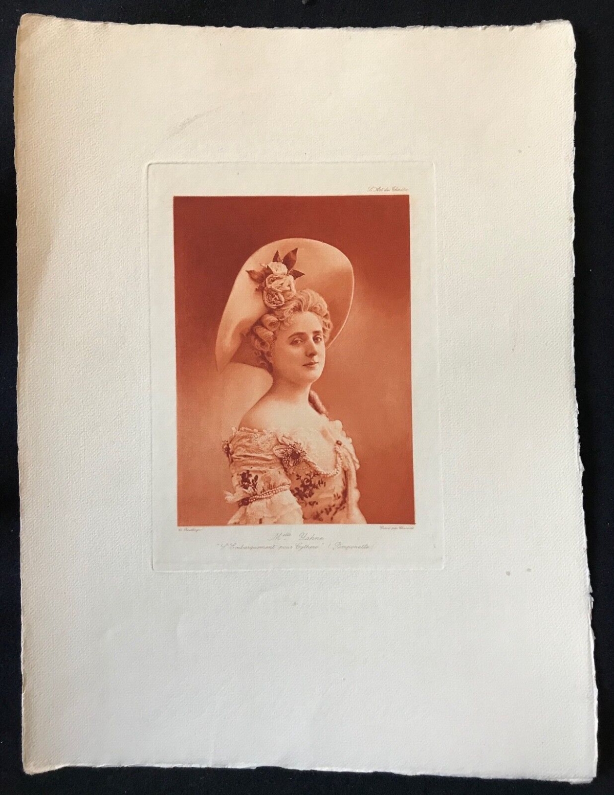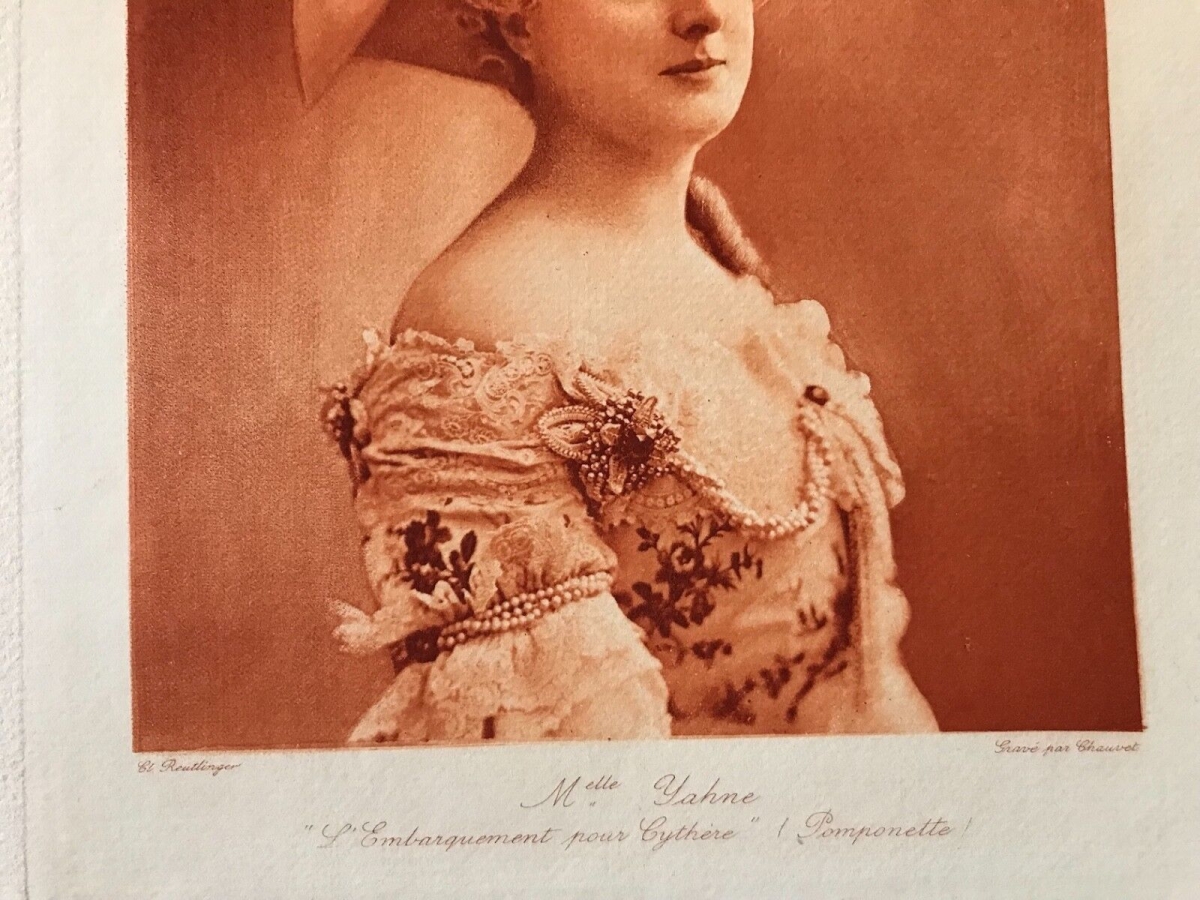 Je vous propose cette belle estampe représentants Madame Yahne (1867-1950). Procédé d'après un cliché Charles Reutlinger (1816-1880). Sur papier Japon marouflée d'origine sur papier colophane filigrané l'Art du Théâtre. Dimensions de la feuille support 35,8 cm par 26,8 cm. On notera quelques rousseurs sur les marges !