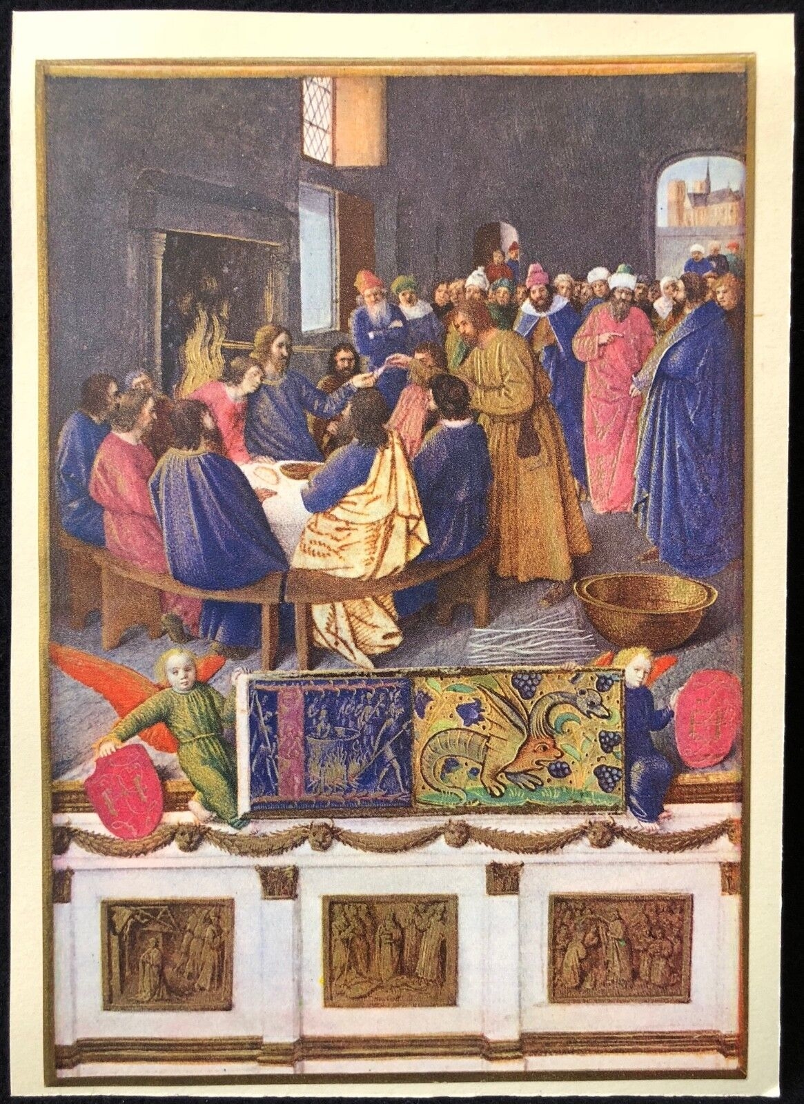 Je vous propose cette belle reproduction en photogravure "Saint Jean pendant la Cène". St Jean appuie sa tête contre l'épaule de Jésus. Au fond Nôtre dame de Paris. Miniature réalisée par Jean Fouquet (1420-1481) pour le livre d'heures d'Etienne chevalier. Fouquet est considéré comme le meilleur peintre Français du XVe. Tirage de 1945. 16,5 cm par 11,5 cm. Contrecollée sur papier. Jolie pièce!