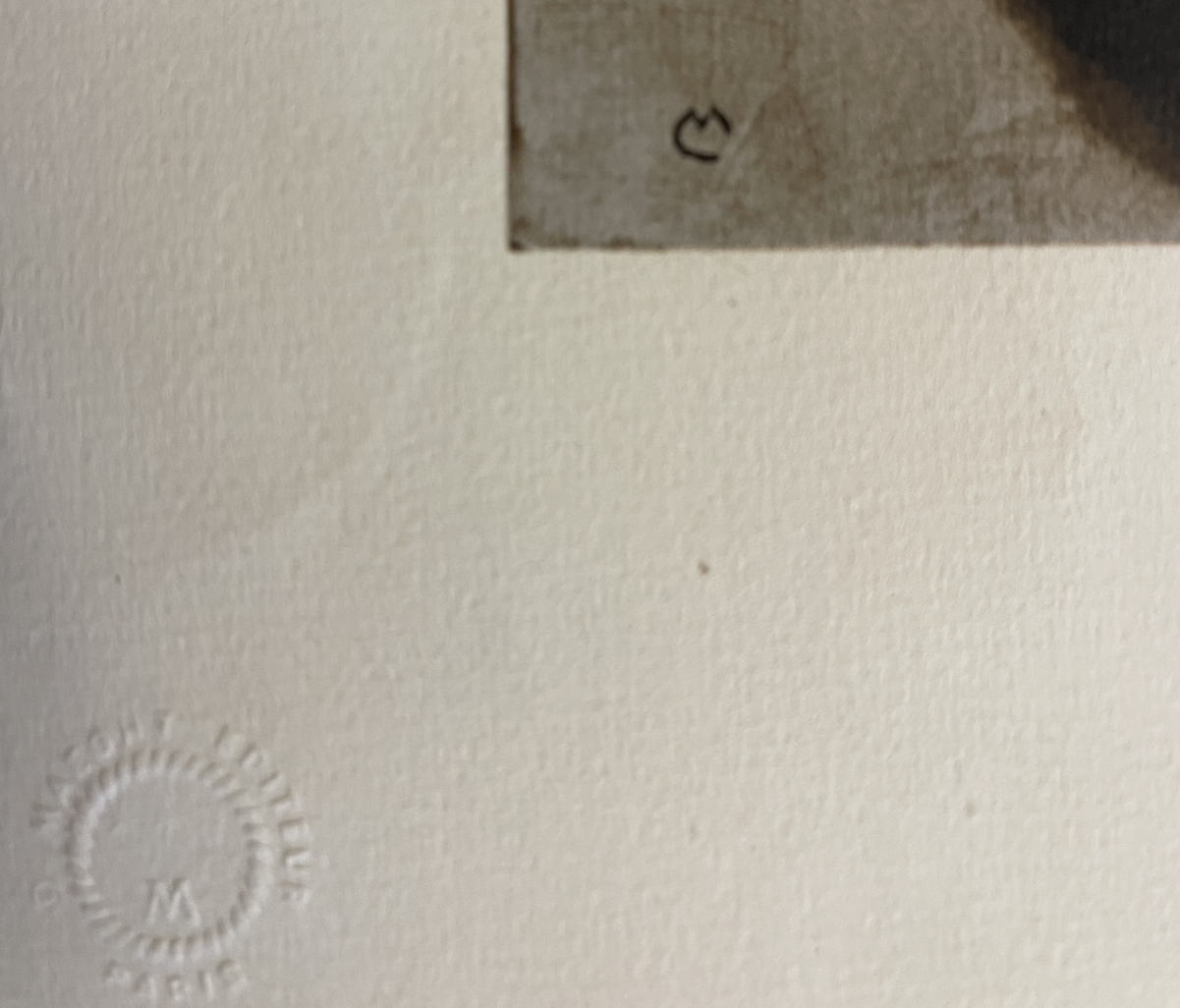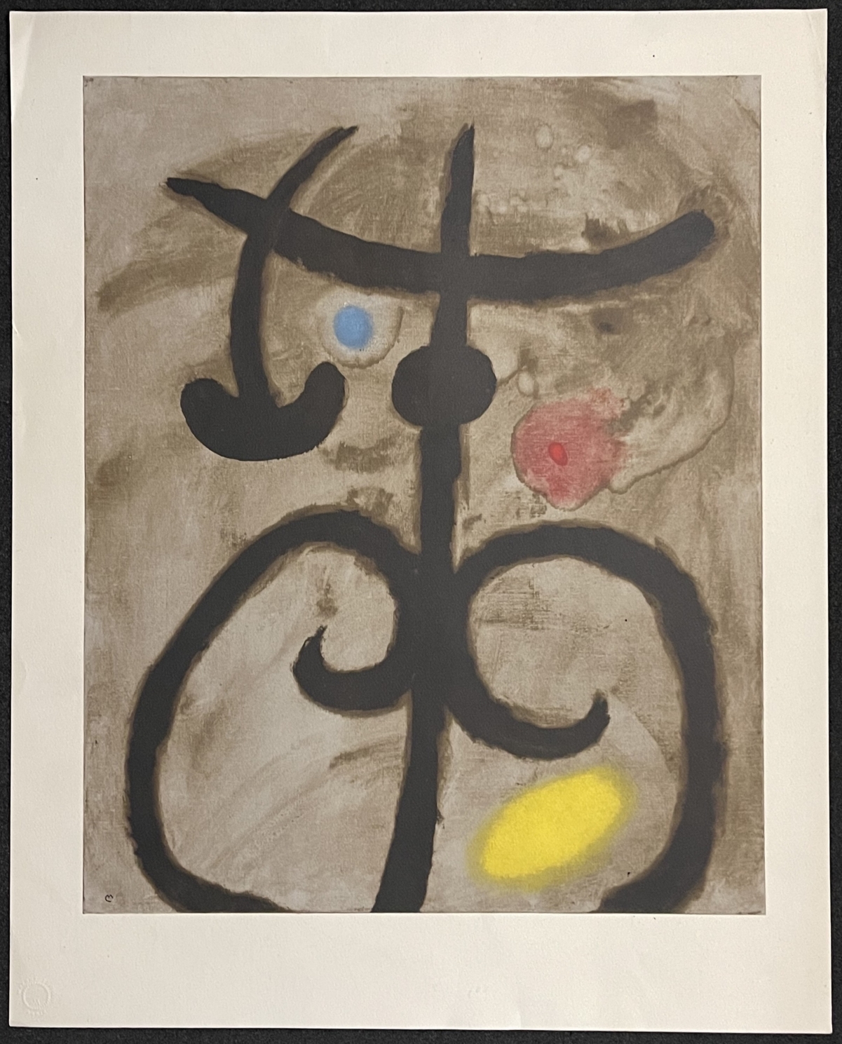 Je vous propose cette Lithographie de Joan Miró intitulée Femme assise III/V, d'après une composition du 29 novembre 1960, éditée par Maeght. Format 56 Ã? 45 cm. Composition emblématique du vocabulaire graphique de l'artiste dans les années 1960, articulée autour d'un puissant signe noir structurant l'espace, animé de touches colorées bleu, rouge et jaune sur fond texturé aux tonalités terreuses. Å?uvre signée dans la planche, portant le cachet sec de l'éditeur Maeght en bas à gauche, garantissant l'édition officielle. Impression sur beau papier vélin, belle présence visuelle, très bon état général. Pièce représentative du Miró mature, à la fois sobre, poétique et immédiatement identifiable. Å?uvre recherchée des amateurs de Miró et des grandes éditions Maeght des années 1960.