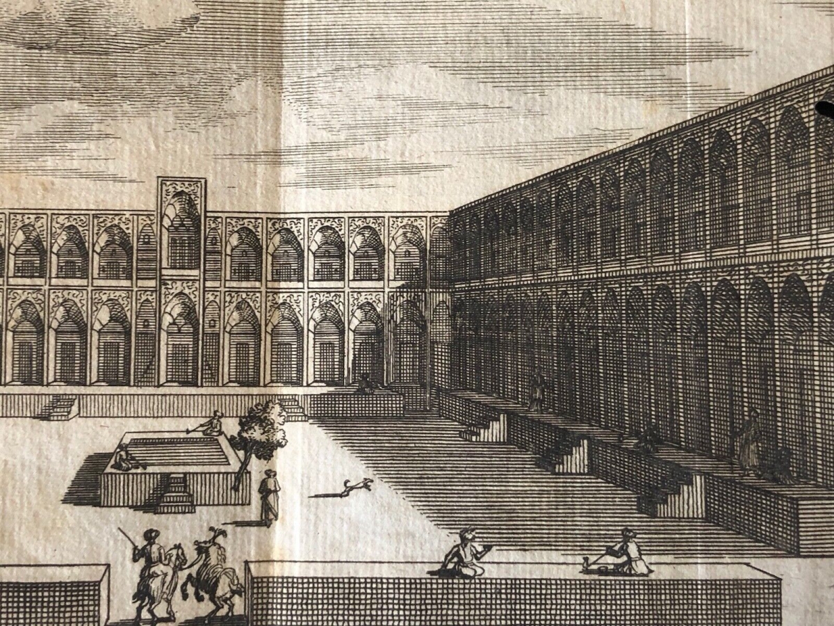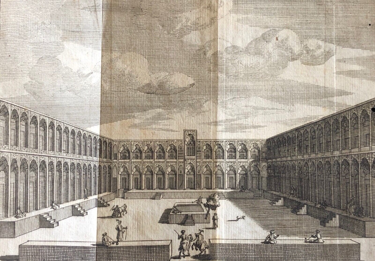 Je vous propose cette très rare gravure de 1686 représentant à Kashan le caravan-seray. Gravure réalisée par Guillaume-Joseph Grelot (1630-c1780). Sur papier de lin vergé ombré filigrané. La feuille fait 18,5 cm par 13,8 cm, la gravure seule 16 cm par 11,8 cm. On notera des pliures d'origines et des trous de vers, la pièce reste très rare et encadrée elle sera très présentable.