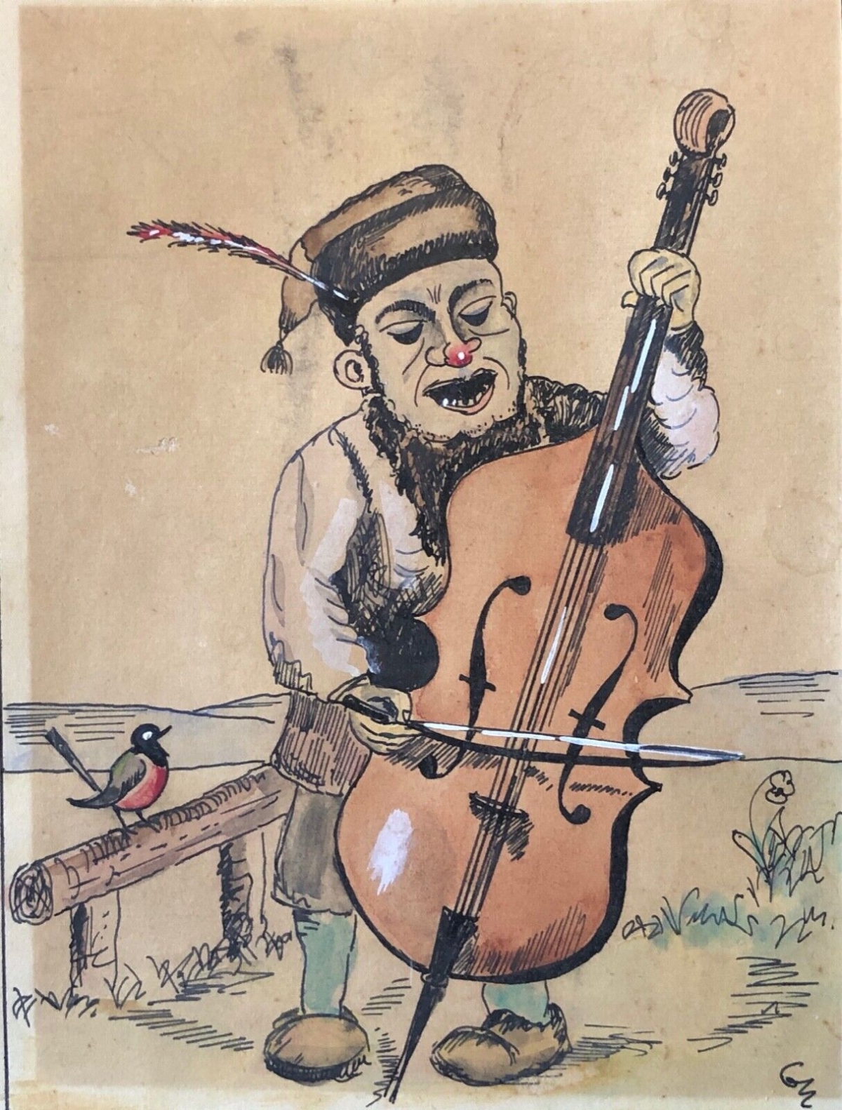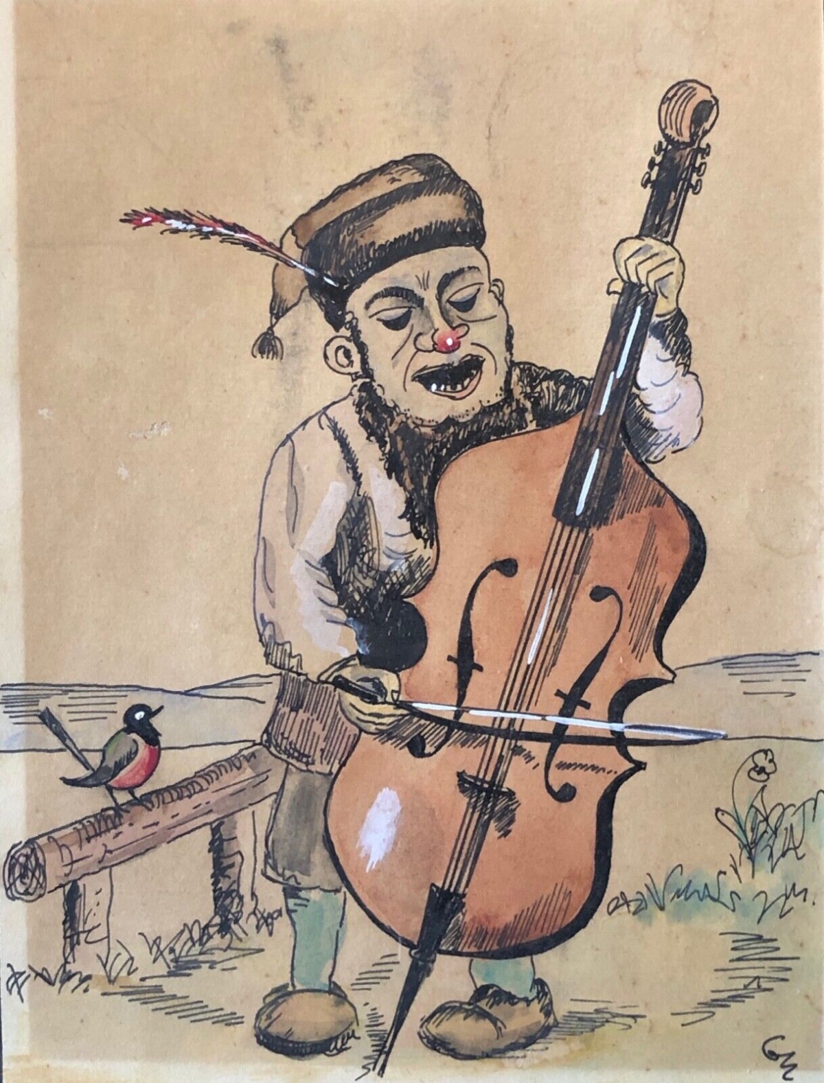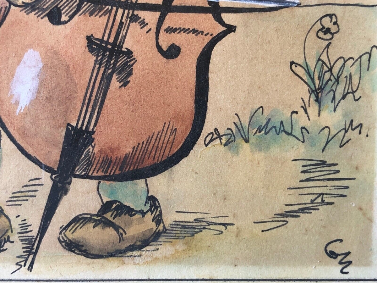 La contrebasse. aquarelle signée ? Travail étranger ? de grande qualité.