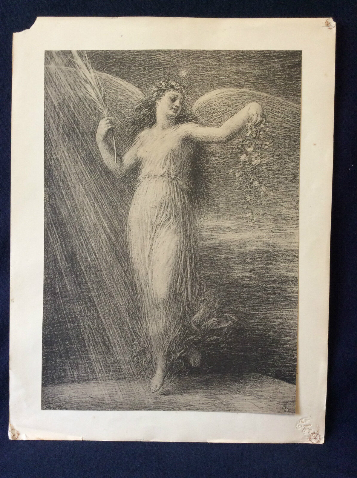 Lithographie originale d'Henri Fantin-Latour (1836-1904), lithographe, artiste peintre réaliste et intimiste français. Intitulée "L'immortalité" éditée pour la revue "L'Estampe moderne" (publiée entre mai 1897 et avril 1899). Pièce similaire à celle du British Muséum, n° d'enregistrement : 1899,0120.173 Lithographie signée avec timbre sec de l'éditeur (Ch. Masson et E. Piazza) en bas à droite. Imprimerie Le Champenois, Paris. Collée par le haut d'origine. Feuille : 40,6 cm x 30,8 cm, lithographie seule : environ 34,5 cm x 24,3 cm. Petit manque sur le support sur l'angle supérieur gauche et petits trous dus à d'anciennes punaises, n'altérant en rien la qualité de la pièce. Superbe !