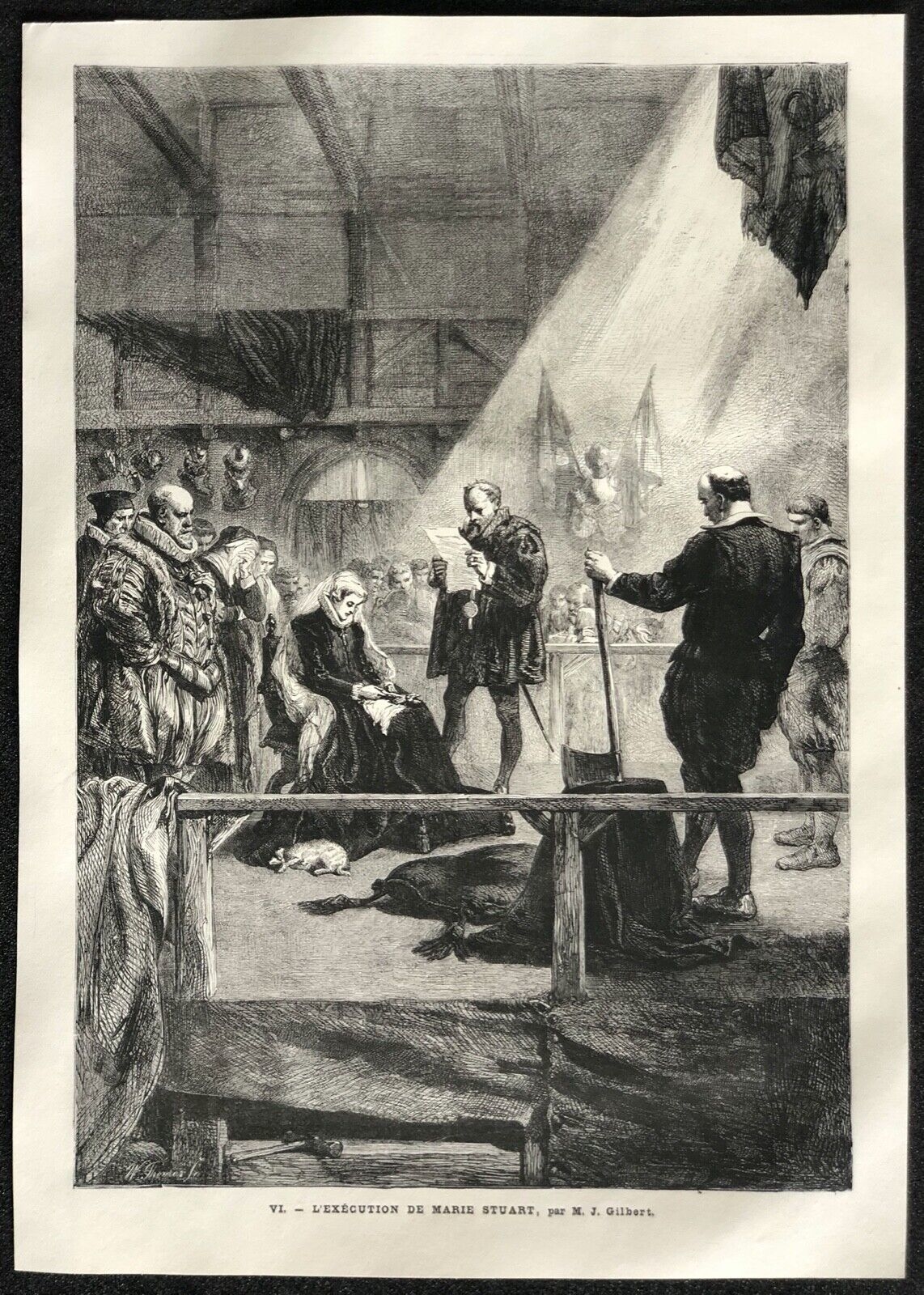 Je vous propose cette belle gravure du XIXe représentant la scène de la condamnation à mort de Marie Stuart reine d'Écosse et de France fille de Jacques V d'Écosse et de Marie de Guise née le 8 décembre 1542 en Écosse, exécutée le 8 février 1587 en Angleterre. Dimensions : la feuille fait 37,8 cm x 26,7 cm, la gravure seule fait 33,7 cm x 23,3 cm. Superbe !