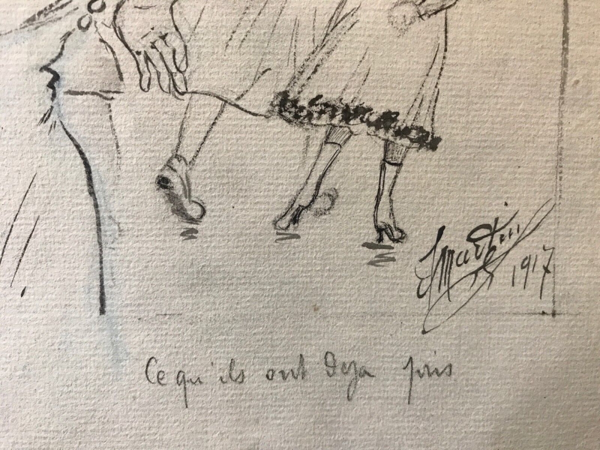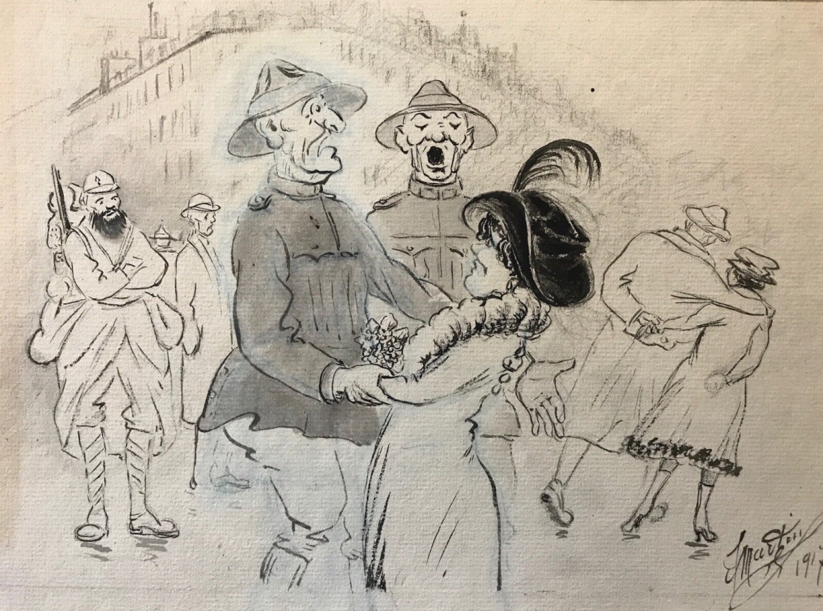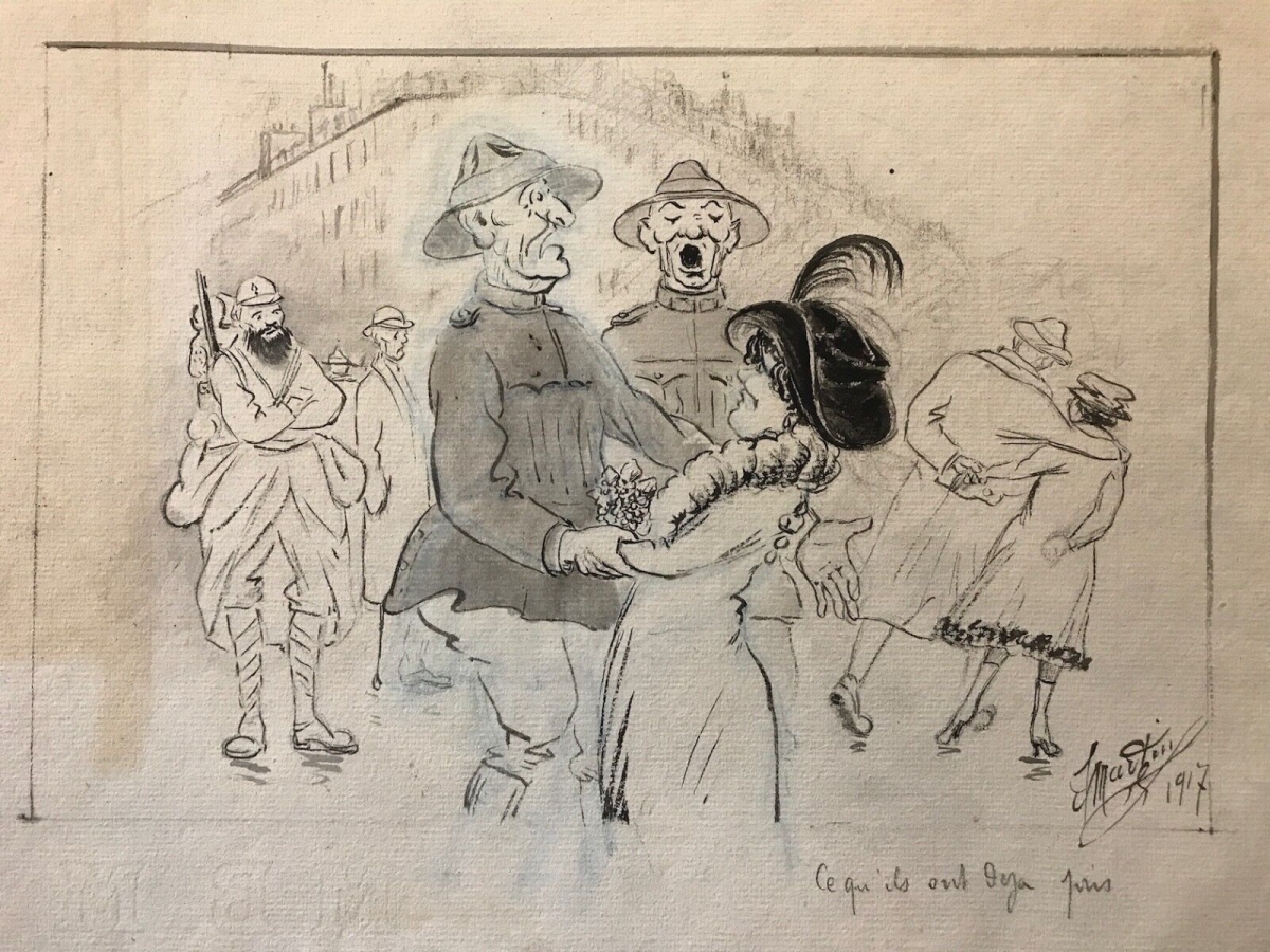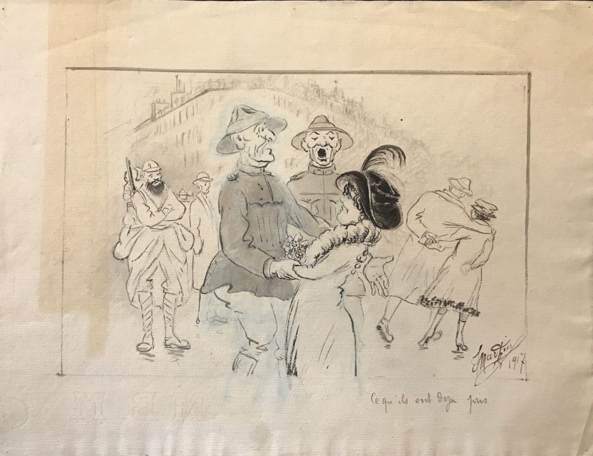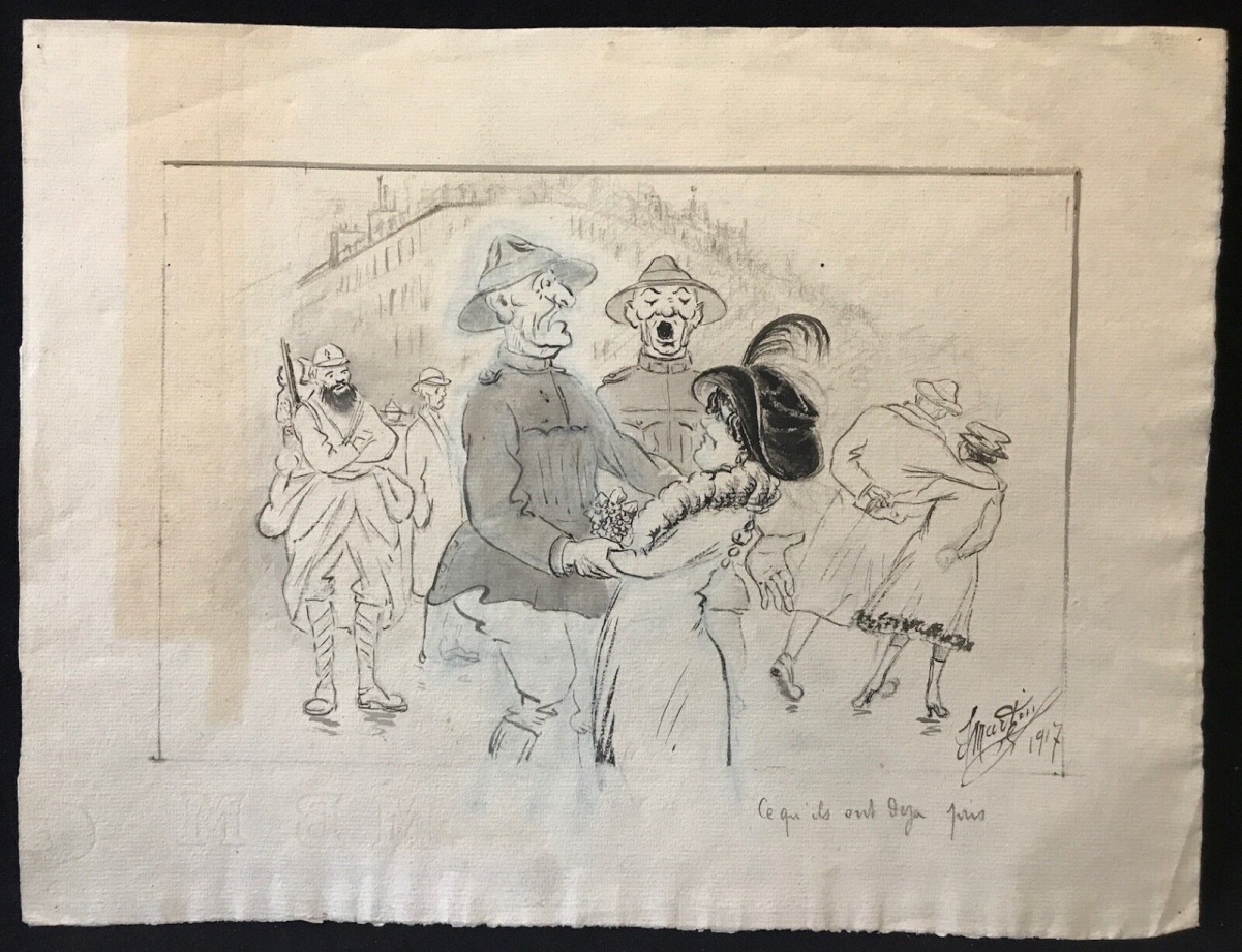 Je vous propose ce dessin humoristique. Soldats américains. La feuille fait 31,2 cm par 23,8 cm. Sur papier vergé. On notera une bande jaunâtre sur la gauche. Sinon belle pièce!