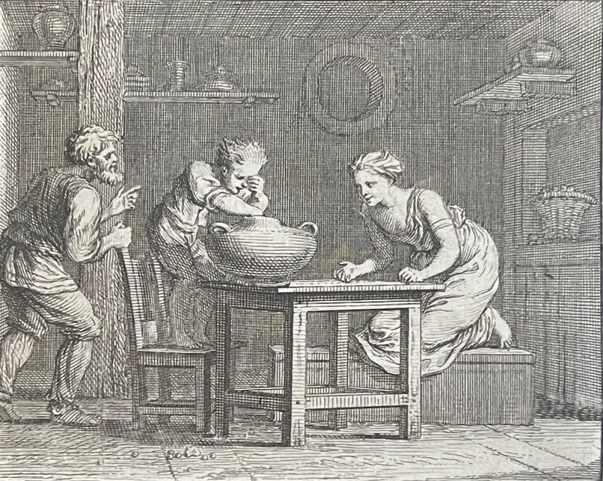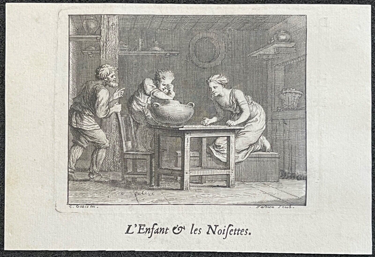 L'enfant et les noisettes par Claude GILLOT (1673-1722) gravure de 1719 France