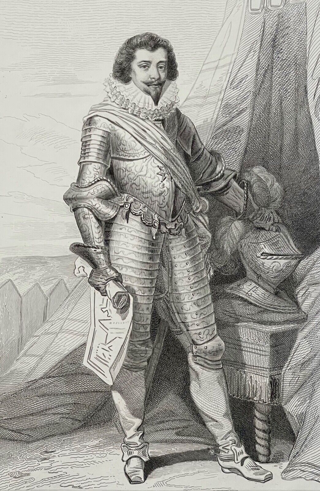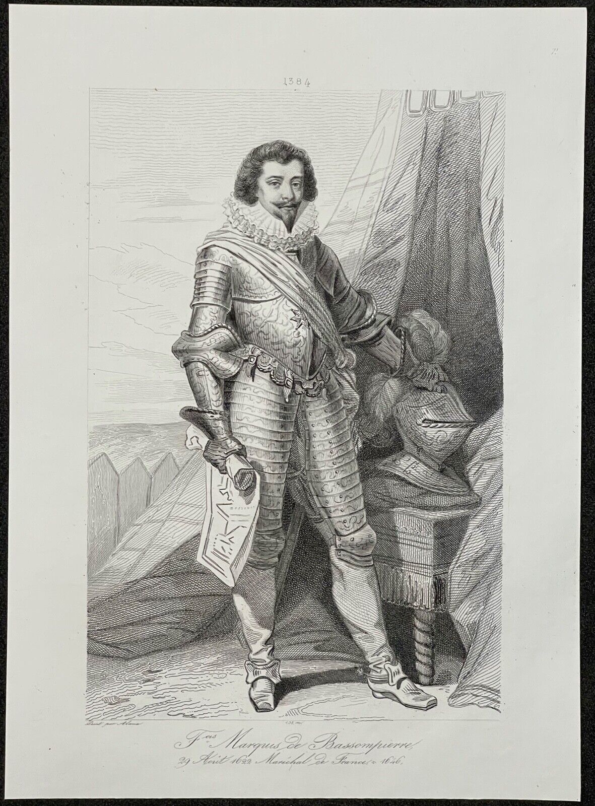 Je vous propose cette estampe vers 1840 portrait de François de Bassompierre, marquis d'Haroué né au château d'Haroué en Lorraine le 12 avril 1572. Militaire il se distingue dans de nombreux conflits, tout d'abord sous Henri IV puis Louis XIII. Nommé colonel général des Suisses puis maréchal de France, Louis XIII lui donna la charge d'ambassadeur en Espagne, Suisse et Angleterre. Il décède au château de du duc de Vitry (Ile de France) le 12 octobre 1646 d'une attaque d'apoplexie. La feuille fait 25,6 cm par 18,5 cm, la gravure seule 20,5 cm par 13,4 cm. Superbe.