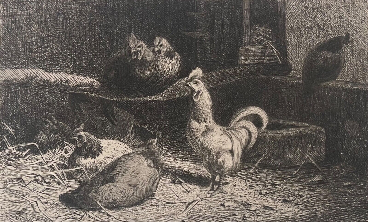 Le poulailler par Léon Jacque (1828-..? ) Pointe sèche c 1860 Poule