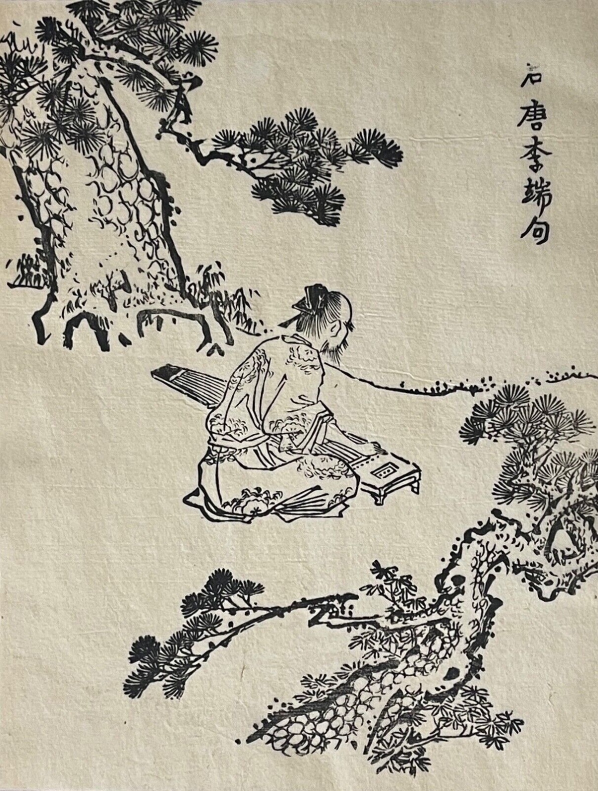 La scène montre un lettré musicien jouant du guzheng dans un paysage stylisé de pins et de rochers, thème classique de la peinture savante d'Extrême-Orient. L'atmosphère est volontairement méditative et poétique, fidèle à l'esthétique des représentations lettrées chinoises.