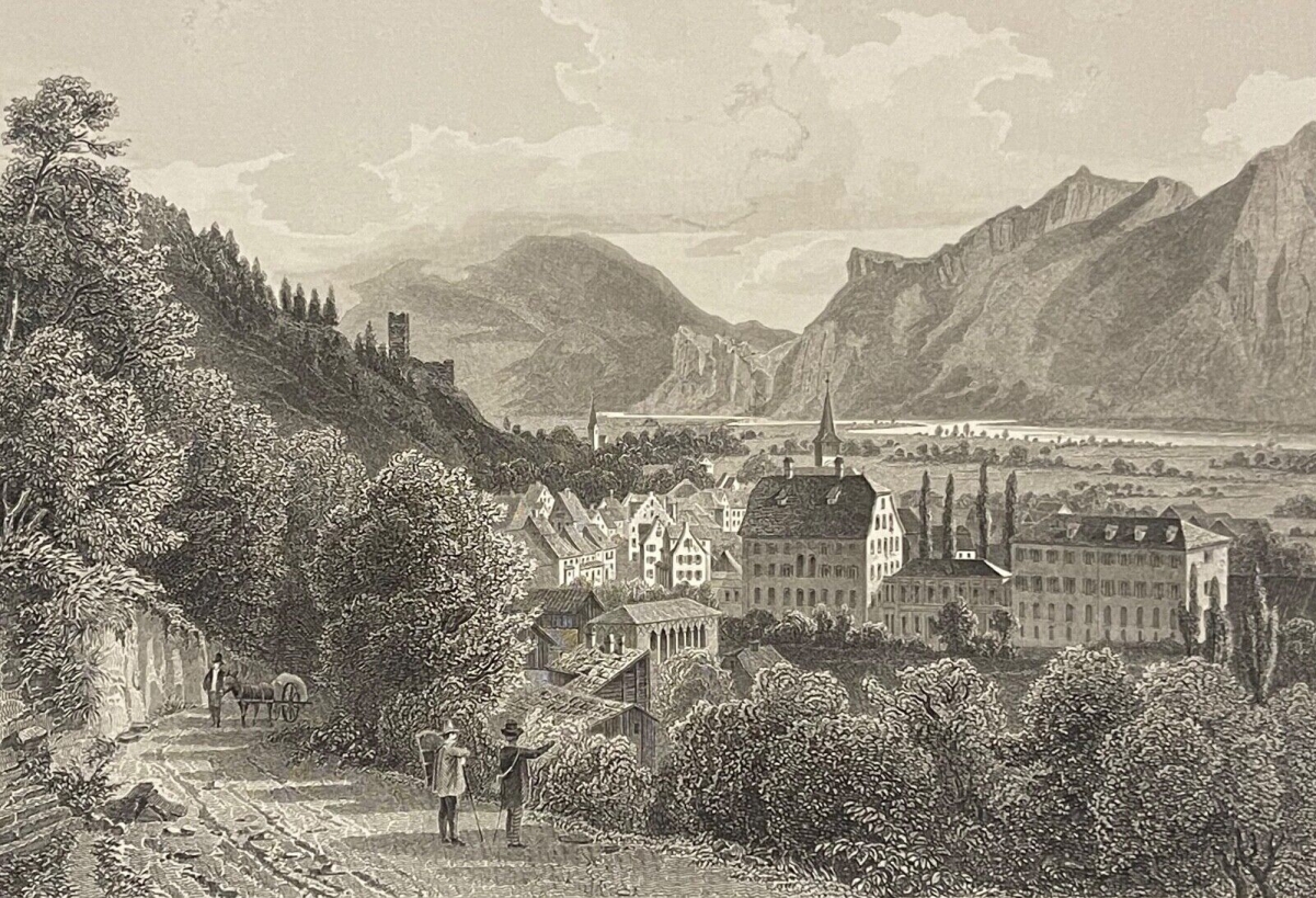 Pfäffers village et cloître lithographie vers 1850 Suisse canton de Saint-Gall Je vous propose cette gravure originale vers 1850. La feuille fait 24,8 cm par 16,3 cm, ...