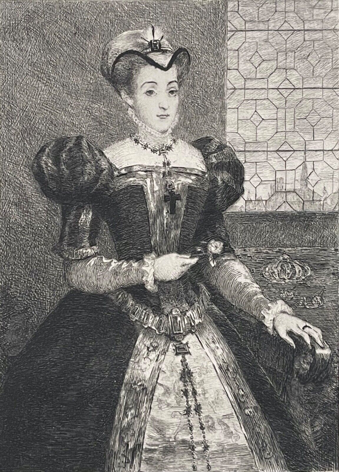 Artculture6 vous propose cette gravure en pointe sèche du XIXe siècle, vers 1870, représentant Marie Stuart ou Marie 1er d'Écosse, fille de Jacques V et de Marie de Guise née au Palais se Linlithgow (Écosse) le 8 décembre 1542, reine d'Écosse du 14 décembre 1542 au 24 juillet 1567, mariée à François II de France elle fut reine de France du 10 juillet 1559 au 5 décembre 1560. Elle meurt exécutée sur l'ordre de la reine Élisabeth 1er le 8 février 1587 au Château de Fotheringhay Angleterre. Dimensions de la feuille: 30,2 cm par 24,7 cm. La gravure seule fait : 25 cm par 19,5 cm. Dimensions de la feuille: 19,9 cm x 14,3 cm Dimensions de la gravure seule: 14,8 cm x 10,8 cm . Superbe.