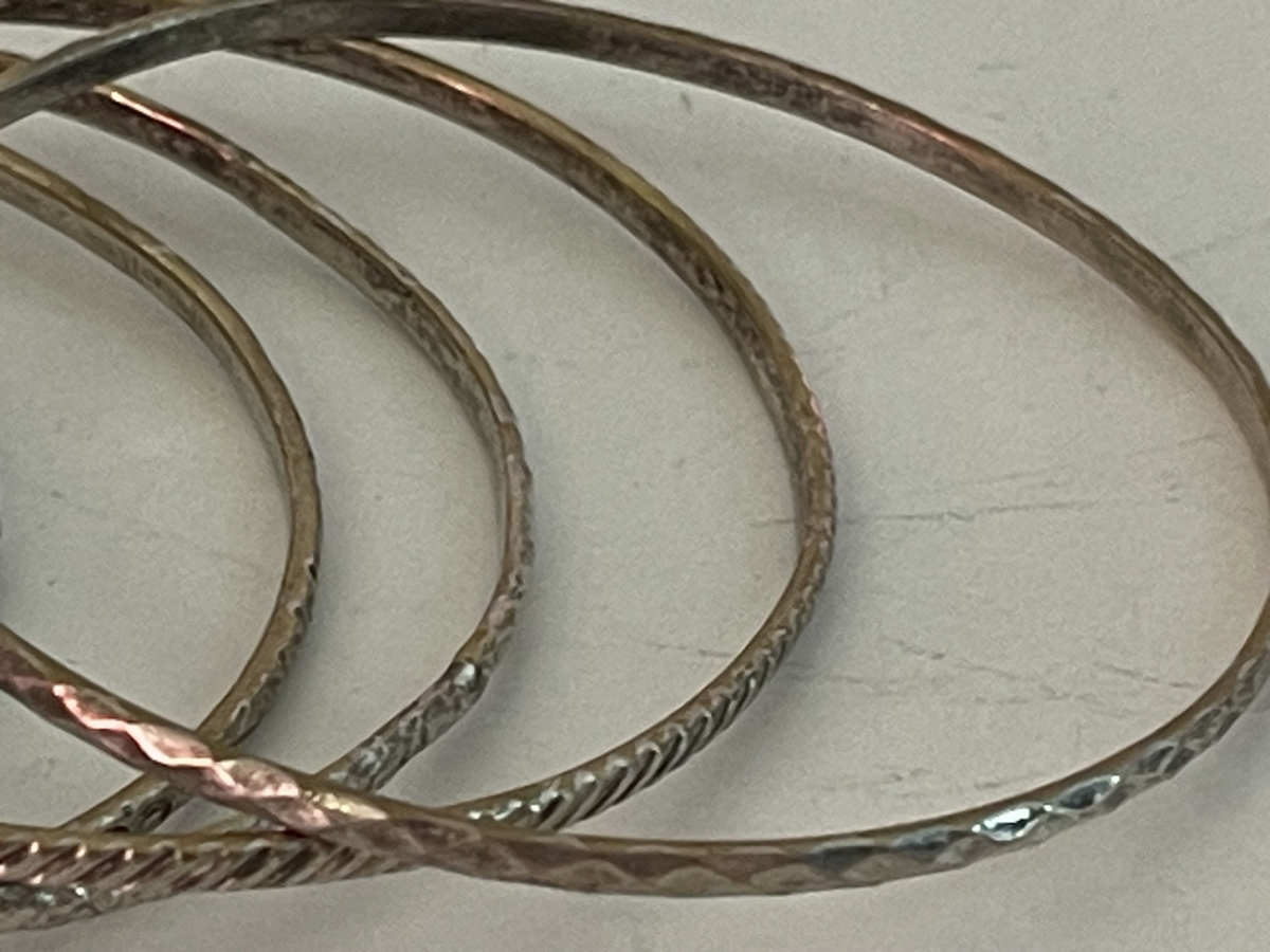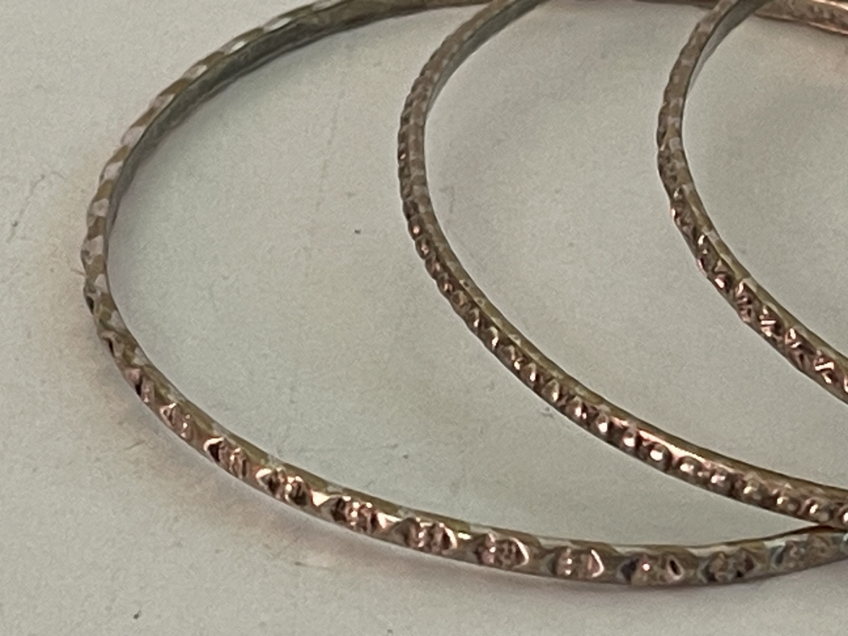 Réunis ils font une longueur sur le bras de 2 cm, diamètre interne 6,7 cm. Poids total : 42 grammes.