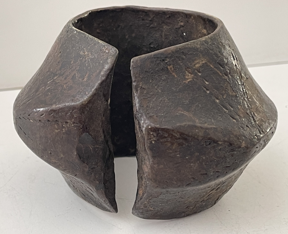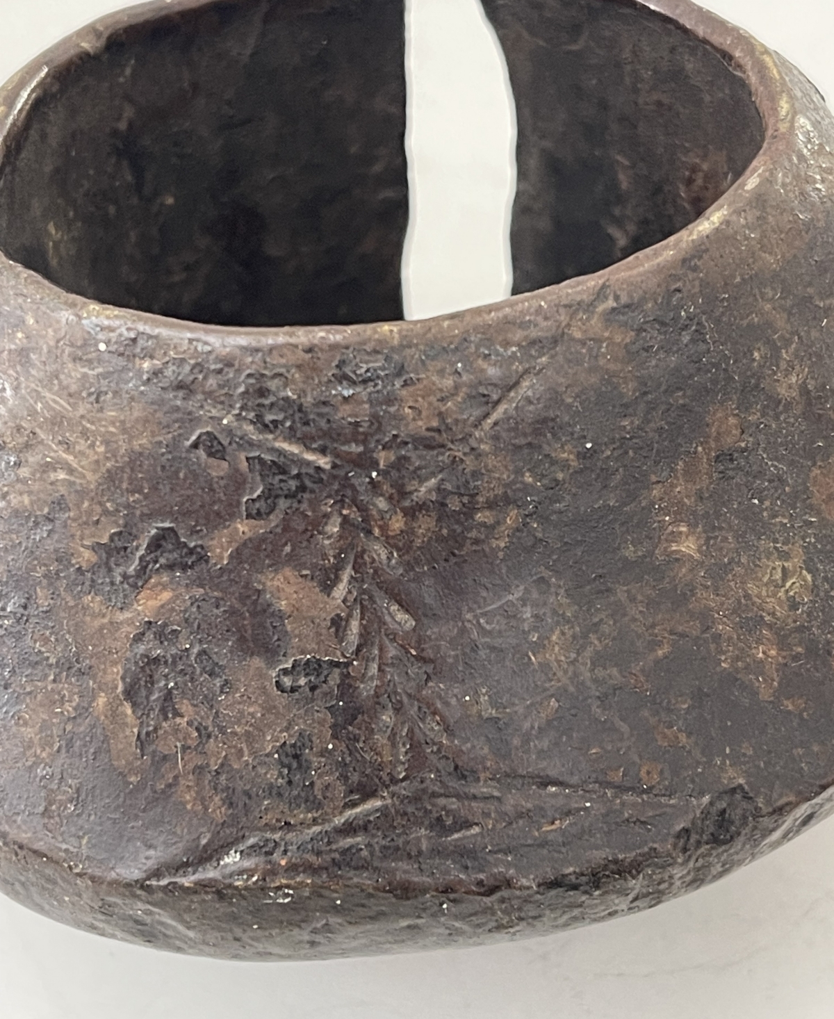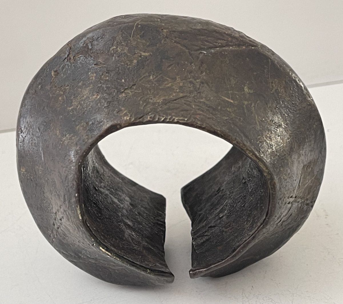 Massif bracelet-monnaie biconique à large ouverture frontale, décoré de chevrons et arêtes triangulées typiques des populations Dan. Ces lourds bracelets, véritables lingots de bronze portables, servaient de monnaie d'échange à forte valeur, de dot matrimoniale ou de réserve de richesse. La pièce présente une patine ancienne brun-noir et les traces d'outils traditionnels. Objet authentique, rare en cette taille et ce poids.