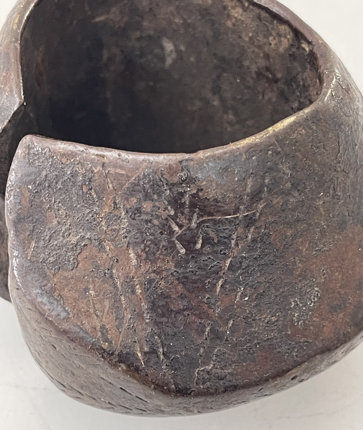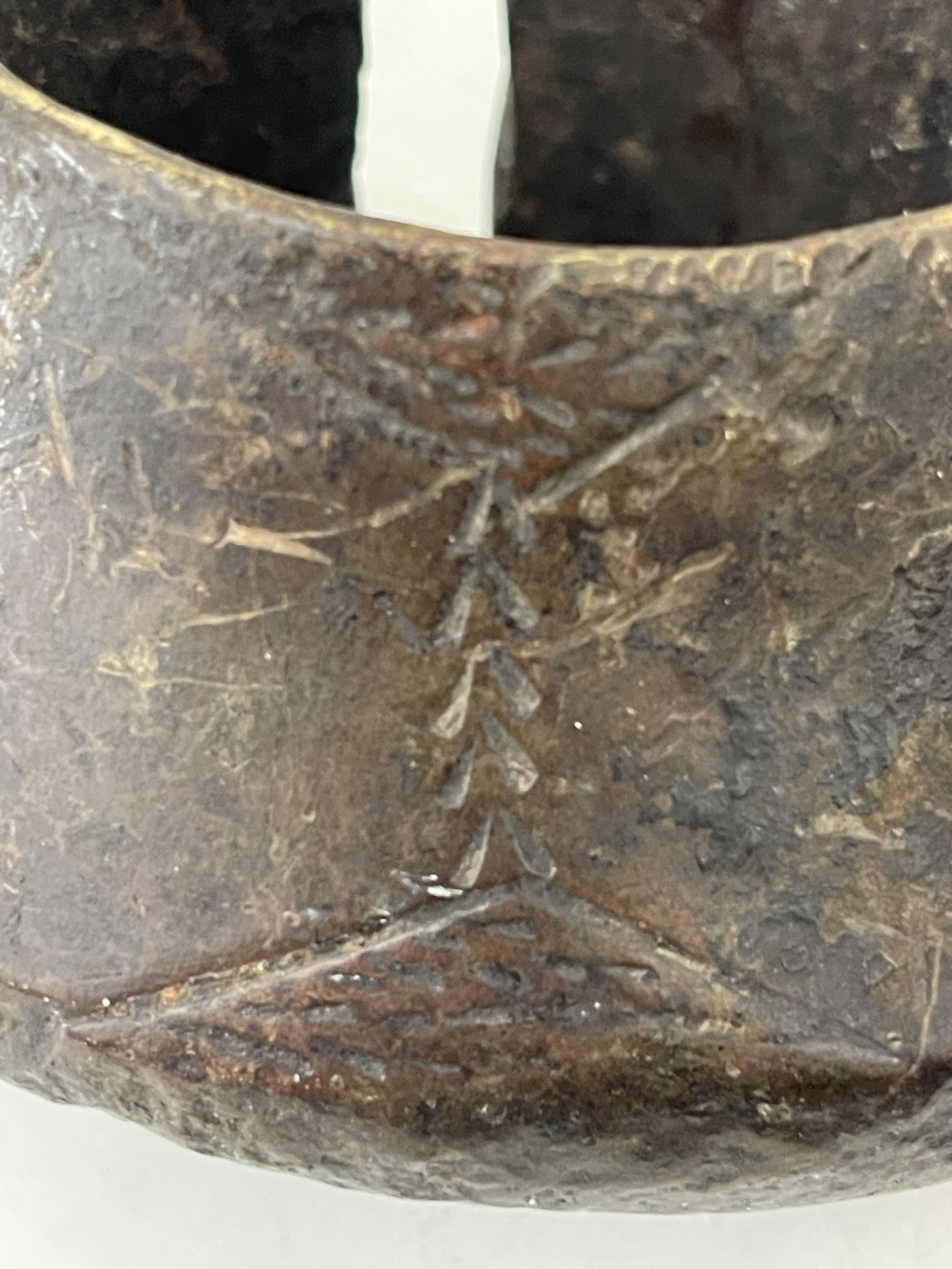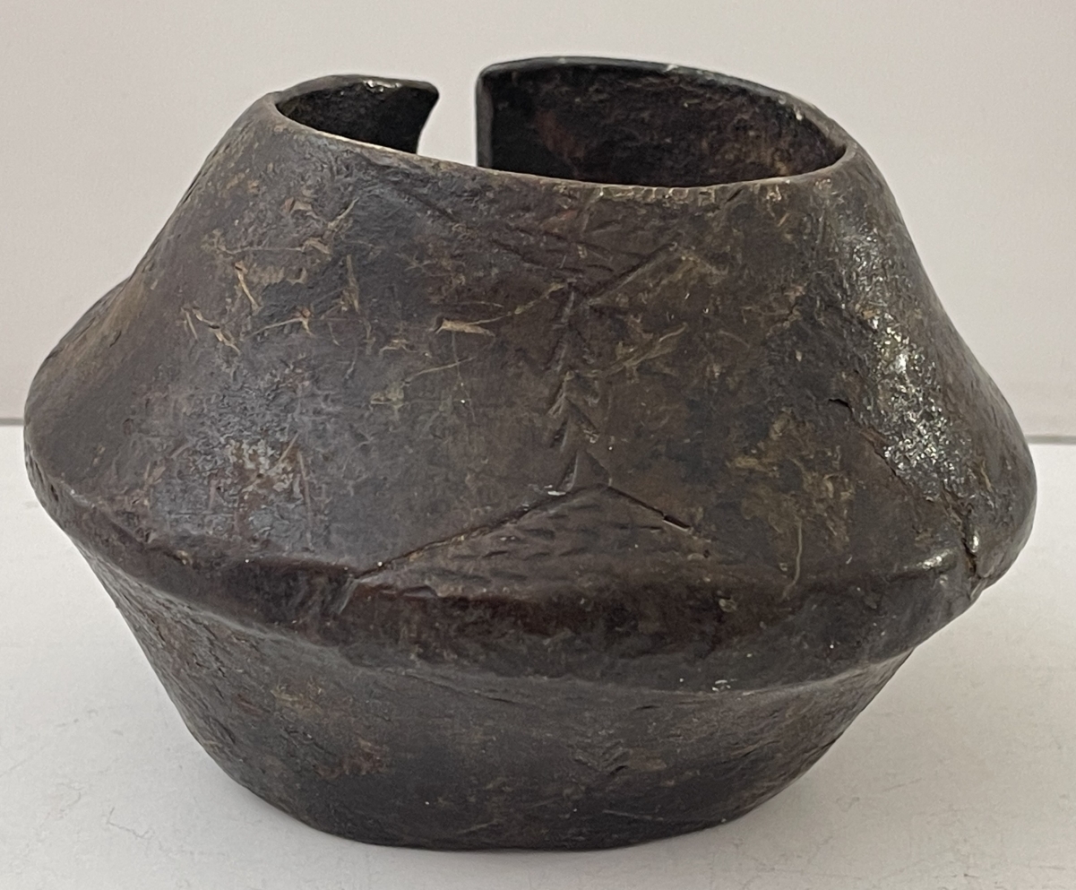 Massif bracelet-monnaie biconique à large ouverture frontale, décoré de chevrons et arêtes triangulées typiques des populations Dan. Ces lourds bracelets, véritables lingots de bronze portables, servaient de monnaie d'échange à forte valeur, de dot matrimoniale ou de réserve de richesse. La pièce présente une patine ancienne brun-noir et les traces d'outils traditionnels. Objet authentique, rare en cette taille et ce poids.