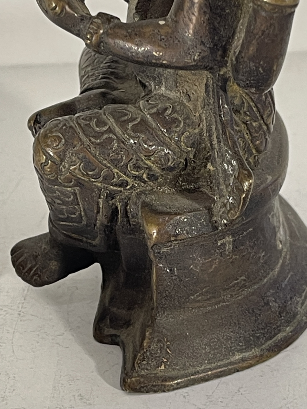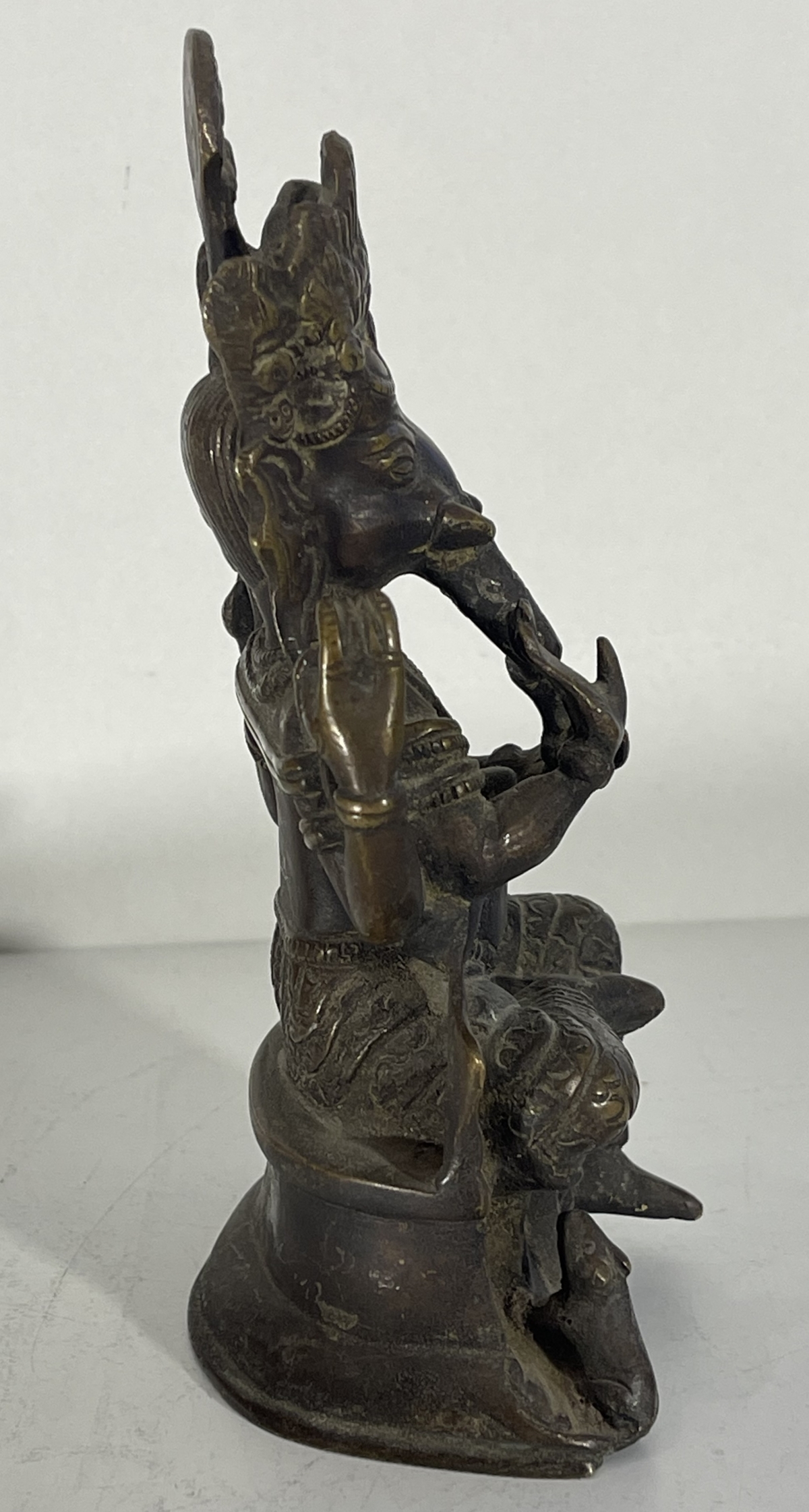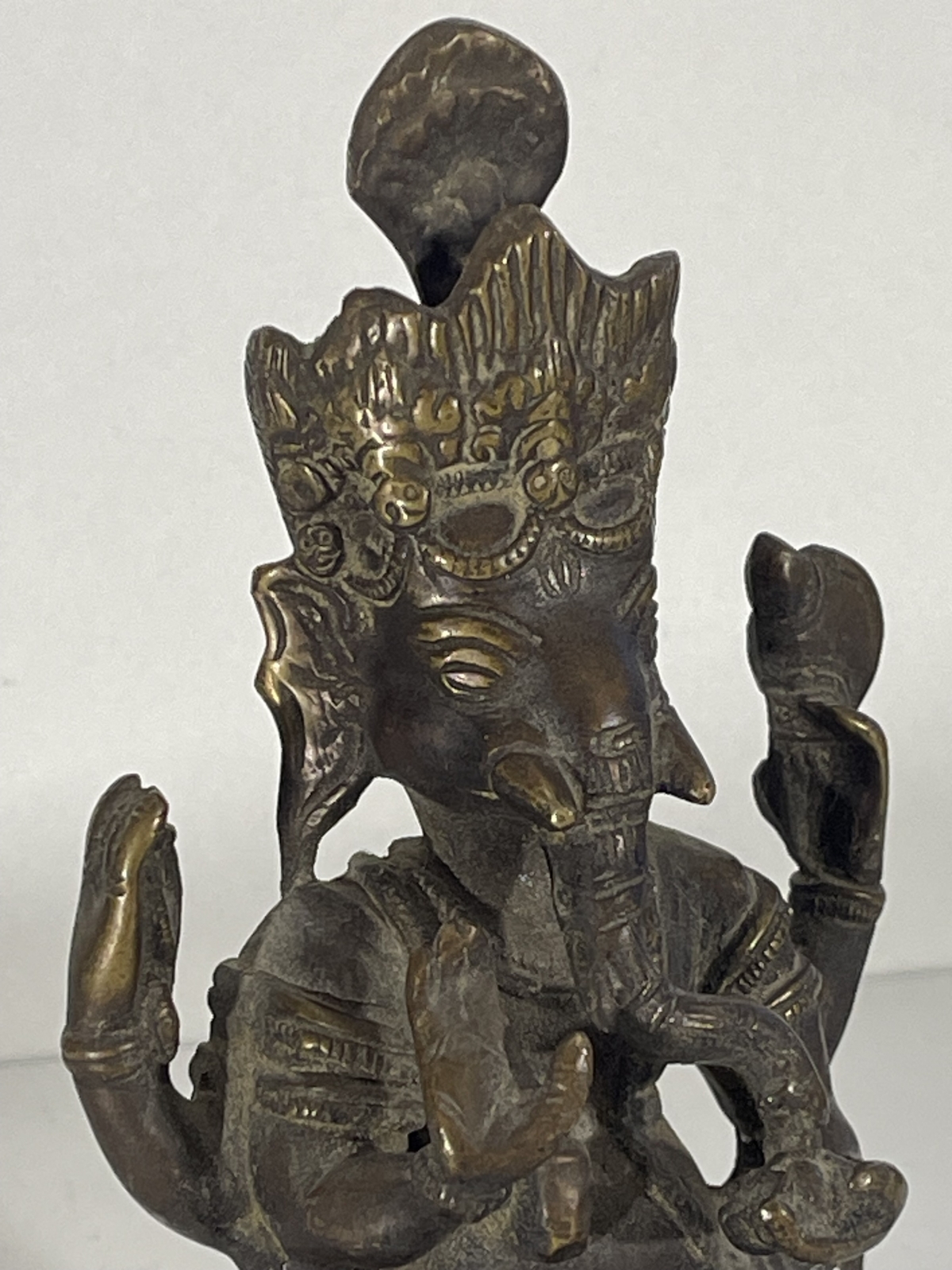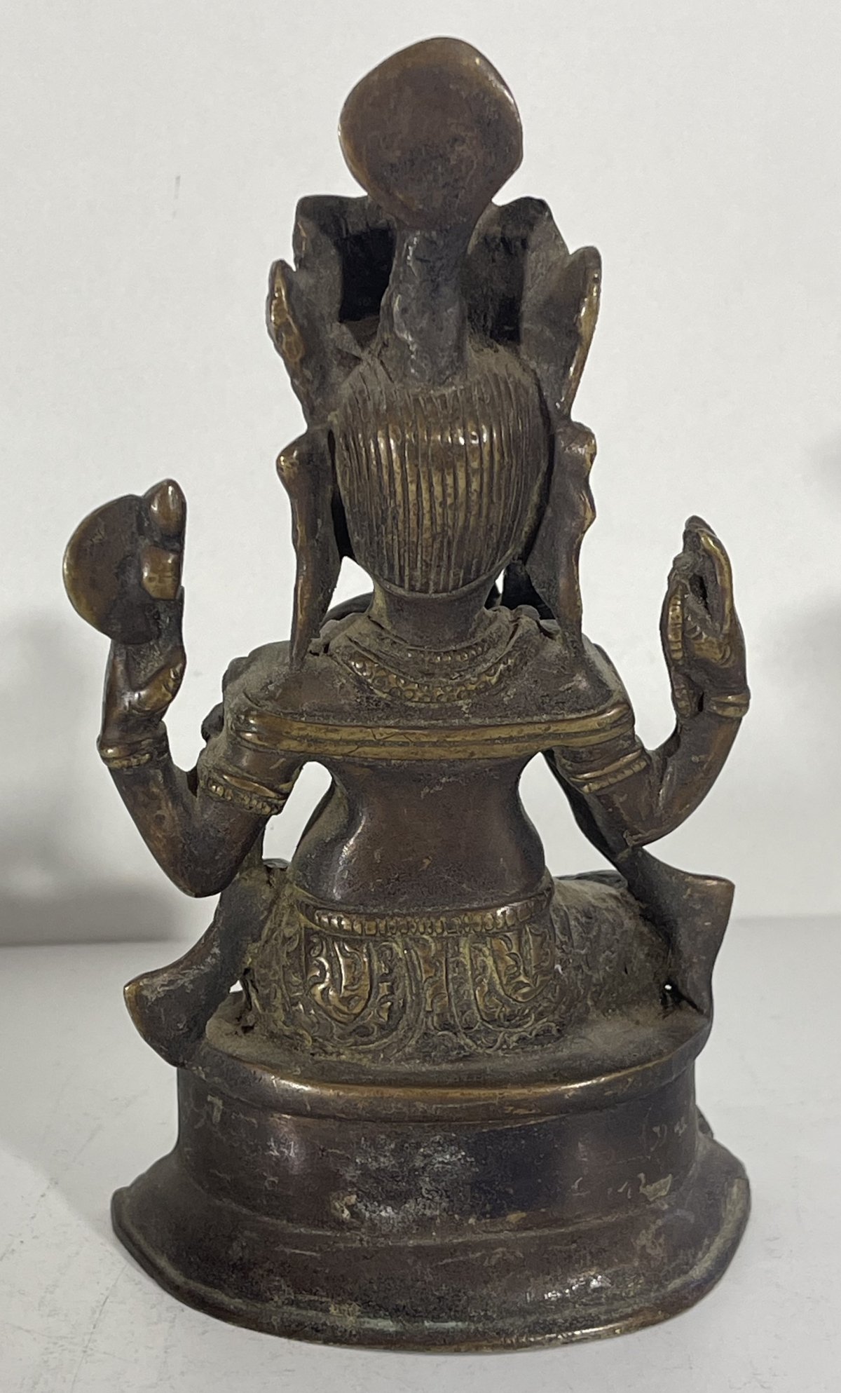 La pièce présente de beaux détails : couronne haute, quatre bras, vêtements finement gravés, position assise traditionnelle.