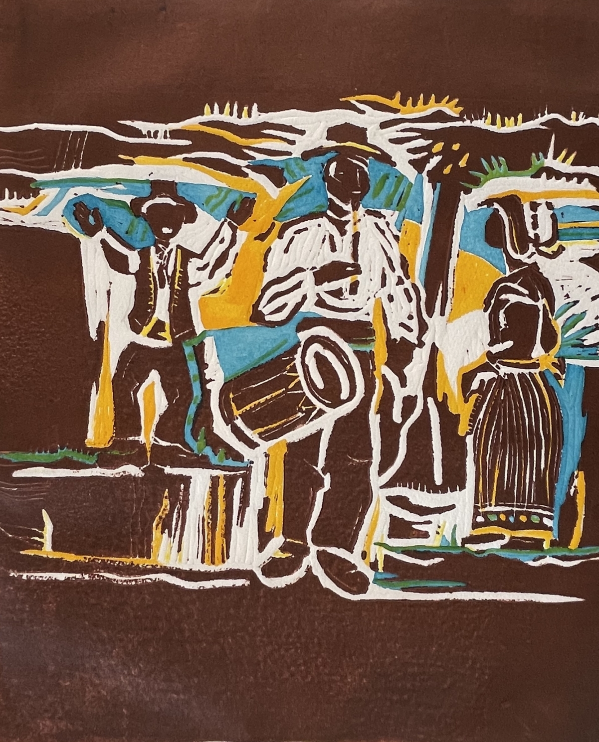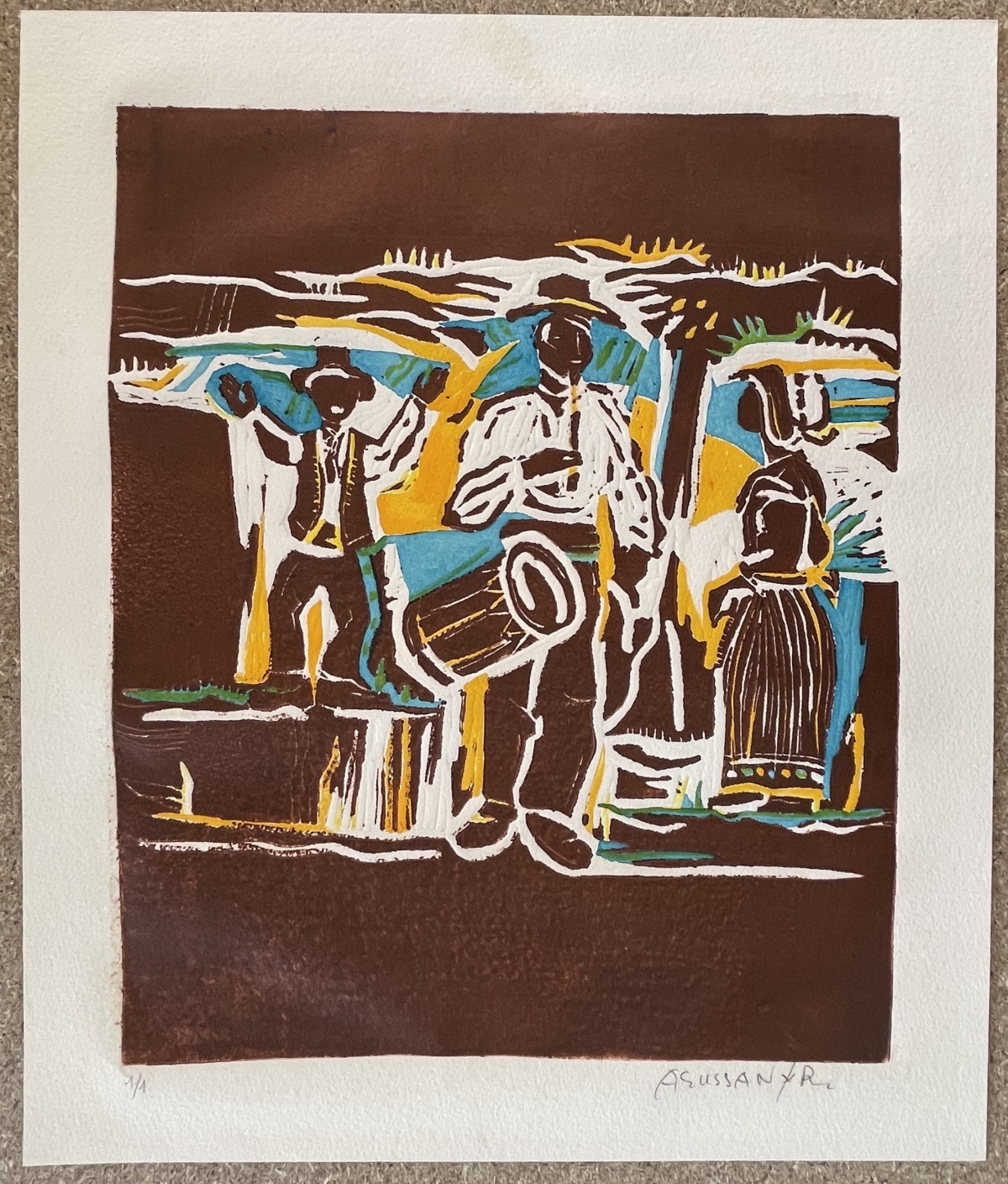 Scène animée de musiciens et danseurs en costumes, trait synthétique très graphique, rehaussé de grands aplats brun, turquoise et jaune qui donnent beaucoup de dynamisme à l'image. Tirage : numéroté 3/4 en bas à gauche, Signature : Agussan au crayon en bas à droite