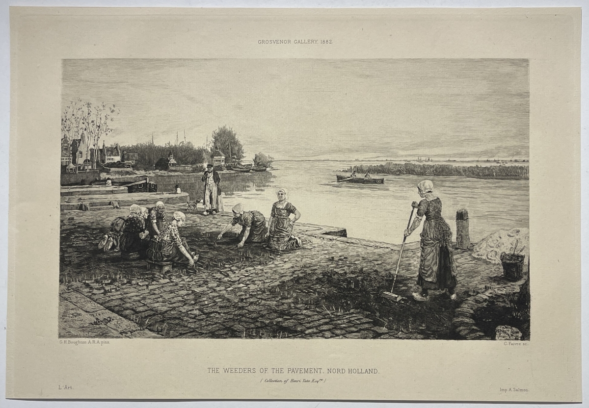 Je vous propose cette gravure en pointe sèche de 1882 d'après George Henry Boughton (1833â??1905) Les désherbeuses du pavé Hollande graveur Faivre en 1882