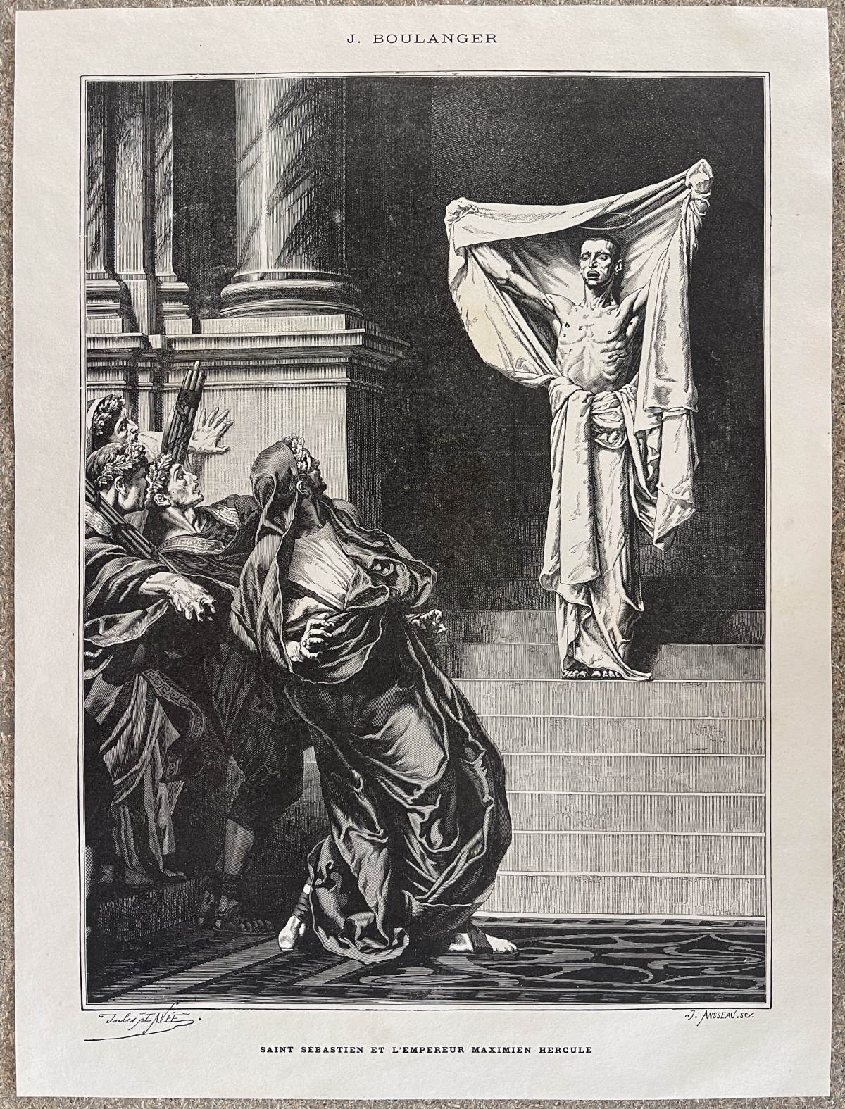 d'après un tableau de Gustave Boulanger ?? ??Saint Sébastien devant l'empereur Maximien?. Belle estampe représentant l'épisode rare où Saint Sébastien, miraculeusement survivant à son supplice, se présente de nouveau devant l'empereur Maximien Hercule et sa suite pour le réprimander publiquement. Sébastien apparaît debout, transfiguré, drapé à l'antique, tandis que l'empereur et la cour reculent avec stupeur. Composition très théâtrale, architecture monumentale et narration puissante, caractéristiques de la grande peinture d'histoire académique.