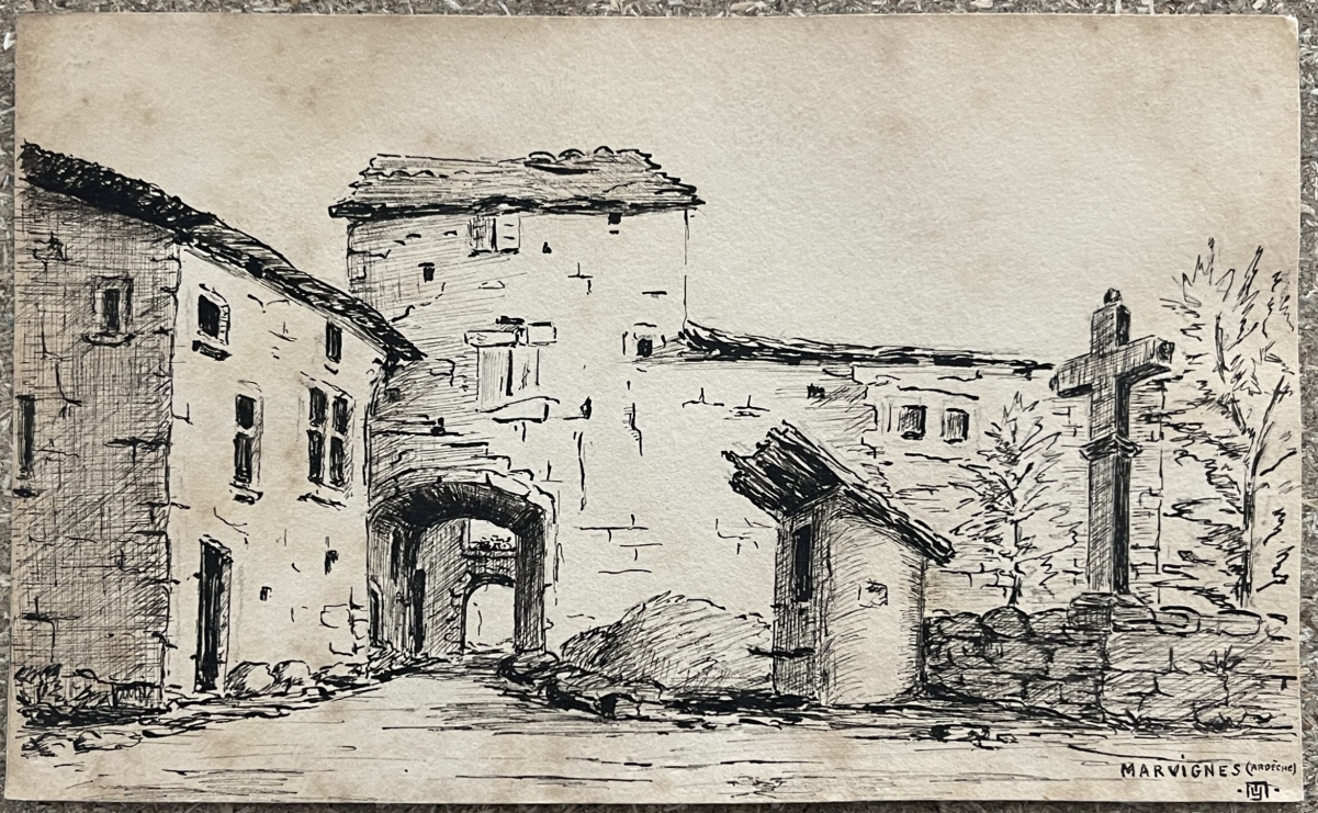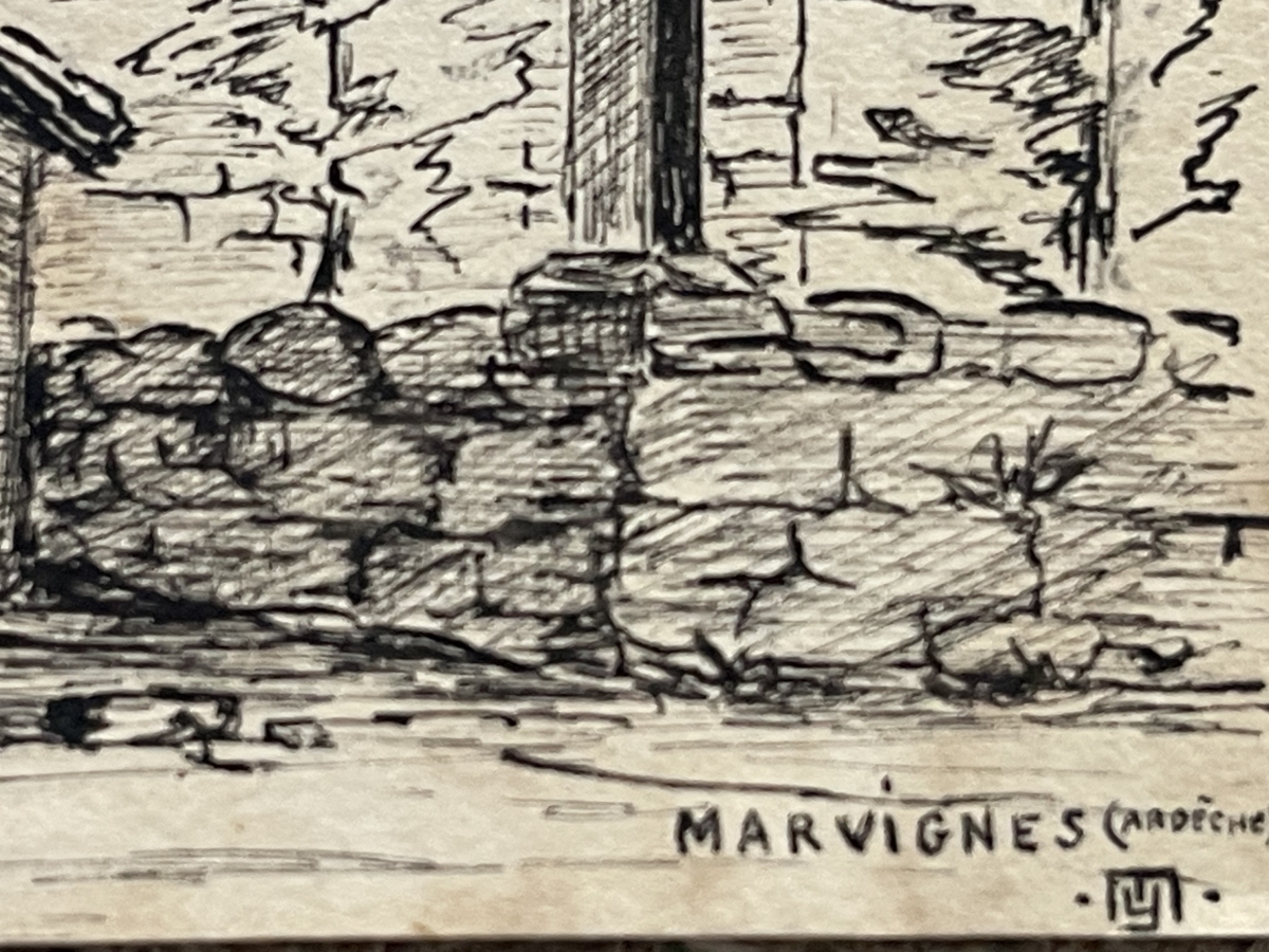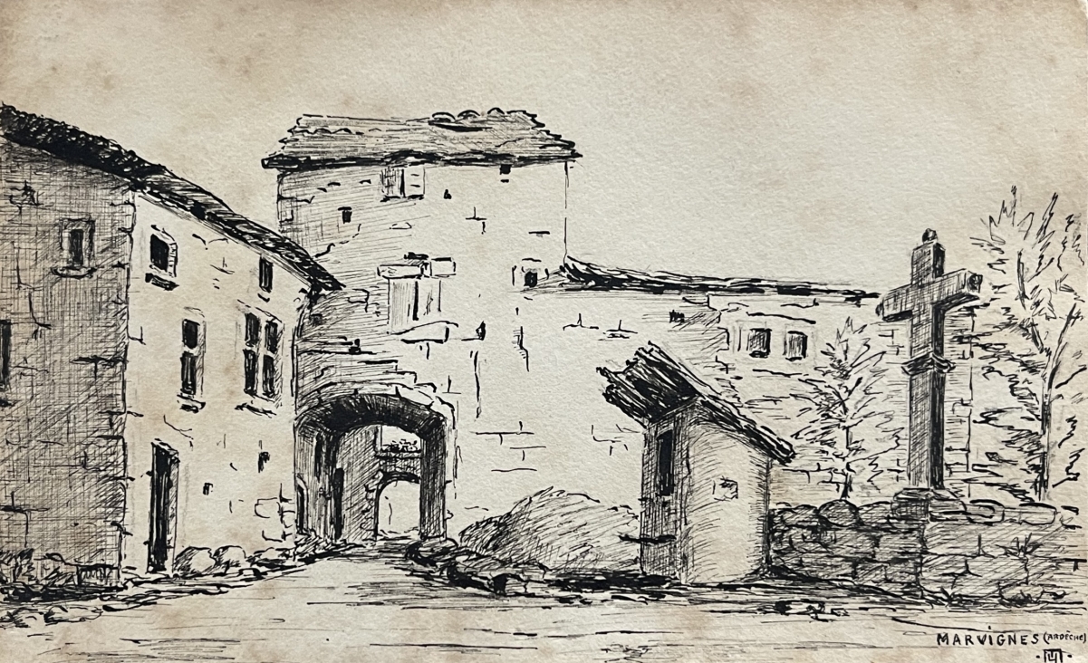 L'inscription manuscrite « Marvignes (Ardèche) » ancre clairement l'œuvre dans une démarche documentaire, faisant de ce dessin à la fois un témoignage graphique du patrimoine vernaculaire ardéchois et une étude sensible de l'architecture rurale