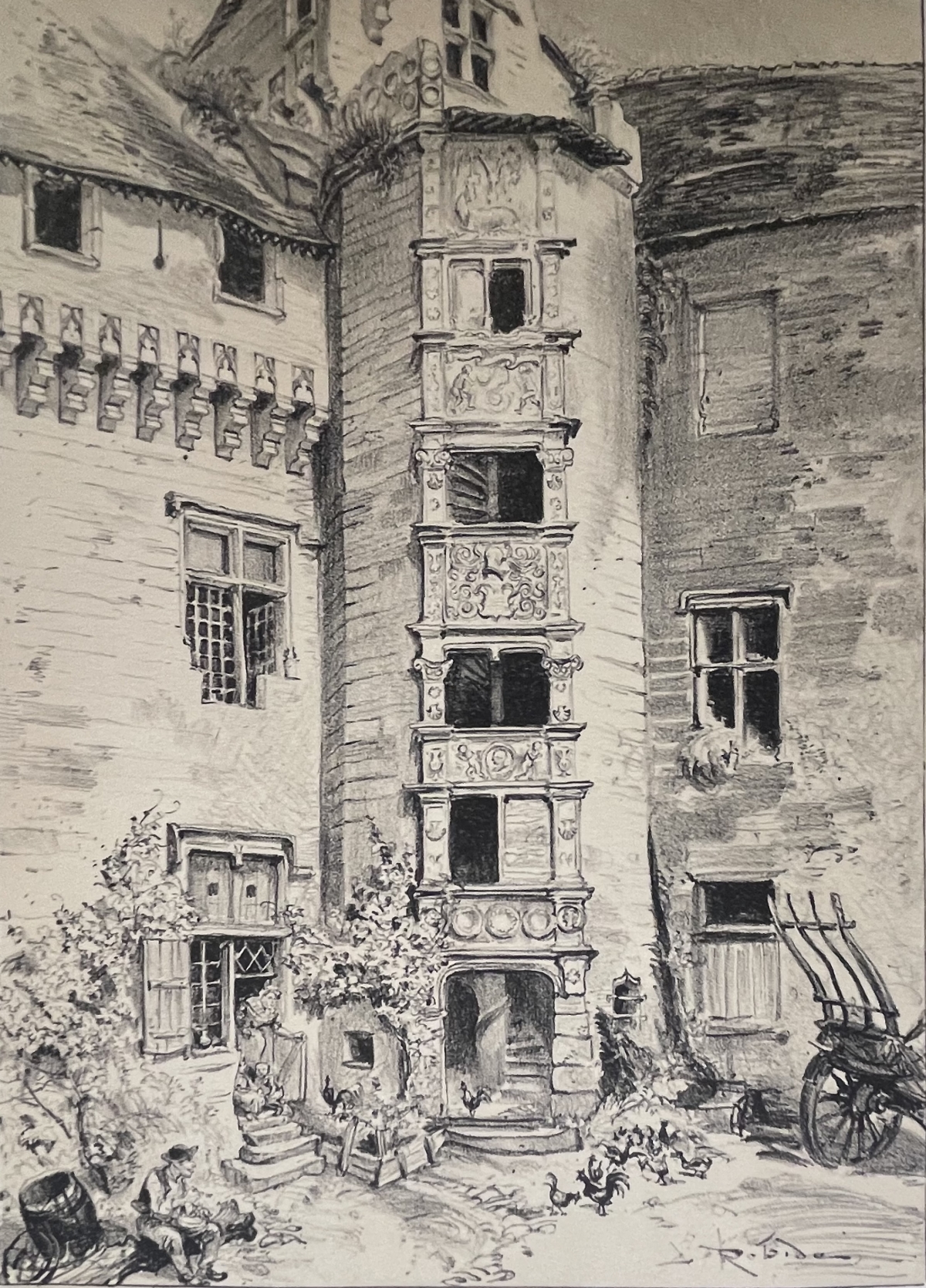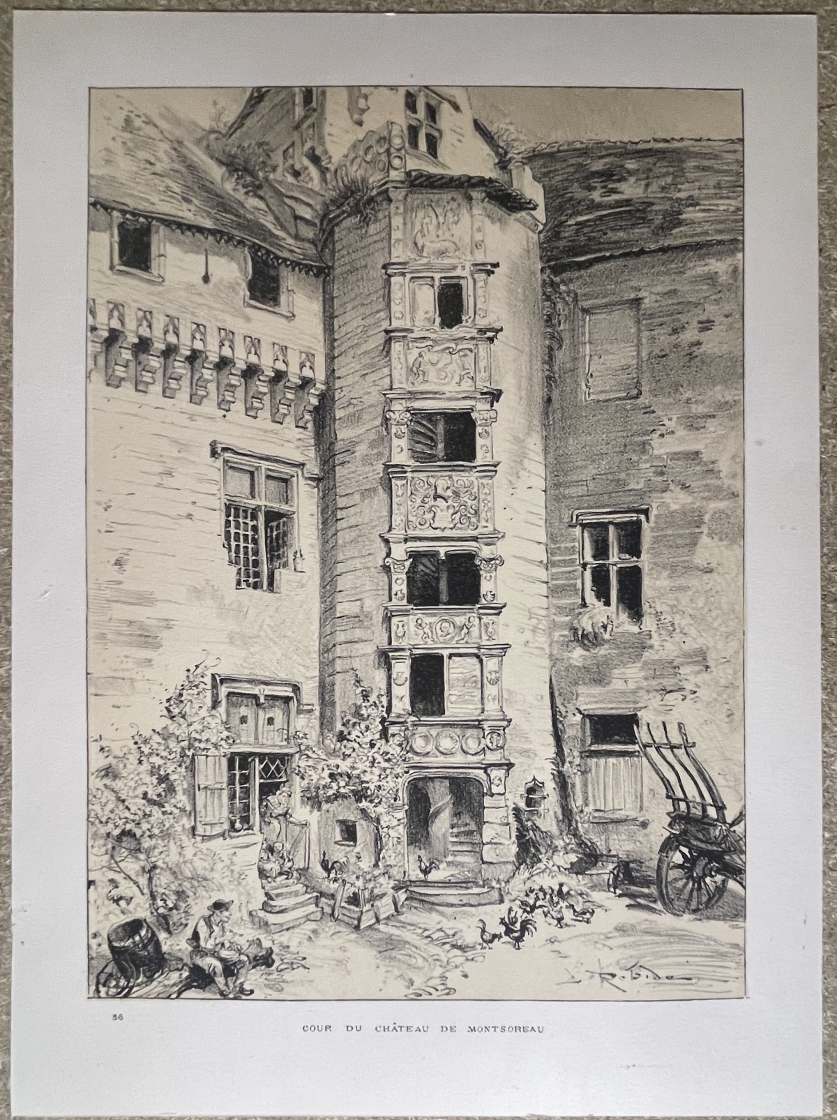 Je vous propose cette gravure vers 1891 qui représente la cour du château de Montsoreau (Maine-et-Loire). Vue intime et détaillée de l'architecture intérieure de cette demeure emblématique de la vallée de la Loire. La composition met en valeur une élégante tour d'escalier Renaissance, richement sculptée de pilastres, cartouches et motifs décoratifs, qui s'élève au centre de la cour et structure l'espace. Les façades en pierre, aux fenêtres à meneaux et aux volumes irréguliers, témoignent du raffinement architectural du château tout en conservant une atmosphère domestique et vivante.