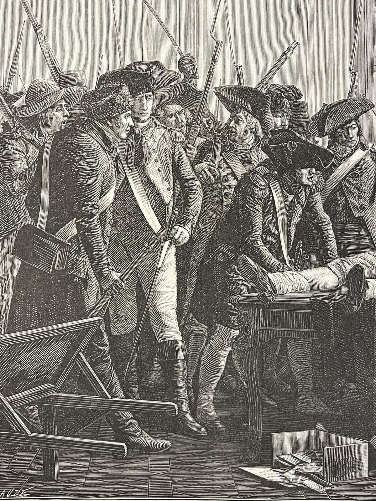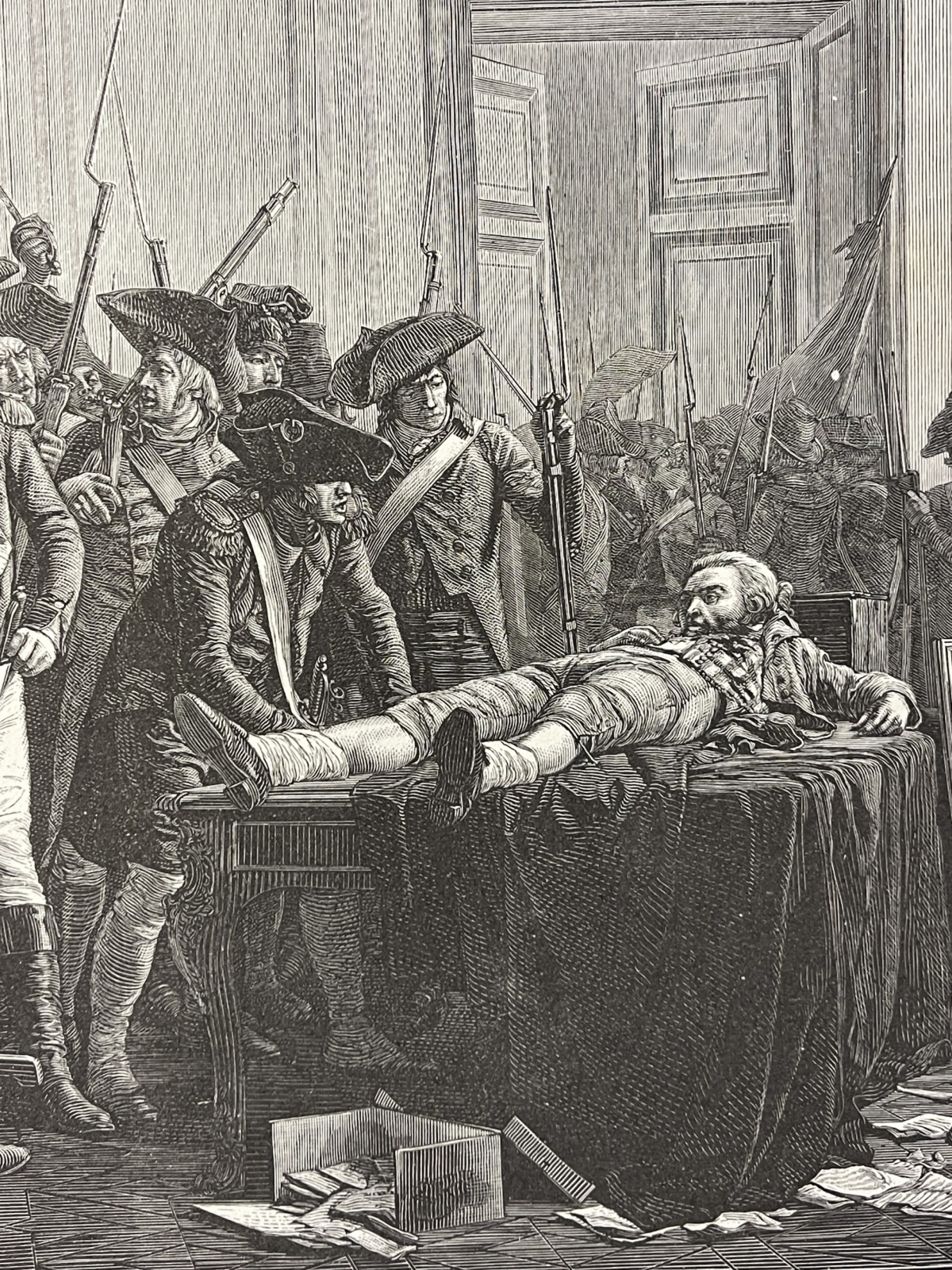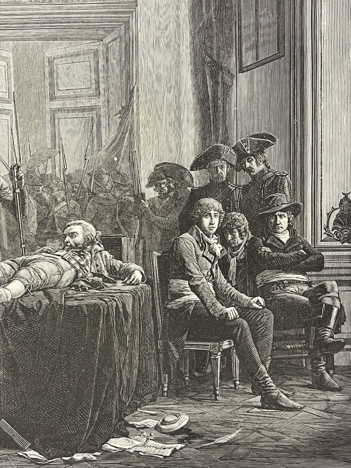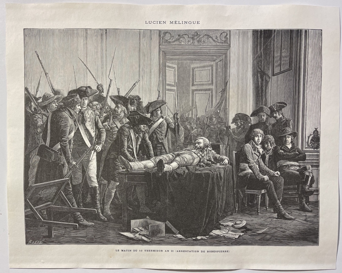 Je vous propose cette grande xylographie vers 1885 représentant l'arrestation de Maximilien Robespierre, scène historique intitulée Le matin du 10 Thermidor An II.