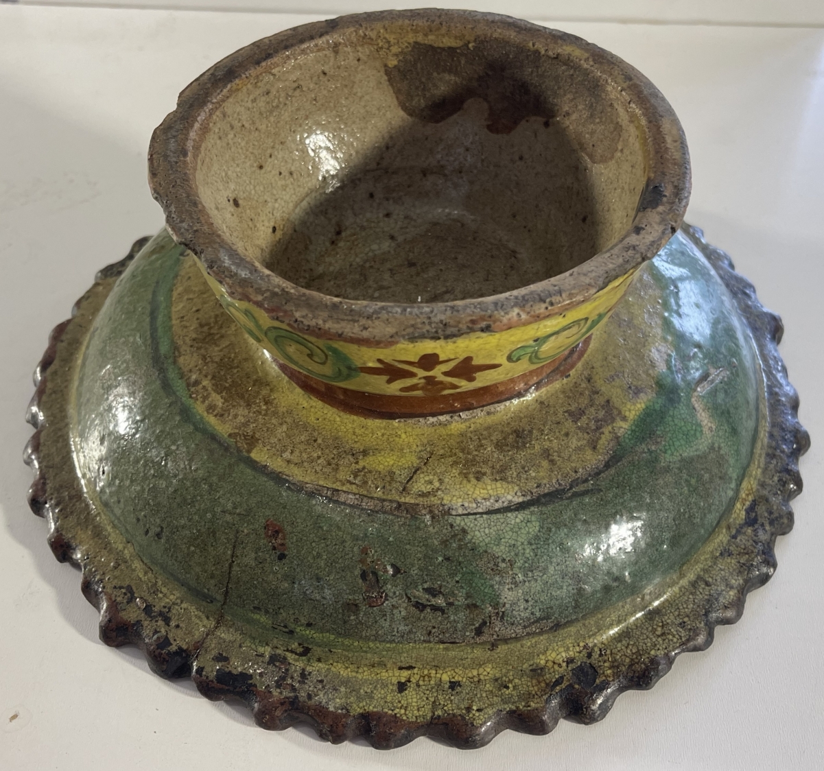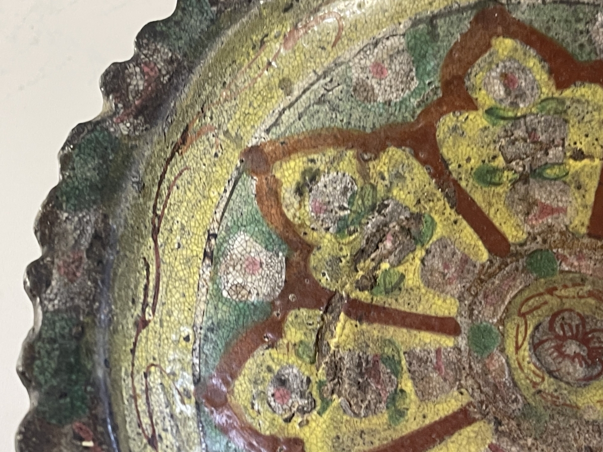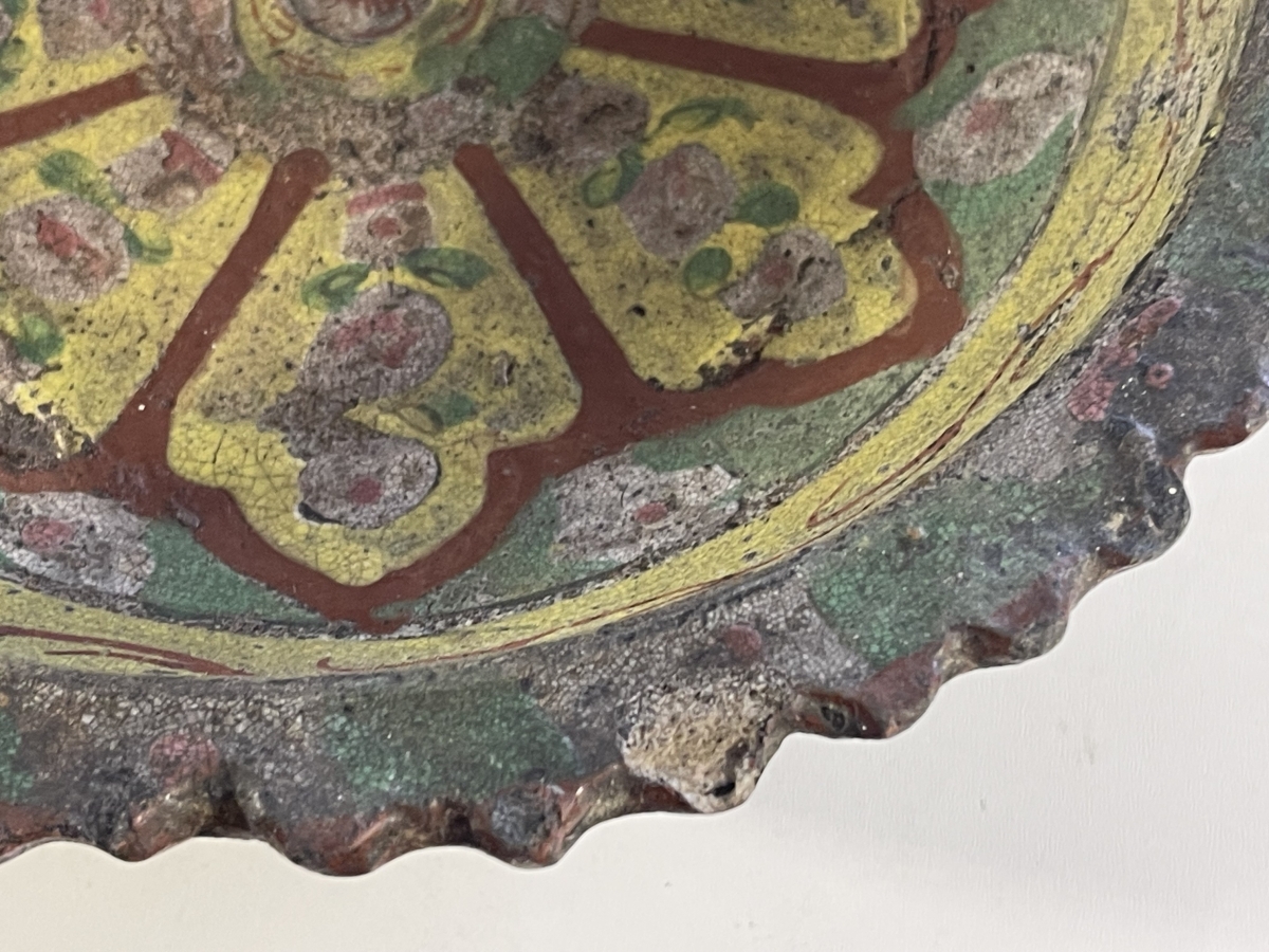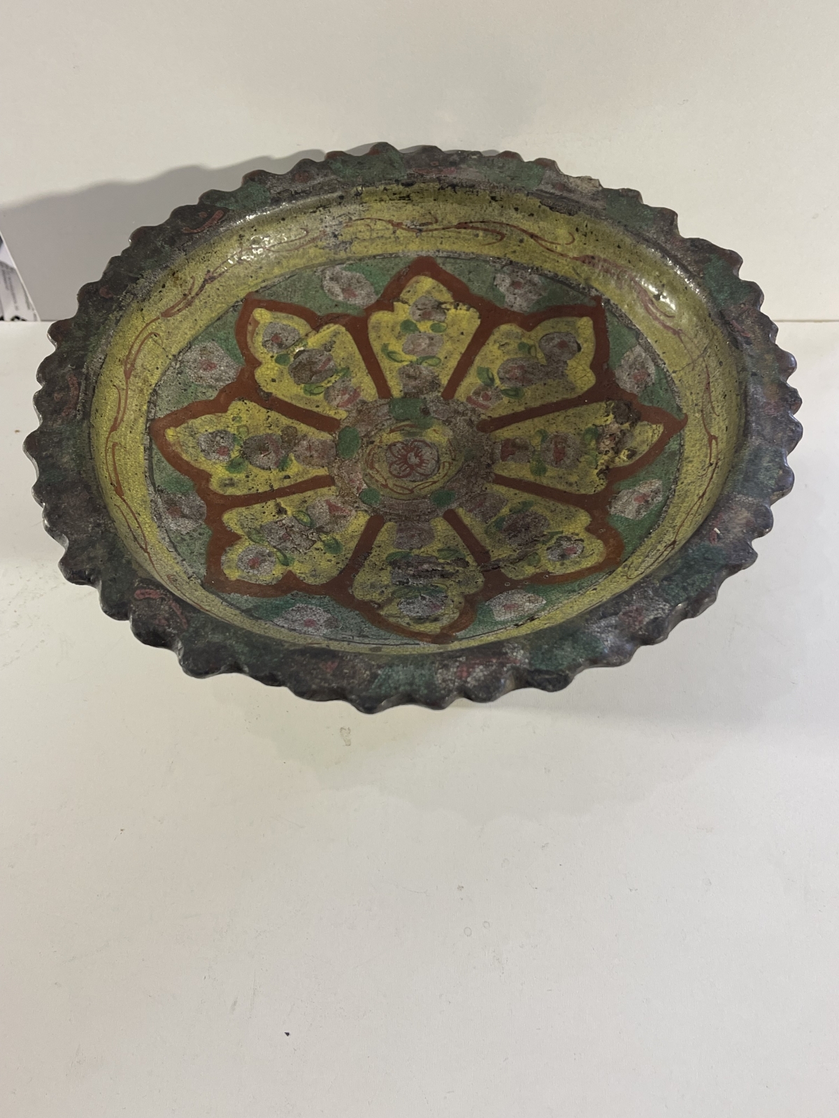Je vous propose cet ancien récipient brûleur d'encens en céramique émaillée de tradition Bencharong, attribué à la Thaïlande (Siam), période d'Ayutthaya tardive, fin XVII� ou tout début XVIII� siècle. La pièce est réalisée en terre cuite à glaçure plombifère, avec une pâte ocre visible aux zones d'usure, caractéristique des productions anciennes d'Asie du Sud-Est. Le décor polychrome, peint à la main, associe un fond jaune plomb à des motifs floraux et radiaux stylisés en brun-rouge ferrugineux, vert cuivre et rehauts clairs, organisés autour d'une rosace centrale. La bordure crénelée, volontairement irrégulière, ainsi que la forme sur piédouche évoquent un usage rituel ou palatial, probablement lié aux pratiques d'offrande ou à l'encens. L'émail présente une craquelure ancienne, des usures cohérentes sur les reliefs, des manques ponctuels et reprises naturelles liées au temps, attestant d'un âge réel et d'un usage ancien. L'ensemble est non restauré, dans son état d'origine, avec une patine ancienne homogène.