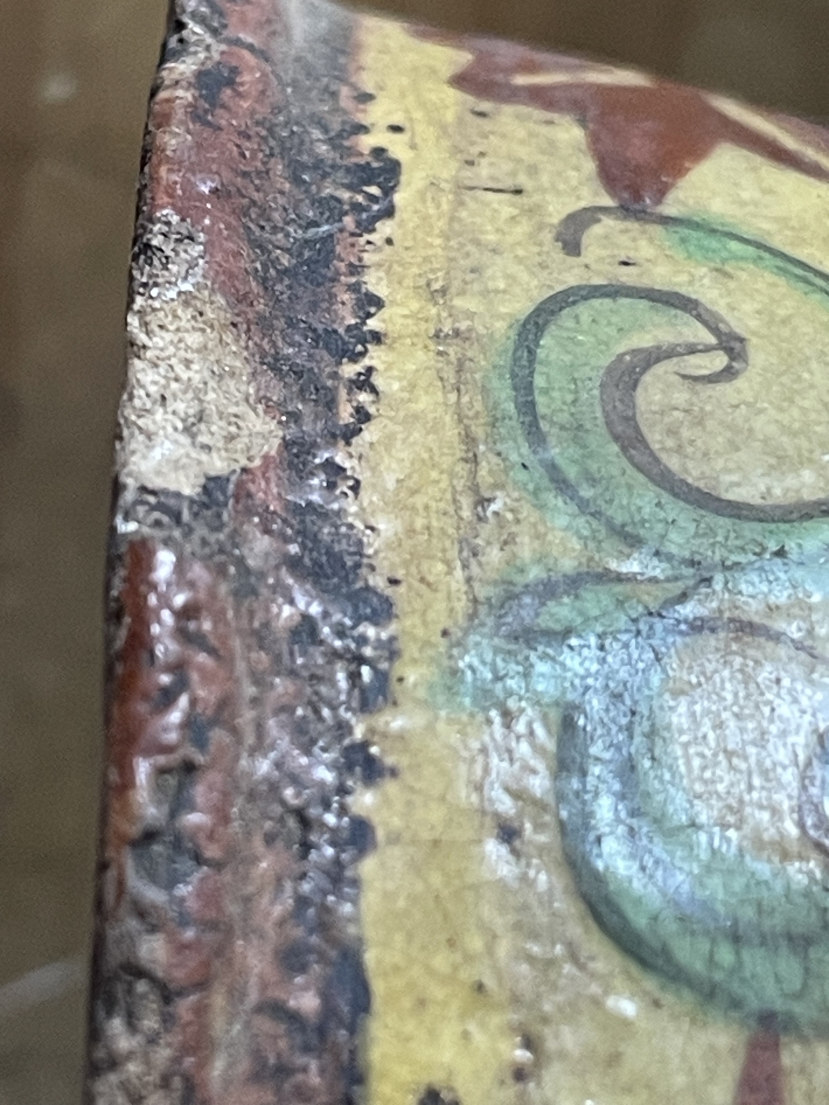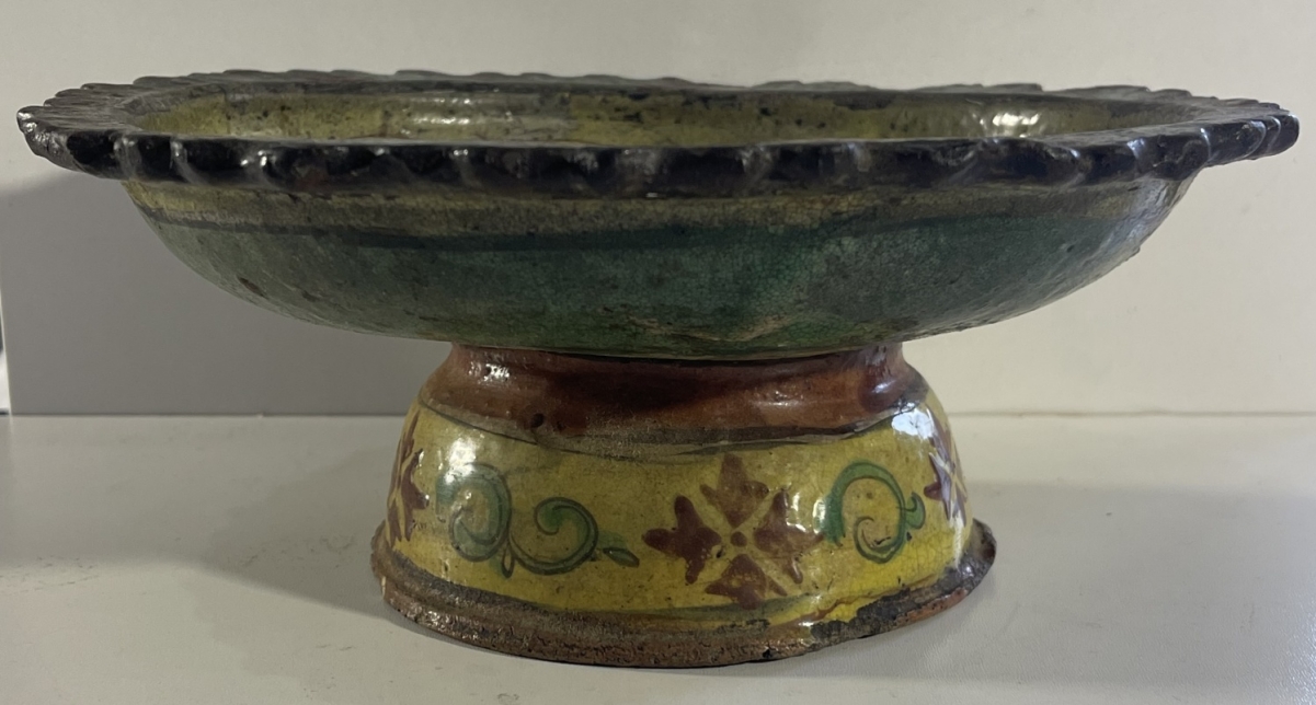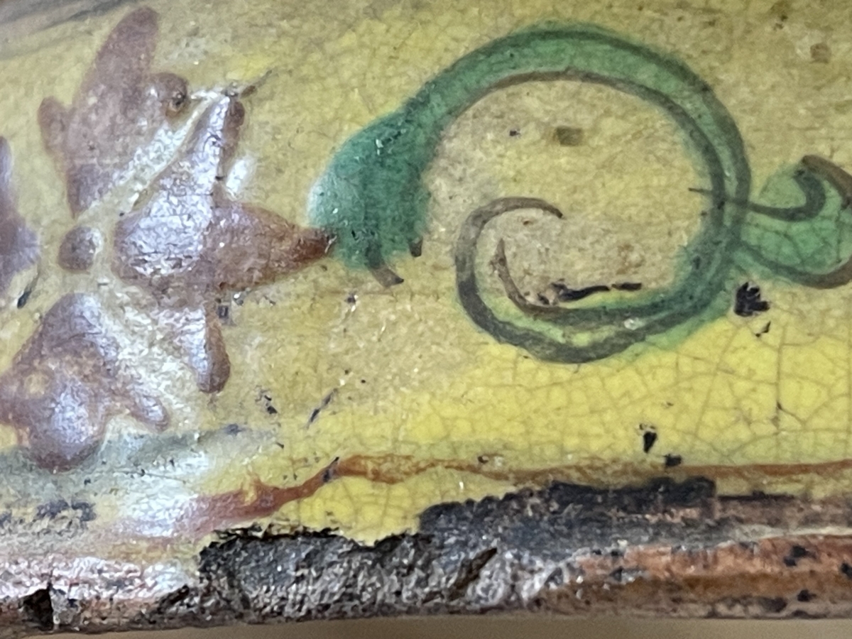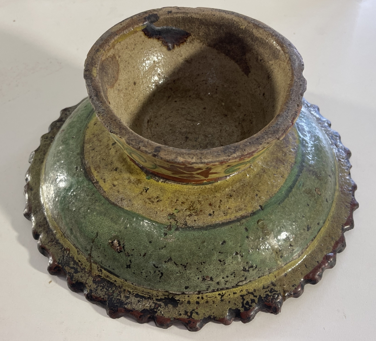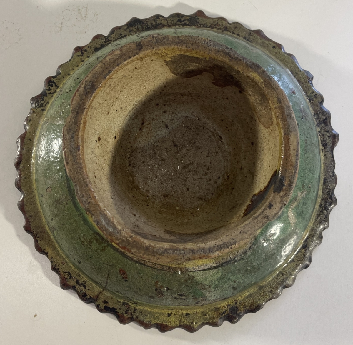Je vous propose cet ancien récipient brûleur d'encens en céramique émaillée de tradition Bencharong, attribué à la Thaïlande (Siam), période d'Ayutthaya tardive, fin XVII� ou tout début XVIII� siècle. La pièce est réalisée en terre cuite à glaçure plombifère, avec une pâte ocre visible aux zones d'usure, caractéristique des productions anciennes d'Asie du Sud-Est. Le décor polychrome, peint à la main, associe un fond jaune plomb à des motifs floraux et radiaux stylisés en brun-rouge ferrugineux, vert cuivre et rehauts clairs, organisés autour d'une rosace centrale. La bordure crénelée, volontairement irrégulière, ainsi que la forme sur piédouche évoquent un usage rituel ou palatial, probablement lié aux pratiques d'offrande ou à l'encens. L'émail présente une craquelure ancienne, des usures cohérentes sur les reliefs, des manques ponctuels et reprises naturelles liées au temps, attestant d'un âge réel et d'un usage ancien. L'ensemble est non restauré, dans son état d'origine, avec une patine ancienne homogène.