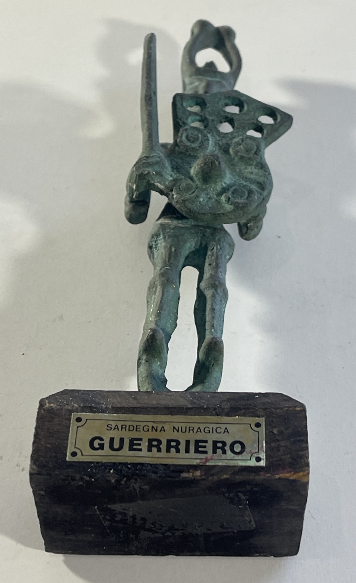Petite sculpture en bronze représentant un guerrier nuragique de Sardaigne, inspirée des célèbres bronzetti nuragici, statuettes votives produites par la civilisation nuragique entre le IX� et le VII� siècle av. J.-C. Ces figures stylisées représentent généralement des guerriers, chefs ou personnages mythiques tenant armes et boucliers.